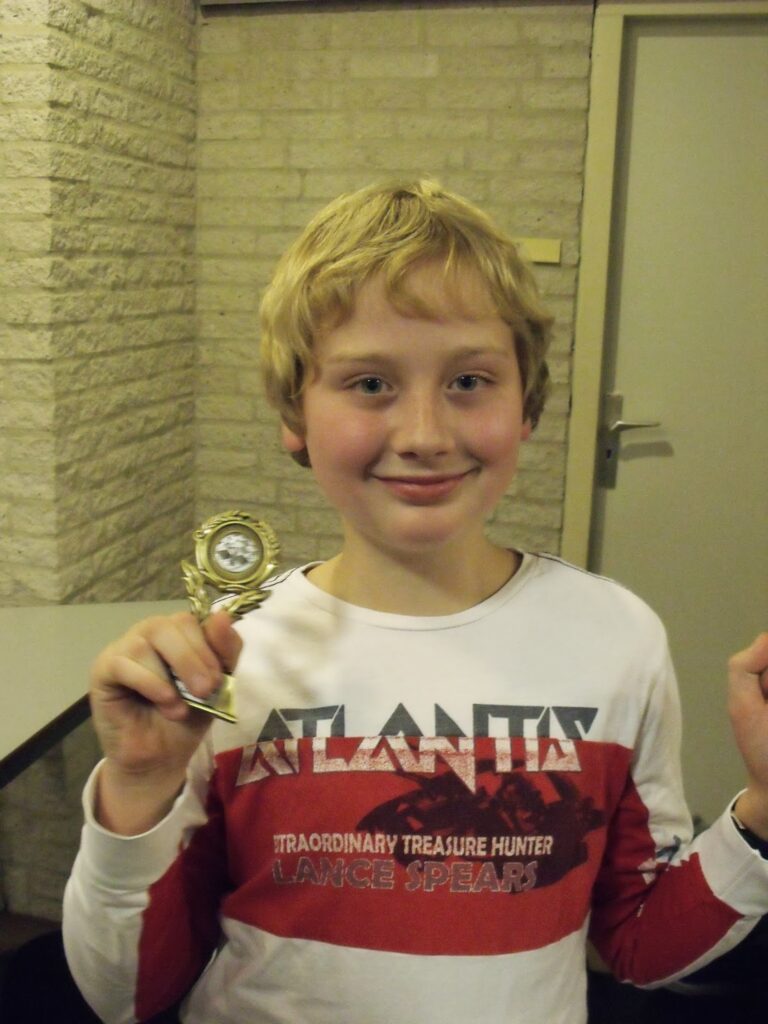 Martijn speelde in groep G, ook wat te hoog. Hij begon gelijk heel goed door te winnen. Hij schaakte vanmiddag heel goed en verloor maar 2 partijen. Bij het ingaan van de laatste partij ging hij voor de 2de of de 3de plek en moest dan ook winnen. Dat deed hij en tot zijn verbazing verloor de jongen die op 1 stond. Hierdoor waren er meerdere kinderen met 5 punten. Op onderling resultaat werd Martijn 1ste!