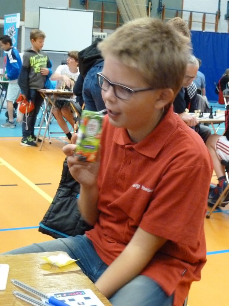 En tenslotte het eetmoment op zaterdag. Het toernooi was afgesloten. De familie Noordenbos en De Goede waren inmiddels richting huis vertrokken. In afgeslankt gezelschap hadden we wat te vieren: Daan met een zevende prijs, Jonas, die inmiddels helemaal opgenomen was in de groep, eerste! En een geslaagd toernooi voor eigenlijk al onze deelnemers, was het niet in punten, dan in ieder geval in prachtige partijen. Onze campingpannen waren ontoereikend om te koken voor het gezelschap dat die avond mee zou eten en de Chinees was dichtbij… De families Berghuis en Koning sloten zich erbij aan, er werd bier en wijn meegebracht en de ontlading van de jeugd nu het toernooi erop zat maakte het geheel tot een zeer gezellige afsluitende avond.