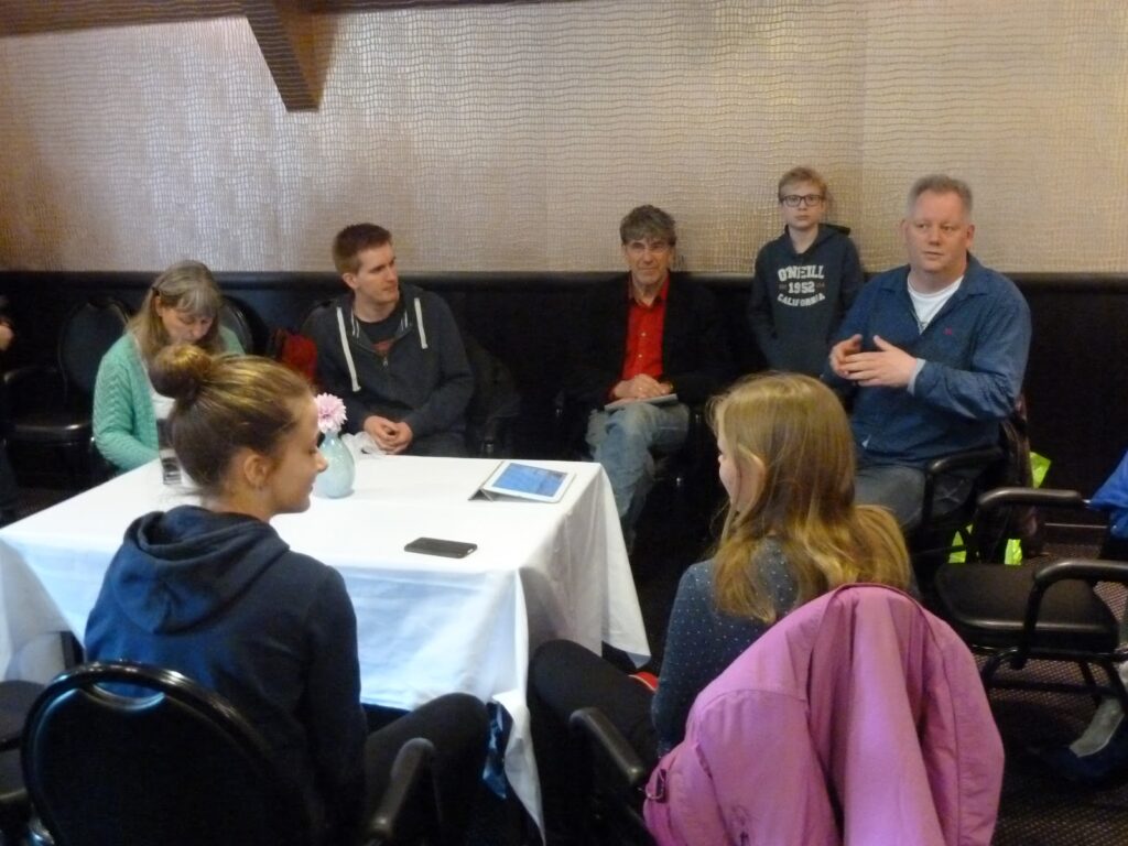 Ilja (linksvoor op de rug) en Gerrit (rood shirt) op bezoek