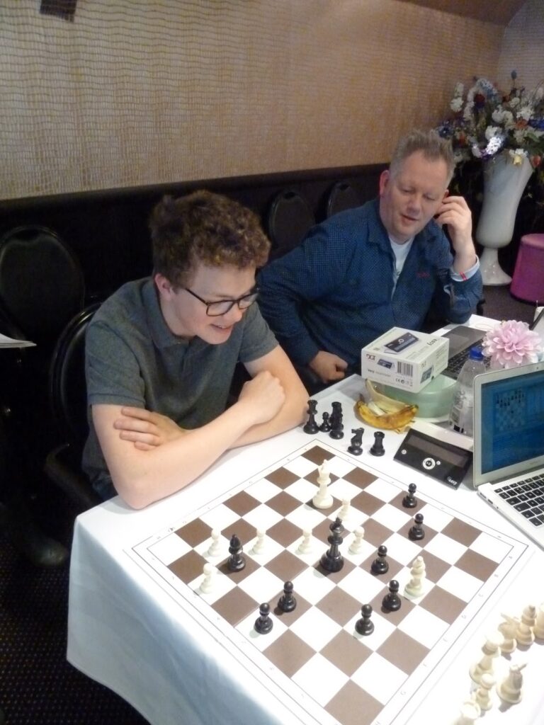 Gisteren was Daan voor de tweede keer op bezoek. Hij leeft erg mee. Jonas wordt goed gevolgd. Gisteren verloor Jonas de eerste partij en ging de tweede partij langs grote hoogten en diepe hoogten om uiteindelijk het punt te bemachtigen. Het was voor de kiebitzers af en toe nagels bijten in de Ivory Room.