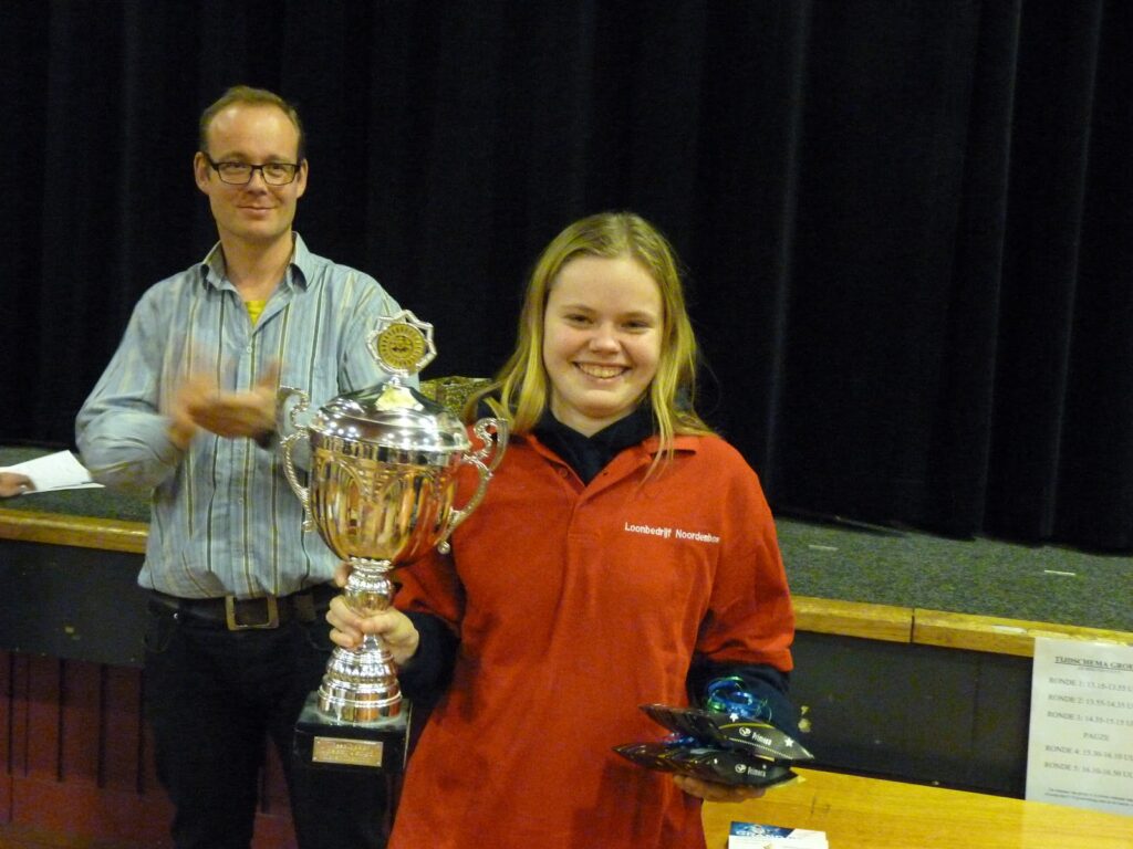 Voor onze meiden een zware handicap, want beiden zijn geen snelschakers. Elisa werd uiteindelijk derde doordat ze de overige twee partijen met een dame (!) meer door de vlag heen ging. Soms zit het mee, soms tegen: Gerbrich was vorig jaar juist in het voordeel. Mariëtte had het nog zwaarder te stellen. Zij werd vierde in plaats van eerste.