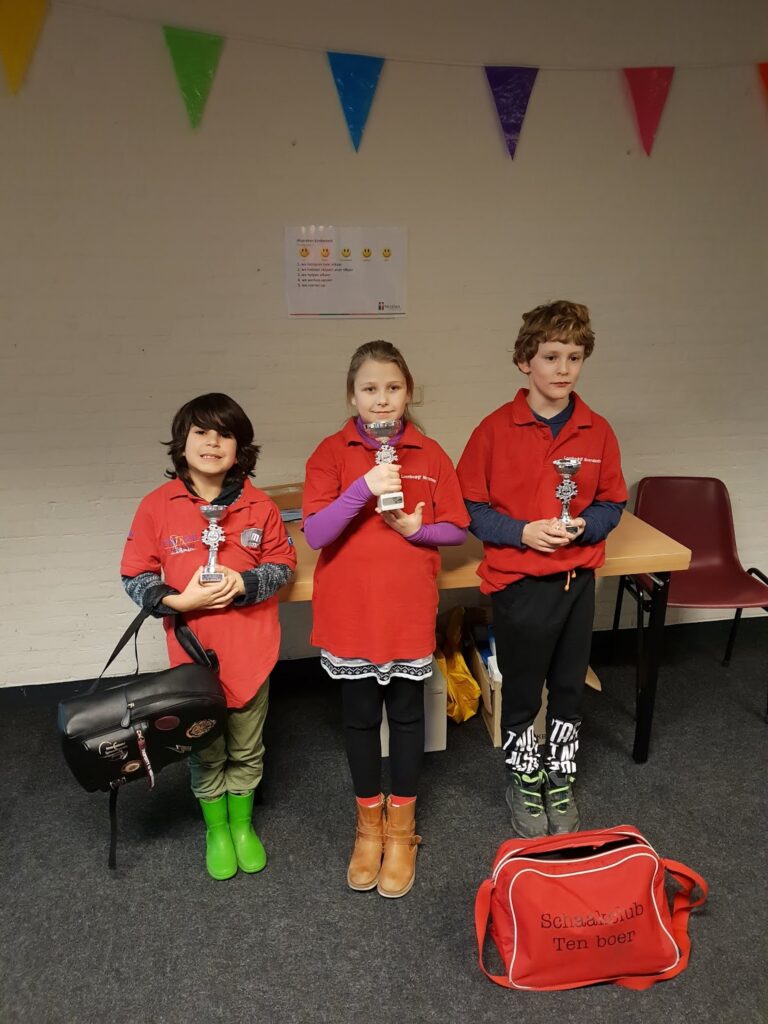 Met drie kinderen naar een toernooi en alle drie met een prijs naar huis. Beter kan toch niet? Positief is ook dat alle drie zo rustig speelden zaterdagmiddag. Dan ga je partijen winnen.