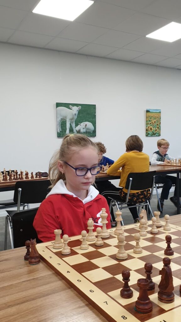 Ivar speelde ook in de groep. Zijn tweede toernooi al. Hij leerde erg veel. Zoals matzetten met koning en dame. Koning tegen de muur zetten, je eigen koning er tegenover en de dame er tussen. Ivar vogelde het zelf uit achter het bord. Ook voorkomen dat je mat gezet wordt door koning en toren. Koning uit de buurt van de rand van het bord houden. Ivar haalde zo 1,5 punt. Een goede prestatie, vooral het zelf oplossen van een situatie door een plan te bedenken. Ivar gaat een goede schaaktoekomst tegemoet.