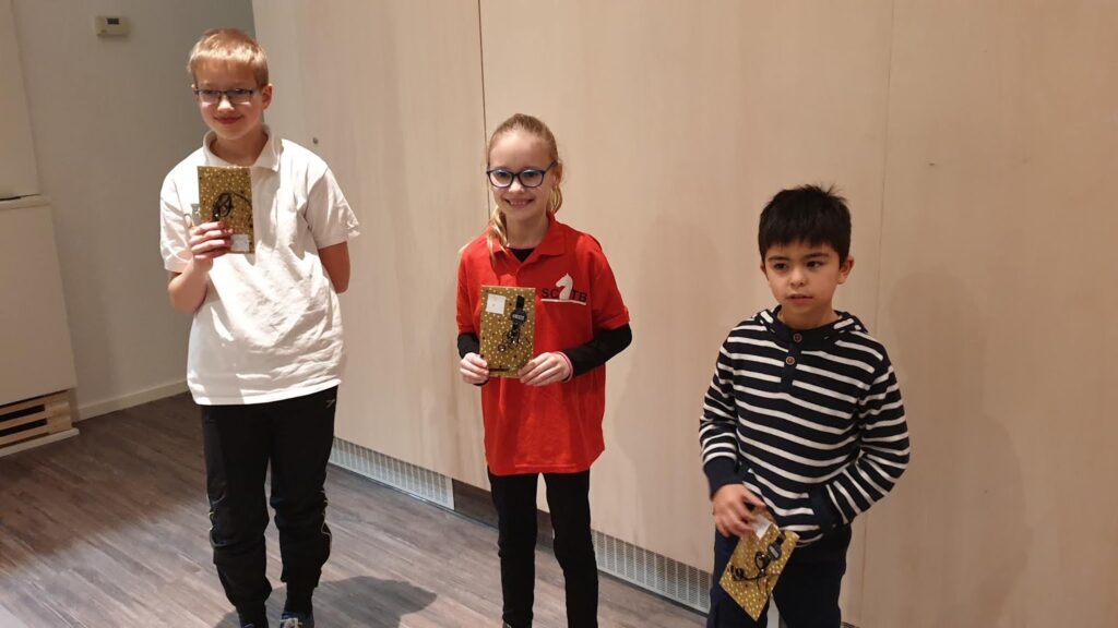 Paulien deed het ook beter dan ooit. Vandaag haalde ze 4 uit 8. Ze begon al met 2 uit 2. Ze leerde ook dat ze het tegen de groepsleider moet zeggen als je tegenstander te onrustig is waardoor je je niet kunt concentreren. Ze moest uiteindelijk snelschaken om de vierde prijs. Dit ging op zich uitstekend, maar omdat het de eerste partijen met klok waren, ging ze door de vlag heen en verloor terwijl de tegenstander eigenlijk bijna mat stond. Een sneu verhaal, maar het positieve is de progressie die ze vertoont. Ga zo door, Paulien.