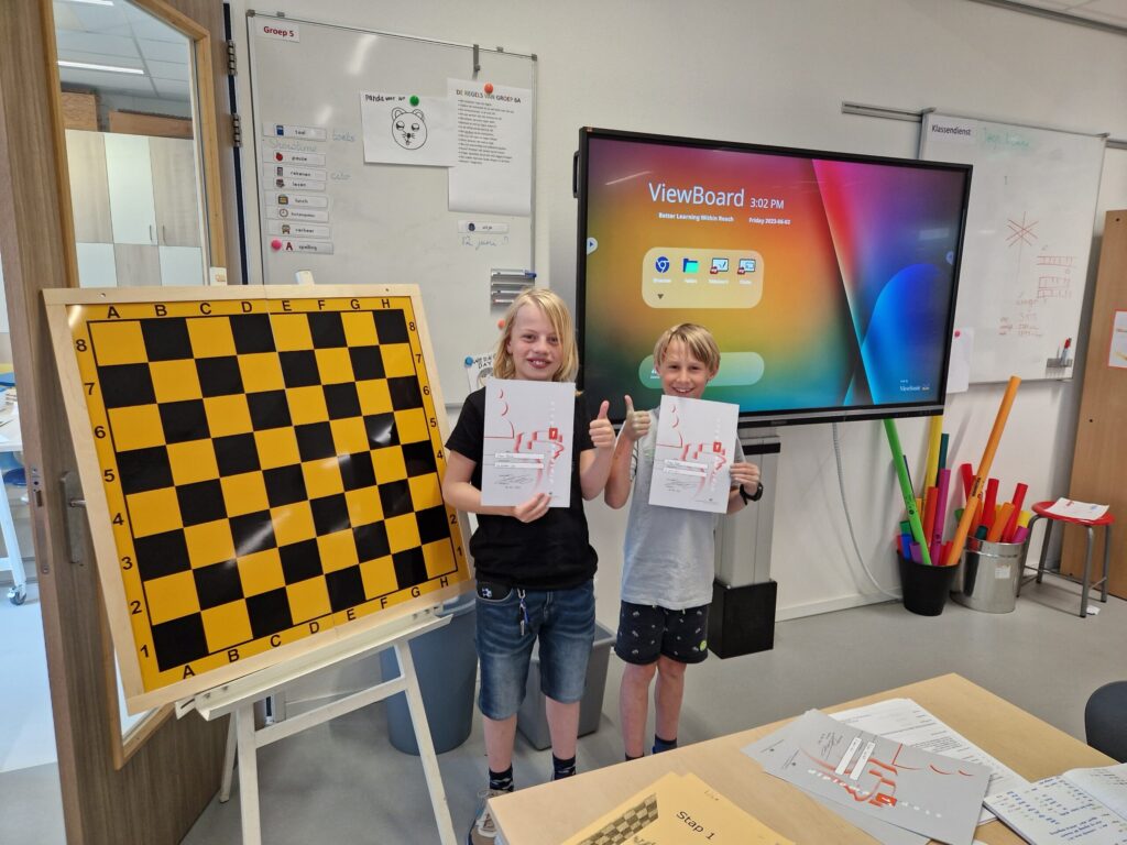 Bram en Thijmen speelden gisteren het Nederlands Basisschoolschaak kampioenschap in Gouda. Dit kampioenschap wordt over 2 zaterdagen gespeeld met gisteren de eerste 6 ronden. De GSV, al jaren één van de sterkste scholen op het kampioenschap, mag met twee teams meedoen. In team 1 speelt Bram mee en in team 2 Thijmen. Thijmen haalde in team 2 een knappe score van 4,5 uit 6. Zijn team staat in de middenmoot. Bram en zijn team staan eerste na dag 1 met 1 matchpunt voorsprong op het sterke Den Bosch. Bram scoorde 5,5 uit 6 op bord 2. Volgende week zal de belangrijke wedstrijd tegen Den Bosch waarschijnlijk als eerste op het programma staan.
