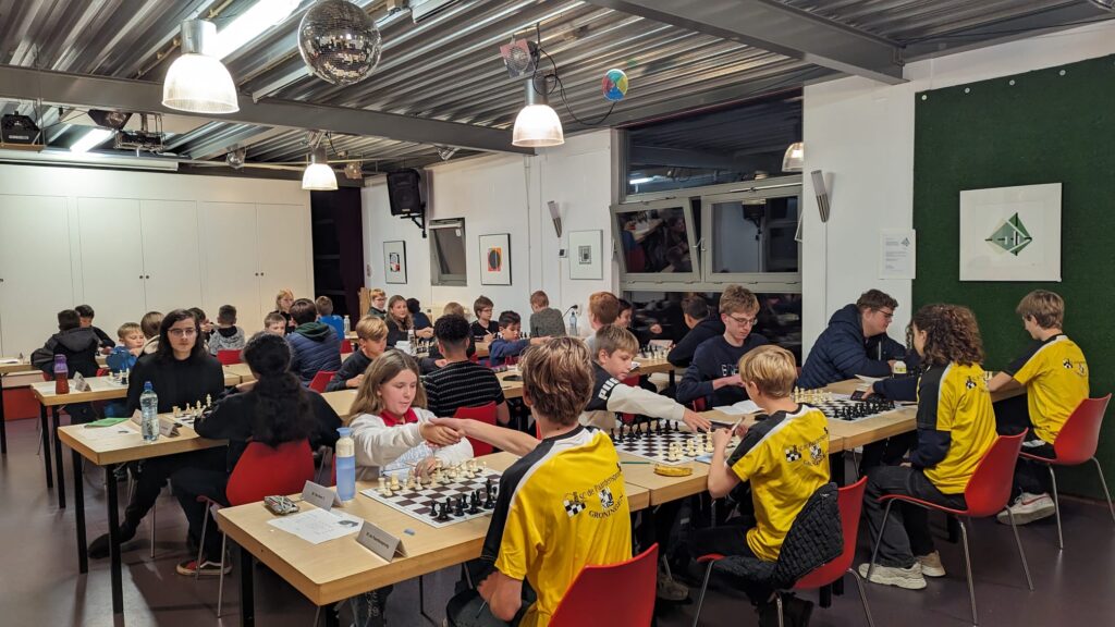 Vrijdag zetten we Bram, Elisa, Daniël en Eline in team 1. Ze mochten tegen een duidelijk minder sterk team, de Matadoren. Bram was al vrij snel klaar. De tegenstander liet hem dwars door het midden komen. Daarna volgde een snel mat. Daniël vond het moeilijk om tegen een zo schattige tegenstander te winnen. Hij genoot zichtbaar van de sfeer in de Hunzeborgh. Eline en Elisa wonnen ook eenvoudig. De NJC betekent ook dat je je partij moet noteren zodat je na afloop samen met de trainer kan analyseren. Met Bram, Sarah en Niek was dat erg leuk om te doen.