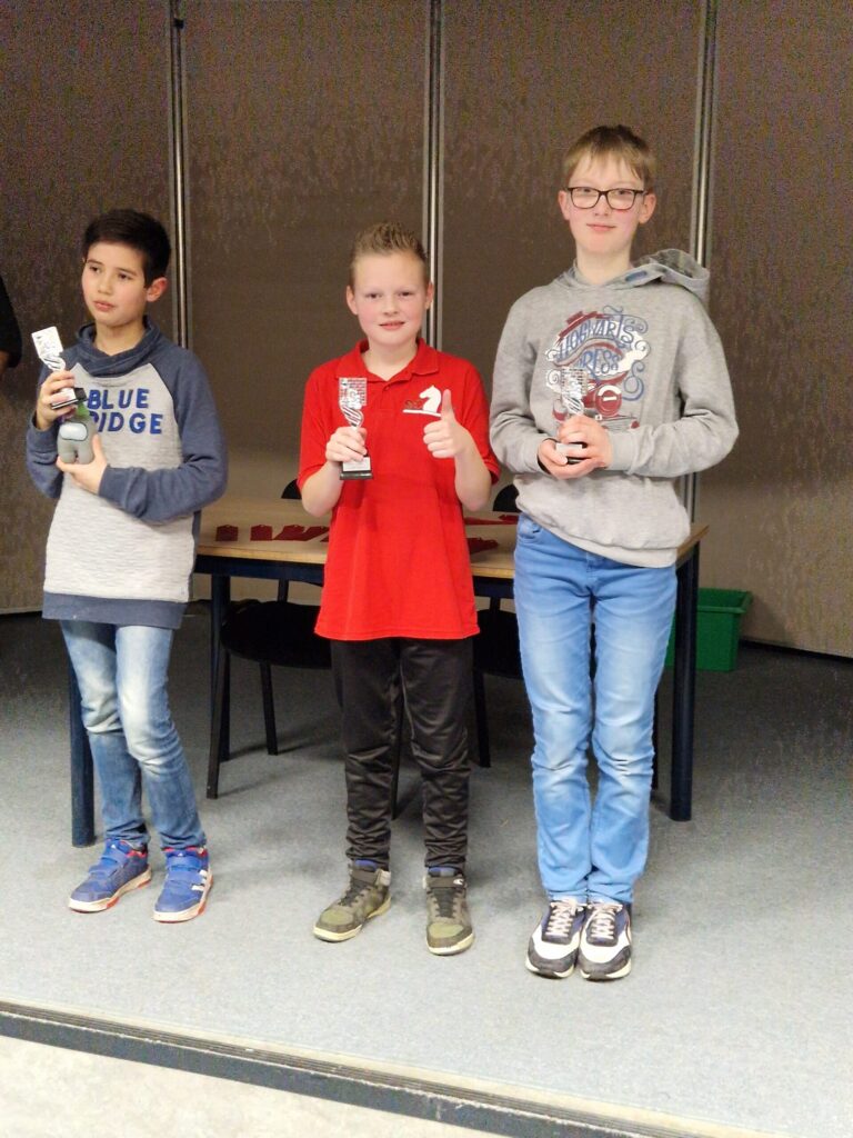Thijmen speelde goed in de C-groep. hij won van Mehran, maar verloor verrassend van Vygo. Daarna volgde weer een goede overwinning in een toreneindspel dat we net zaterdag hadden geoefend. Tegen Besher stond Thijmen verloren maar kreeg een remiseaanbod. Dat nam hij dankbaar aan. In de laatste ronde speelde hij weer een mooi eindspel tegen Djooz. Nu met een kwaliteit meer. Met 3,5 uit 5 werd hij gedeeld tweede en op onderling resultaat kreeg hij de derde prijs.