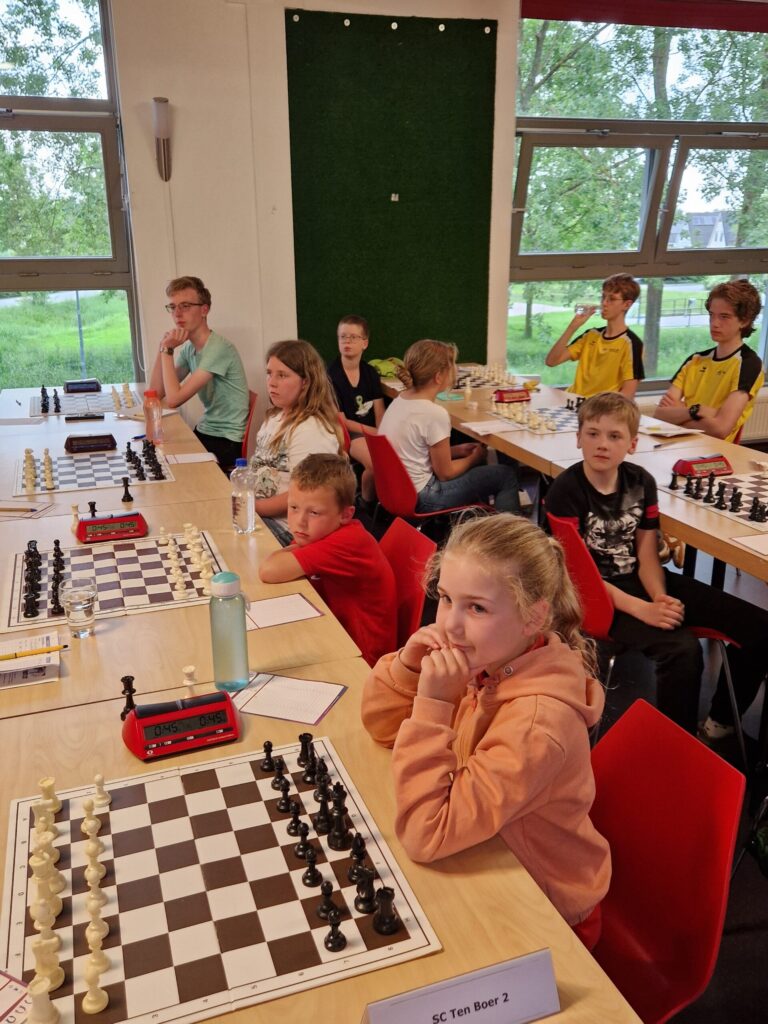 Gelukkig kende Joris het eindspel en wist dat hij zijn koning recht naar achteren moest zetten om remise te houden. Toch bleef zijn tegenstander het 12 zetten met de pion op g5 en 17 zetten met de pion op g6 proberen. Joris gaf ook aan dat het remise is. Uiteindelijk besloten we als wedstrijdleiding op het moment dat Joris een zet kon doen waardoor voor de vijfde keer dezelfde stelling ontstond om de partij in samenspraak met Alhassan remise te verklaren. Een geweldige prestatie van Joris op een fantastische avond voor hem. Voor een volgende keer Joris: zelf de wedstrijdleider erbij halen! Bram had ondertussen gewonnen dus we hadden 2,5 punt en gewonnen. Hierna was er nog één partij aan de gang in de Hunzeborgh: die tussen Elise en Eli Alia.