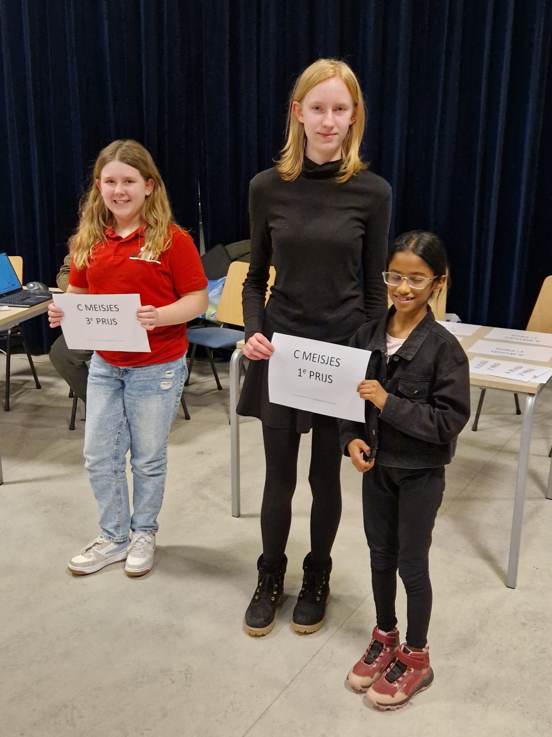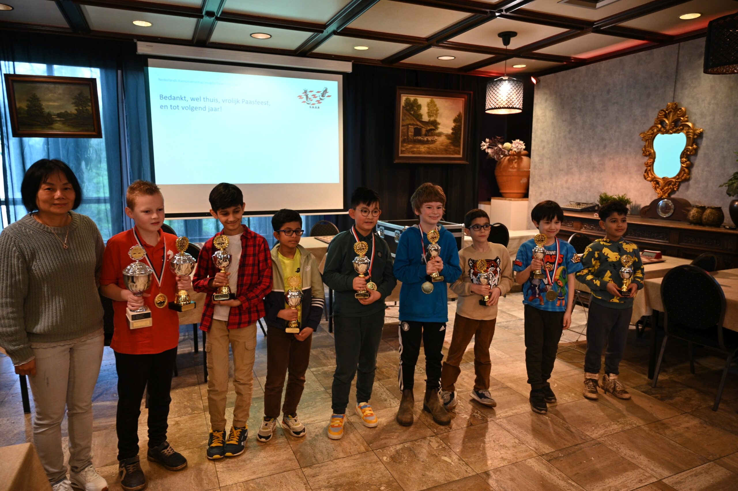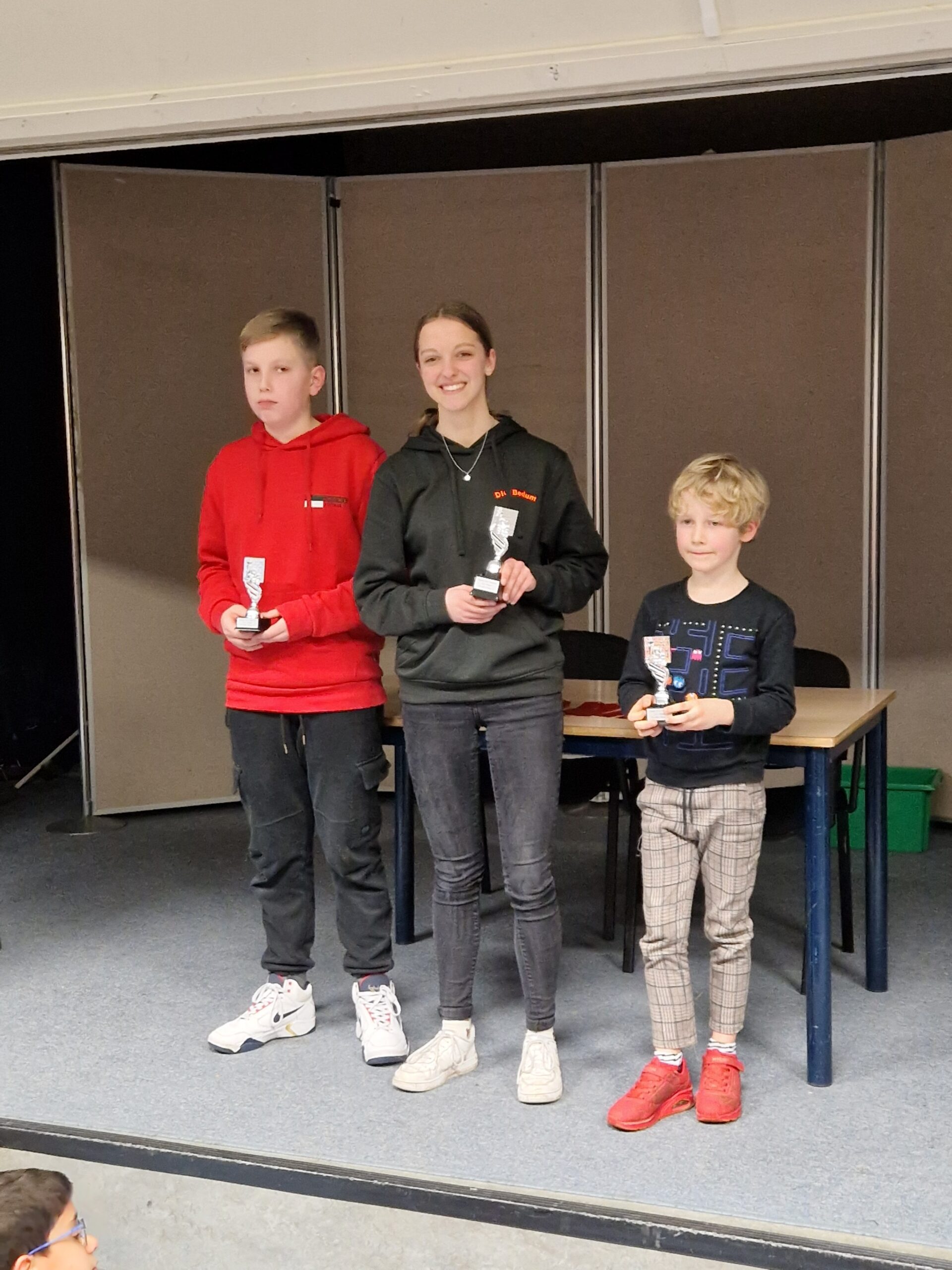 Vanuit Ten Boer waren we met 14 jeugdschakers. Elisa kon niet meedoen omdat ze het kwalificatietoernooi in Utrecht speelde en Timo was gaan dammen (?) om als provinciaal kampioen gehuldigd te worden. Waar we in vroegere jaren eigenlijk alleen kans op eremetaal hadden bij de prijzen voor meiden, hebben we nu een groep die ook in hun categorie de boventoon voeren. Hierdoor was de oogst erg hoog: in drie categorieën werd een clublid kampioen, in de Topgroep werd Bram tweede en in de C- en de D-categorie hadden we ook een prijs.