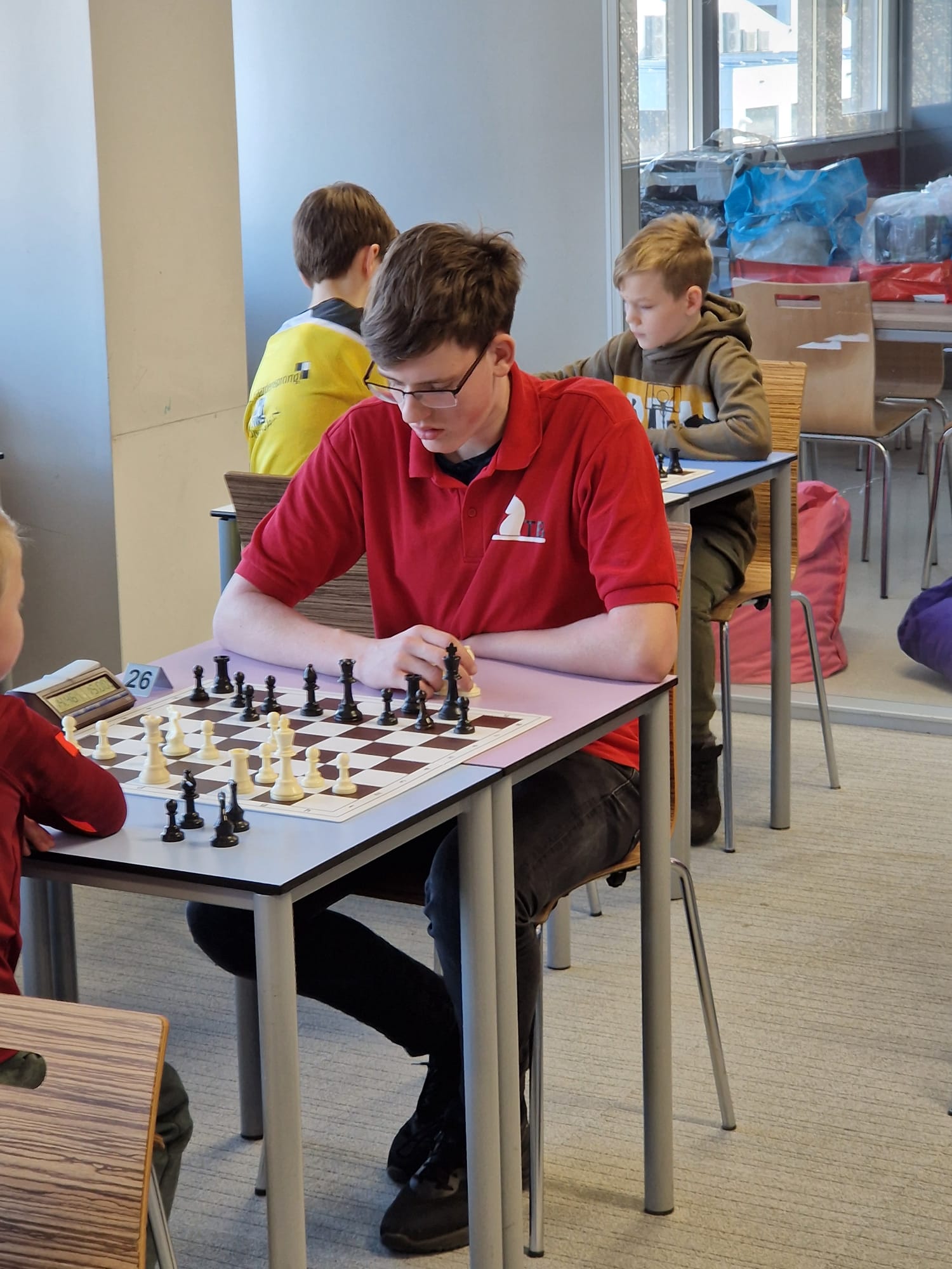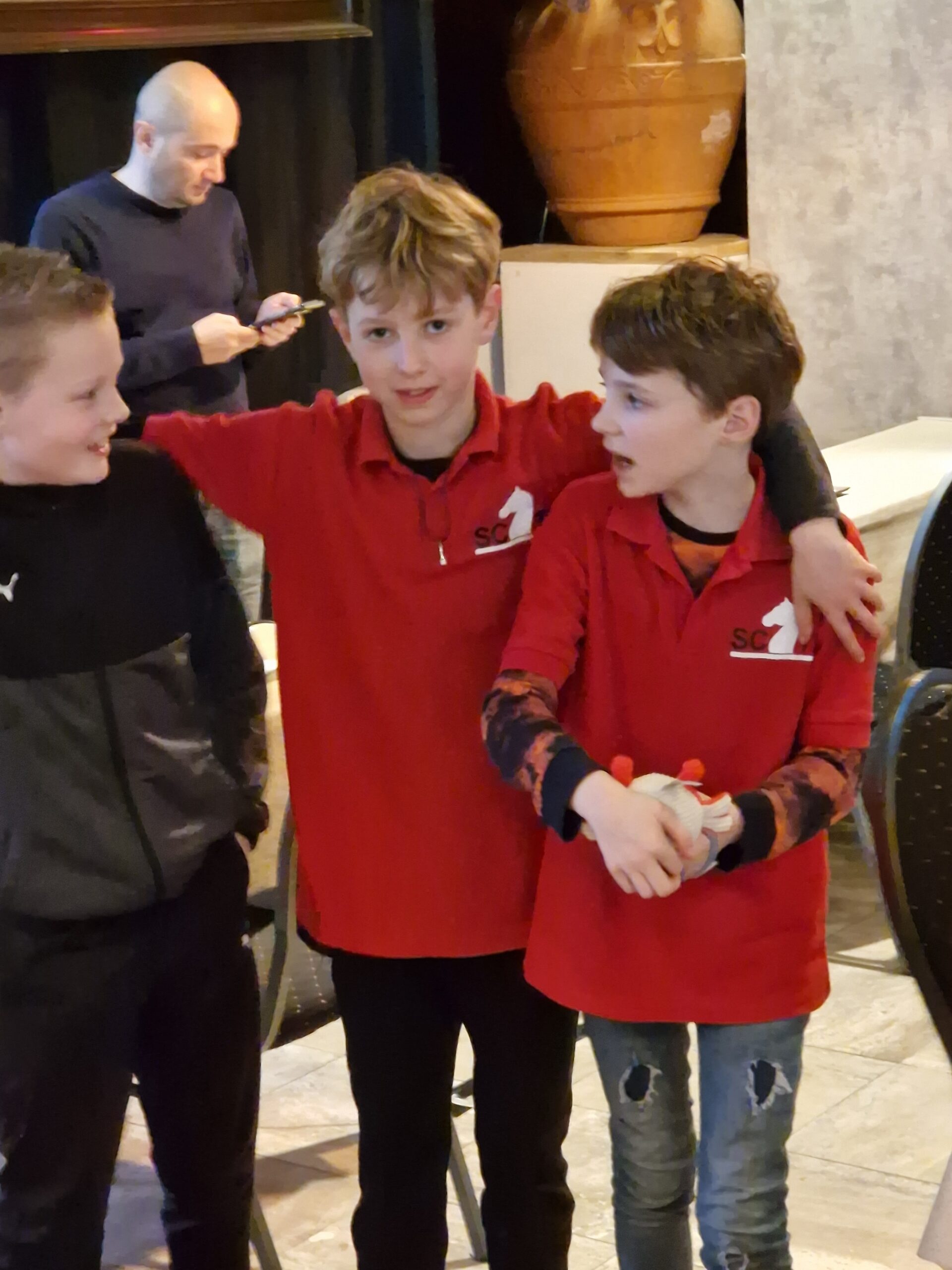 Het harde werken loonde gisteren. Zoals het hele weekend klopte met alle drie jeugdspelers en de aanwezige begeleiding vanuit SC Ten Boer. Duidelijke rolverdeling in de groep, Geon die veel sneller zag wat er bij Bram of één van de twee anderen nodig was om ze weer scherp te krijgen. En vooral een goede ontspanning in de hele groep op zulke momenten, geen onnodige druk op de jeugd leggen. Natuurlijk was het voor ouders en trainers spannend tijdens het schaken, maar de jeugd merkte hier weinig van en vóór het eind van de partij wist een ieder wat Joris, Bram of Thijmen nodig had om even bij te komen en daarna weer scherp te zijn voor de volgende partij.
