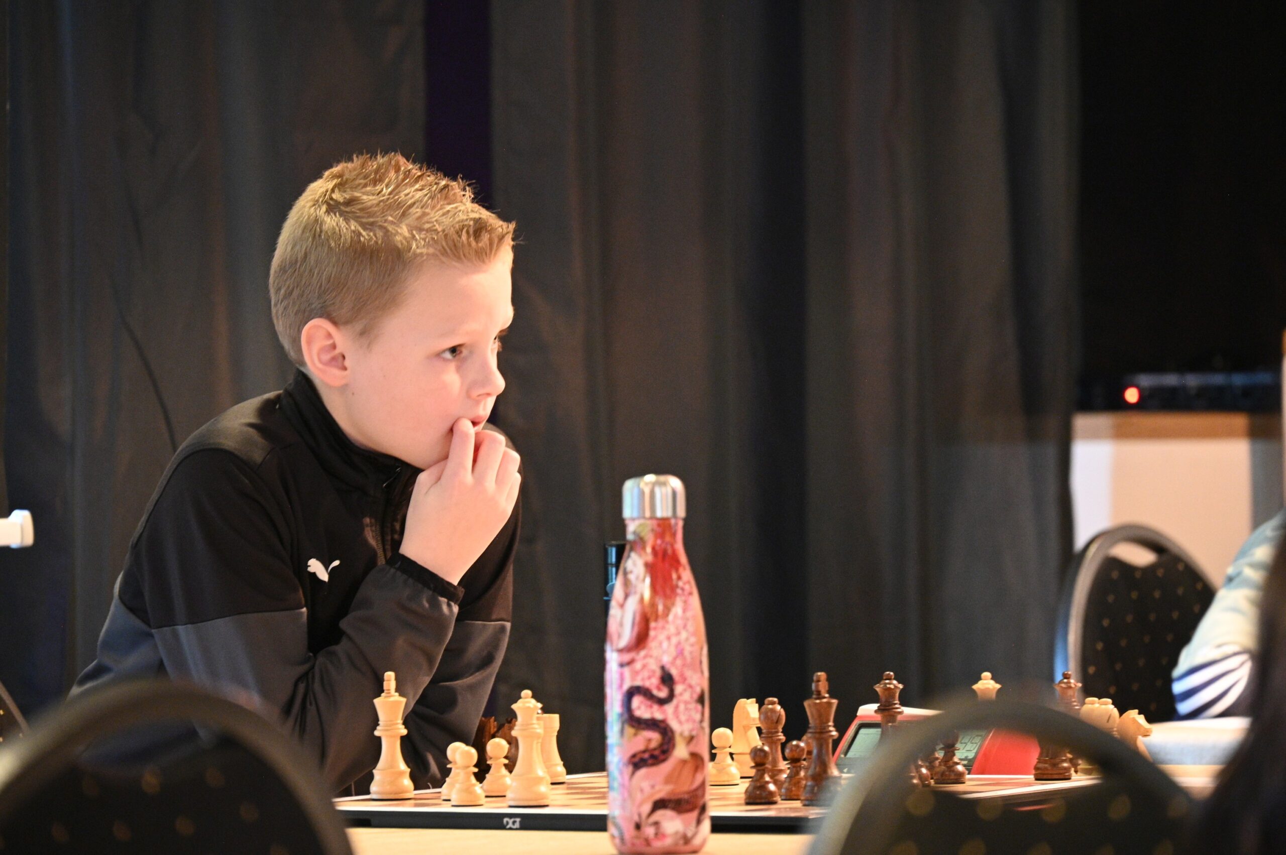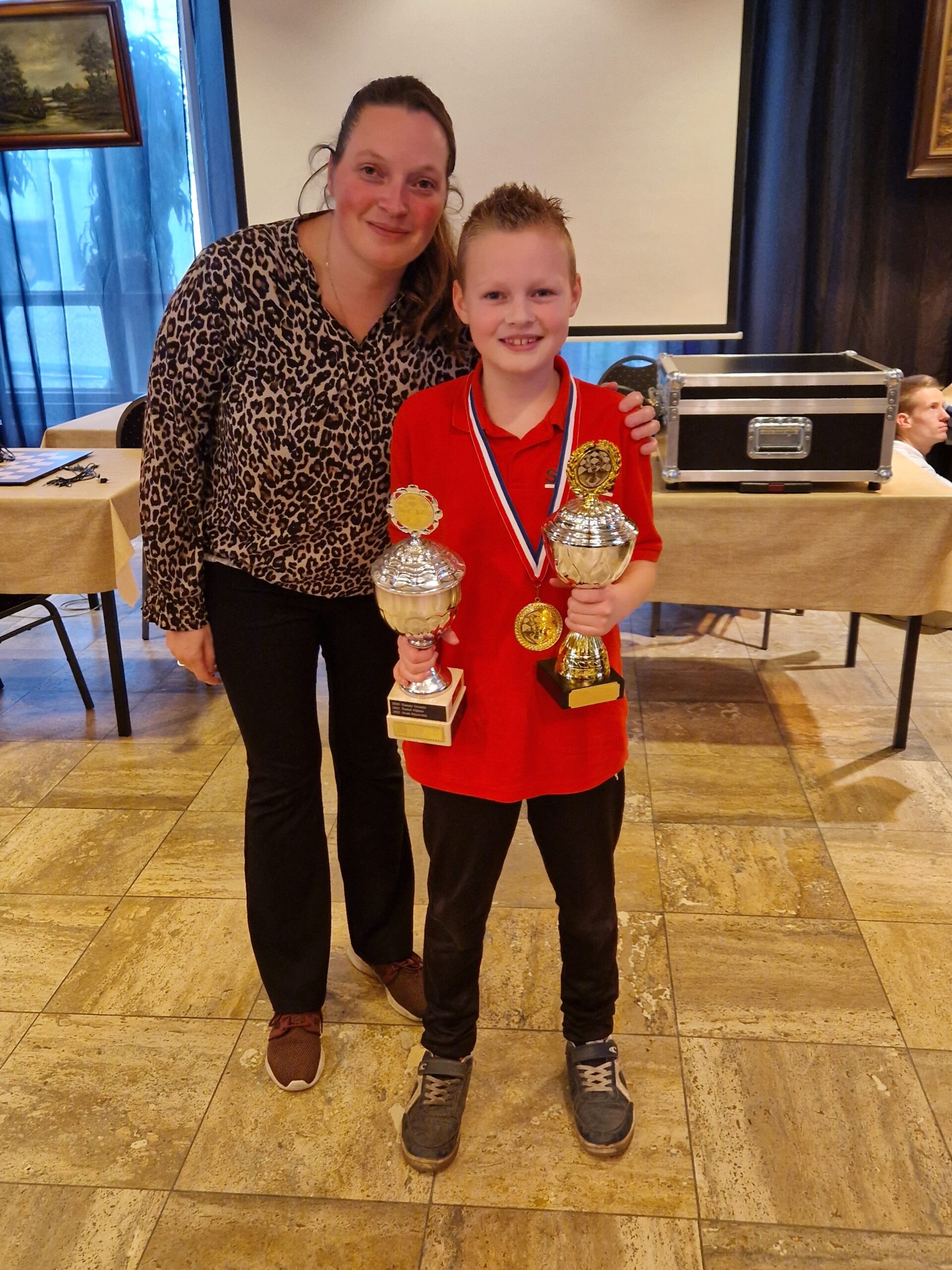 Het afgelopen jaar heeft Bram een hele ontwikkeling doorgemaakt. Vorig jaar werd hij met 6 uit 9 vierde en ik weet nog dat we na afloop tegen elkaar zeiden: volgend jaar sta jij op de plek waar de kampioen nu staat. Geon had hem toen net onder de hoede en samen met Bram en zijn ouders stelden we een plan op voor het jaar tot dit NK. Doel: een WK- of EK-plek in de E-categorie in 2024. De ervaring van Geon was hier bijzonder belangrijk. Door het werken met talenten als Jorden in het verleden wist hij wat een goed pad naar het doel toe zou zijn. Bram heeft echte liefde voor het spel en hij heeft heel veel trainingsuren erin gestopt om dit plan ook achter het bord te realiseren.