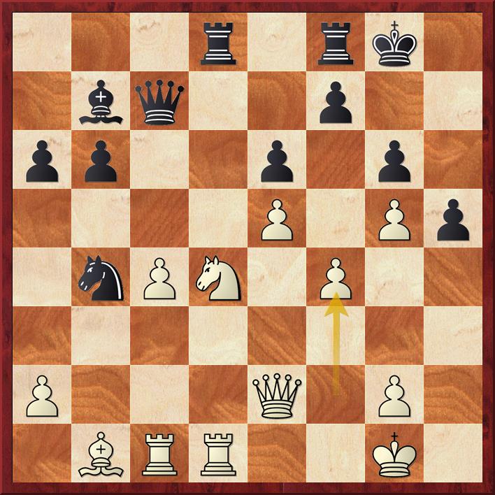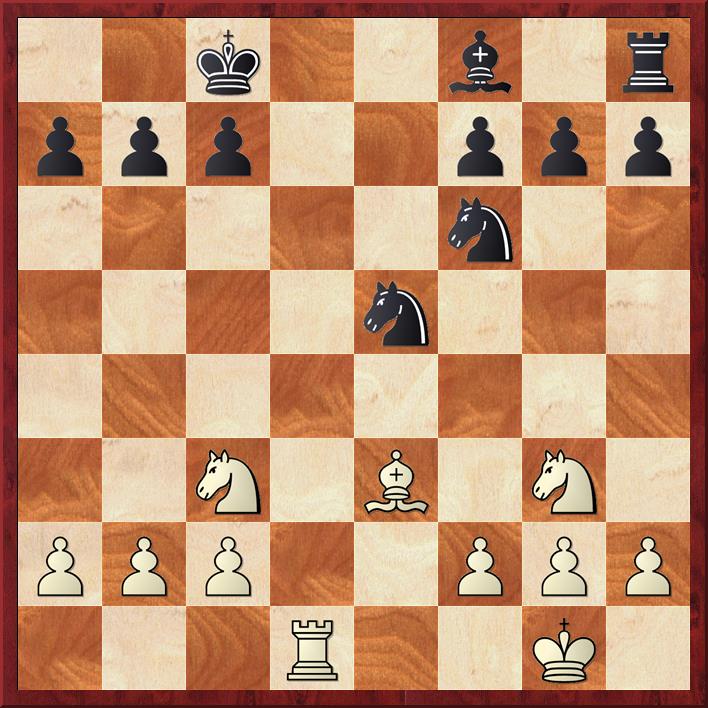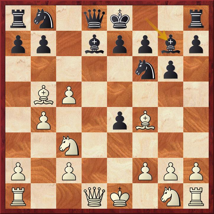 speelt Akul het minder sterke 8. Le5 om de diagonaal af te sluiten. Echter na 8… 0-0 9. Pge2 Lxb5 10. Dxd8 Tfxd8 11. Pxb5 wordt de lange diagonaal en de zwakke b-pion wit te veel. Bram speelt 11… Pc6 en Akul zit geen andere manier dan de pion met 12. Lc3 te dekken waarna zwart de erg goed gevonden tussenzet 12… Pd5 13. Lxg7