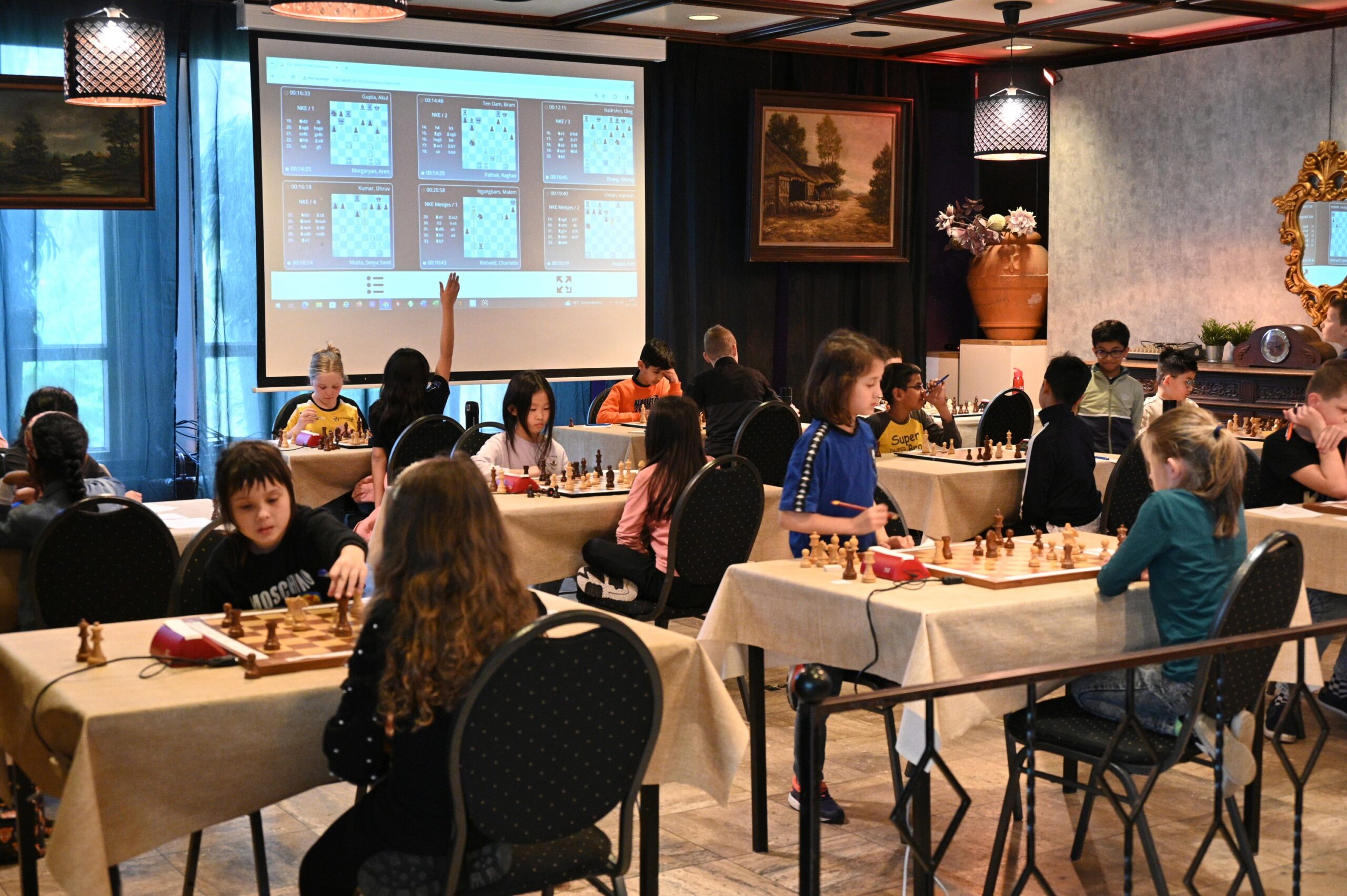 de enige foto van de partij tussen Raghav en Bram, op de achtergrond foto organisatie, je mocht geen foto’s met mobieltjes maken tijdens een ronde