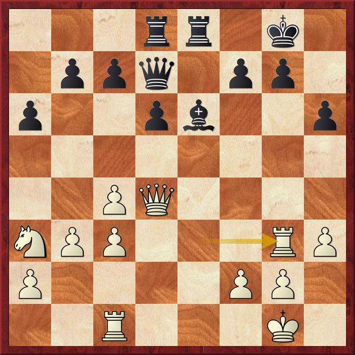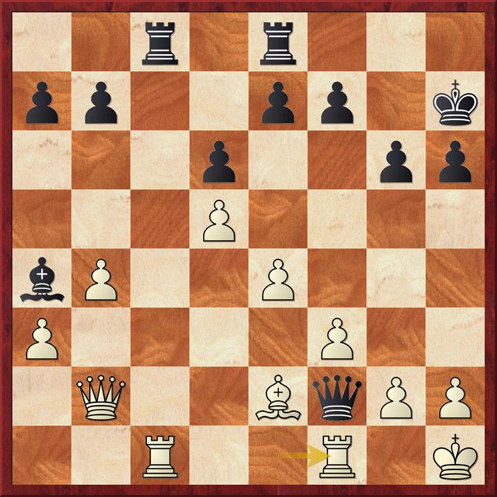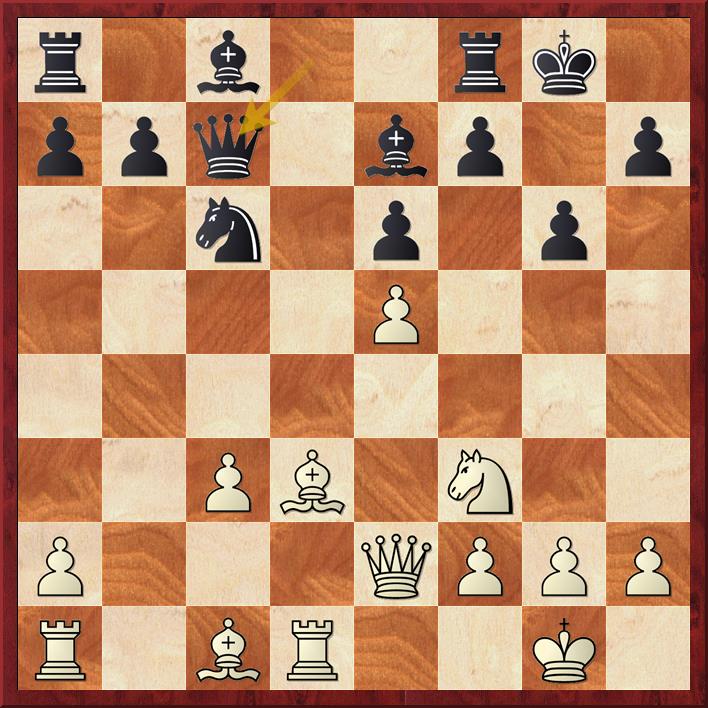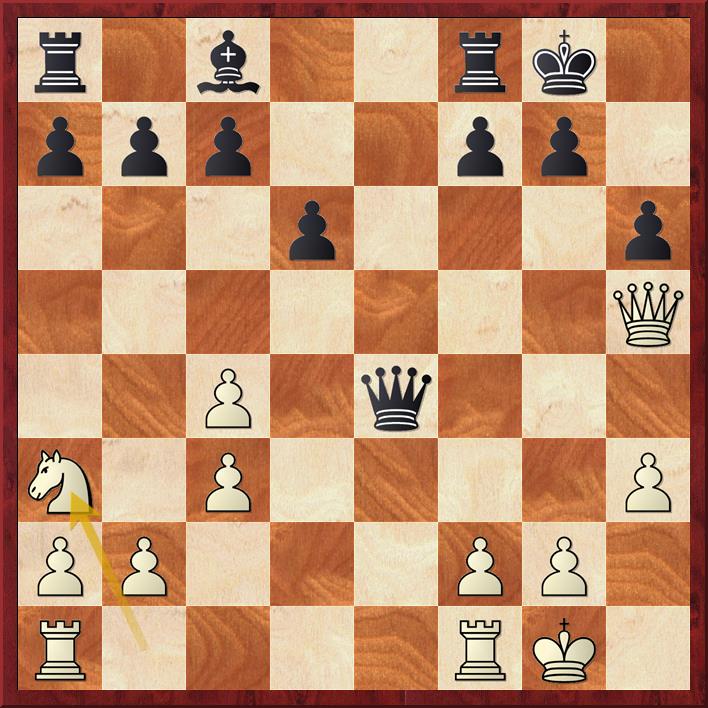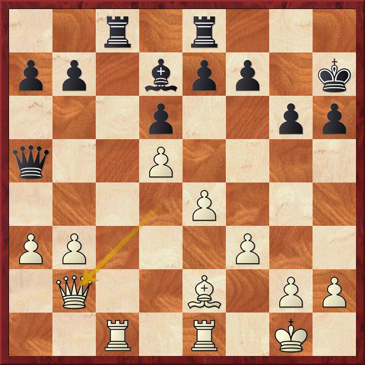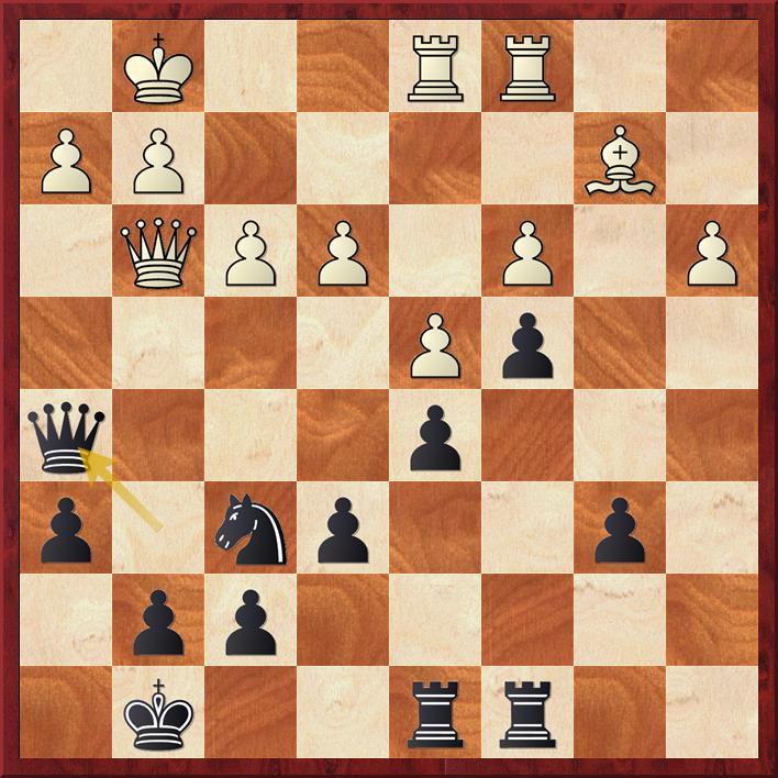 De pion op a3 is aangevallen en wit dekt die met de dame 20. Db2 maar dat geeft zwart de mogelijkheid om de diagonaal b6-g1 te veroveren en o.a. veld f2. Er volgt 20… Db6+ 21. Kh1 La4 (penning) 22. b4 Df2! (de volgende penning).