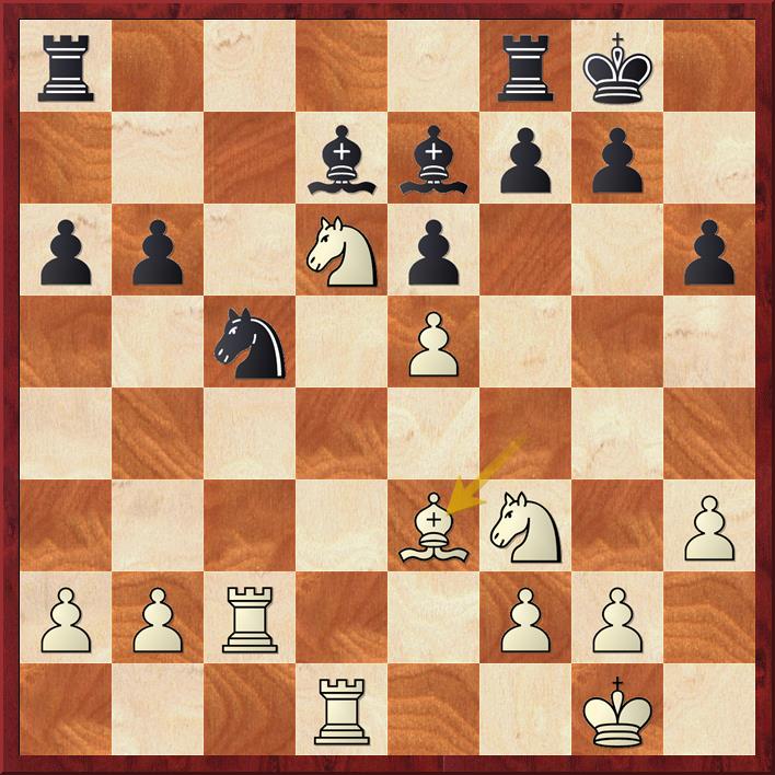 Hier ruilt Bram af naar een gelijke stelling met 16… Pxd5 17. cxd5 Pxd4 (veel schakers zouden niet zomaar de zwartveldige loper opgeven, maar het is de juiste speelwijze 18. Lxd4 Lxd4 19. Dxd4 Da5! Nu volgt de volgende fase.