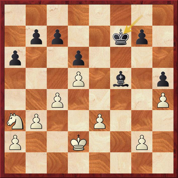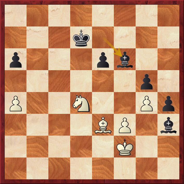 De marges zijn klein en het loperpaar geeft een heel klein voordeel. De zet die Bram speelt 39… Lg2 is prima, maar je sluit wel je loper in na 40. f3 Lxh3 41. Kf2 Nu moet je erg nauwkeurig spelen. Goed is 41. Lc5 met actieve verdediging van de pion op g5 en mogelijkheid om de loper te laten ontsnappen van h3. Bram speelde echter 41… f5 om na 42. exf6 e.p. Lxf6 met aanval op het paard te spelen.