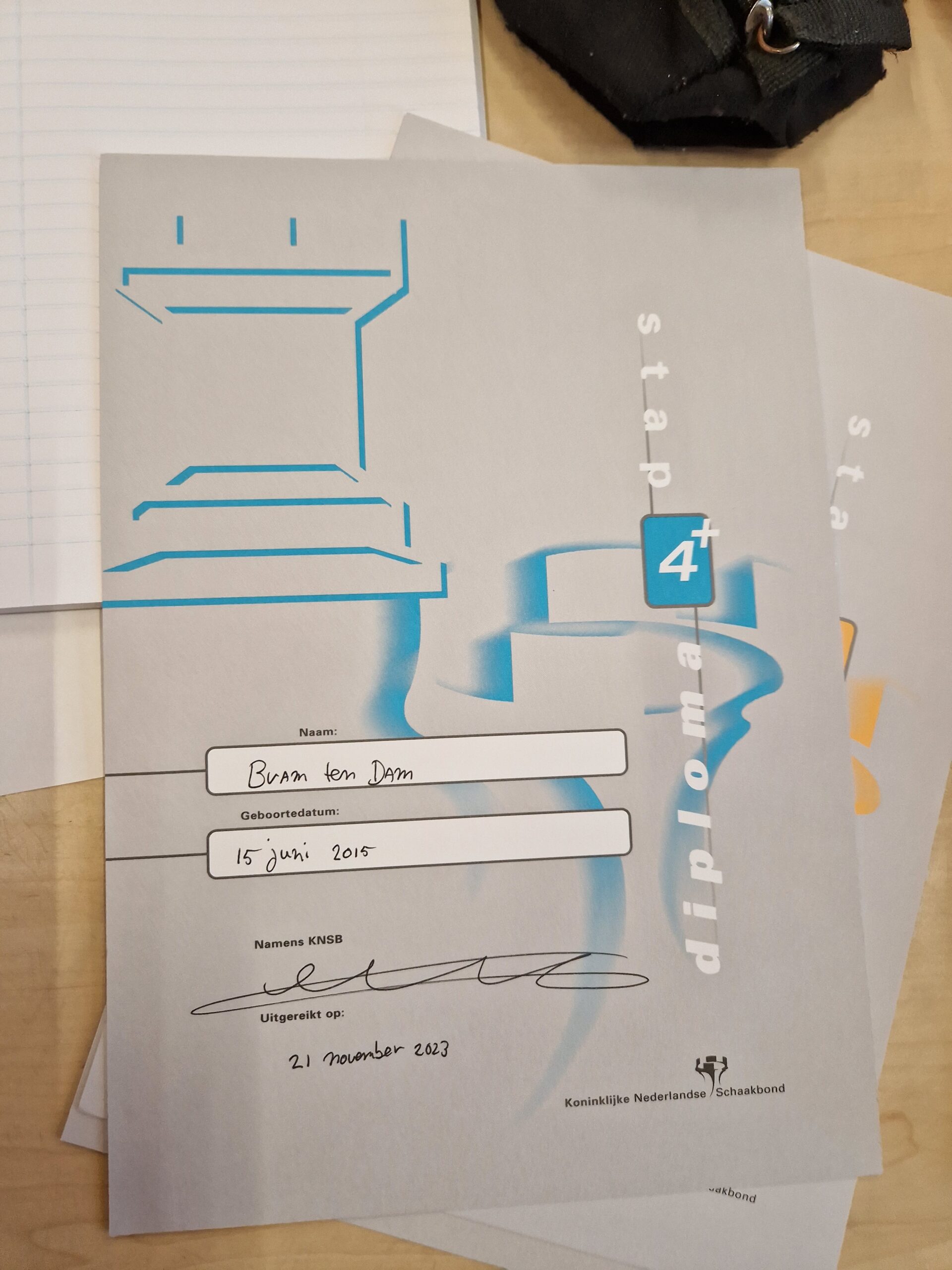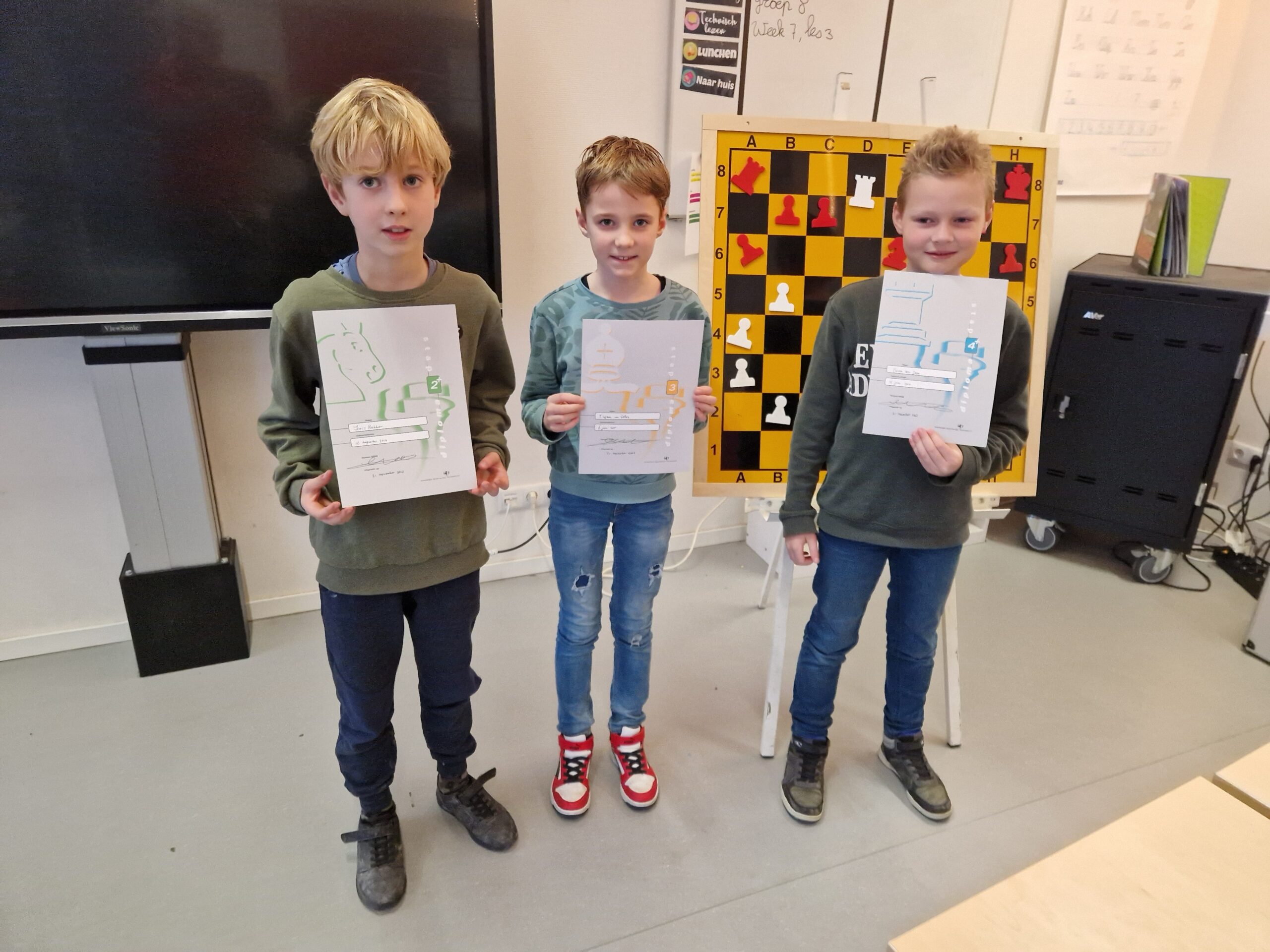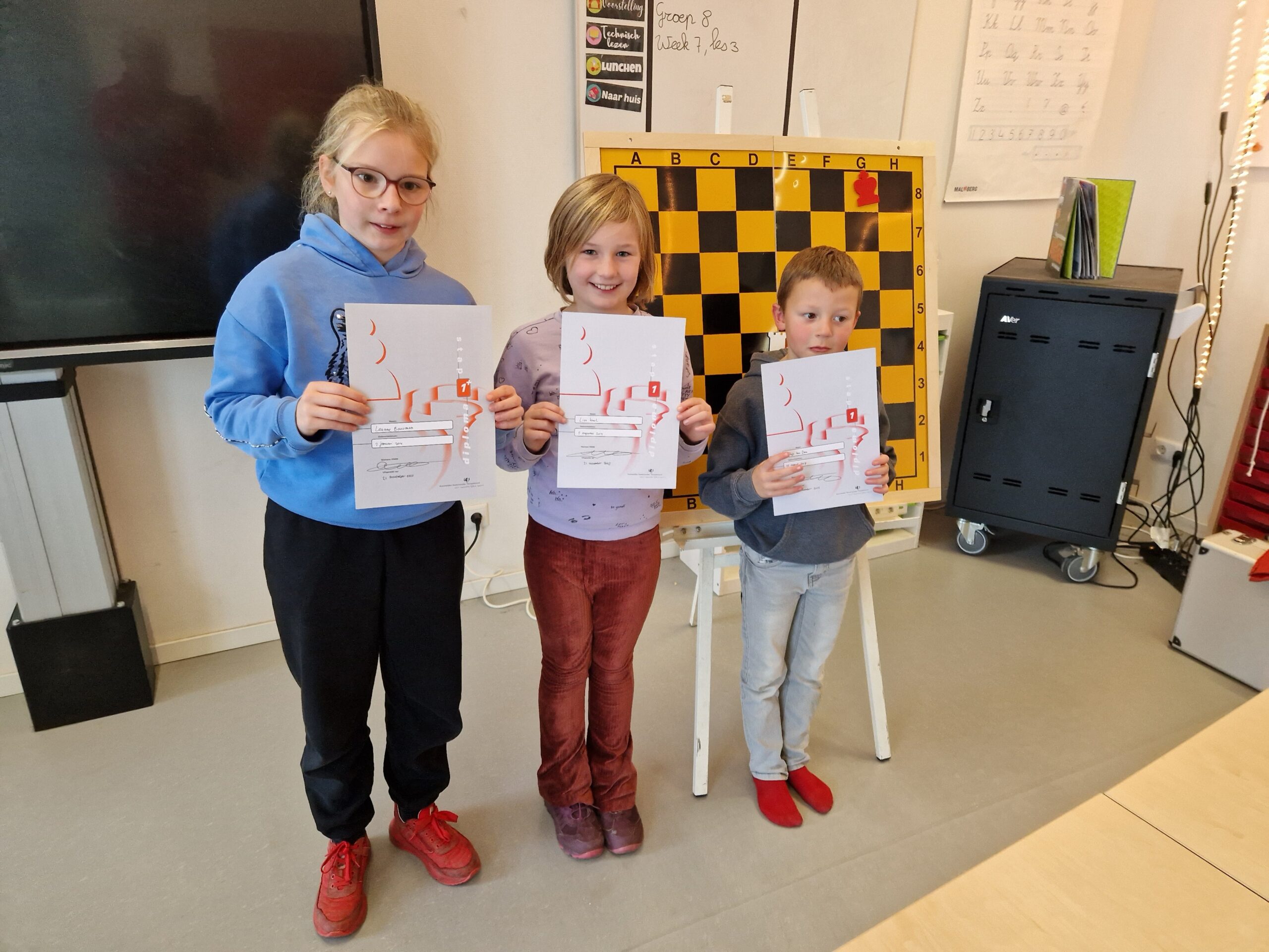 Gisteren konden we tijdens de clubmiddag een aantal jeugdschakers feliciteren met hun diploma. Liva en Thijs slaagden voor stap 1, Leanne haalde het diploma voor de moeilijke stap 1+. Van harte gefeliciteerd met jullie knappe prestatie, Leanne, Thijs en Liva!