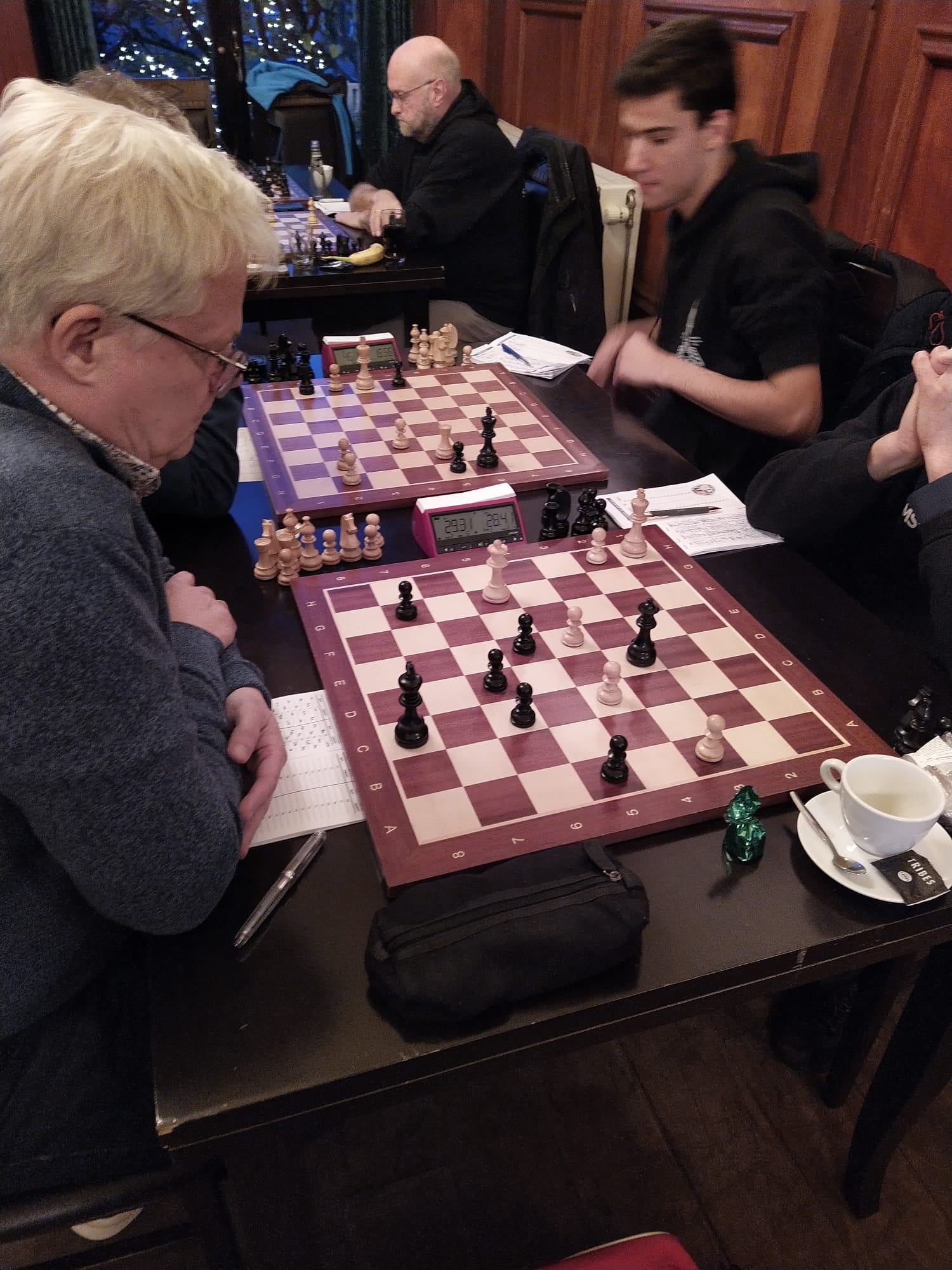 Tegelijkertijd speelden Elisa, Hannah en Thijmen voor de twee teams van Groningen (Nait soezen moar broezen en Dieverdoatsie) tegen teams van andere steden waar Tata on Tour langs is gekomen de afgelopen jaren. Er waren teams uit Haarlem, Hilversum en Beverwijk. Hannah speelde in Nait soezen op bord 3, Thijmen en Elisa in Dieverdoatsie op resp. bord 3 en 2. In de eerste ronde won team NSMB met 4-0. Team D. was lang onduidelijk, maar toen Thijmen voor de 2-0 had gezorgd (in moeilijke stand) werd de druk voor de tegenstander van Elisa te groot en drukte Elisa door naar de overwinning.
