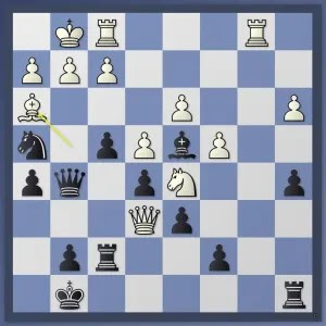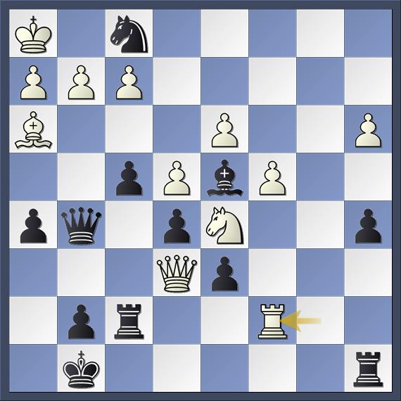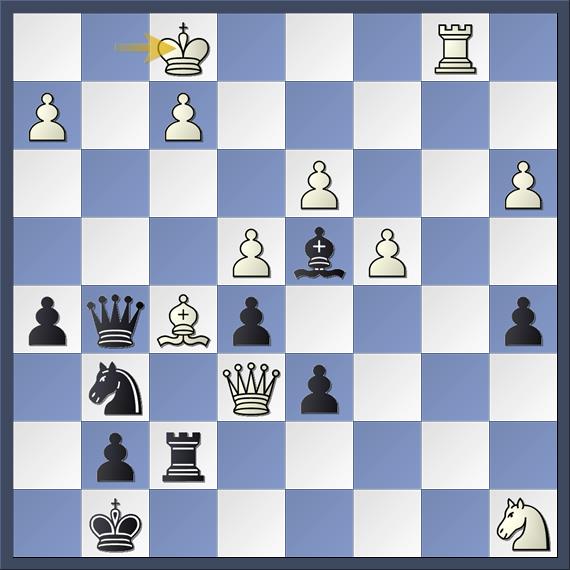 De enige zet die de balans houdt is 25. Lf5 volgens de engine. Zwart dreigt namelijk 25… Pf4 met aanval op de dame op e6 en op matveld e2 (dubbele aanval) en na 25. Tb8+ Kh7 26. Dxf7 is het opeens mat in een paar zetten met 26… gxf1D++ 27. Kxf1 Dc1+ 28. Kg2 Ph4+ 29. Kg3 Dg5+ 30. Lg4 Dxg4#. Speelt wit de toren op f1 weg met 26. Tfb1 dan volgt 26… Lxf2# Het idee achter 25. Lf5 is dat 25… Pf4 met de dubbele aanval nu faalt op mat op de onderste rij omdat veld h7 gedekt is door de loper en na 25… gxf1D+ 26. Kxf1