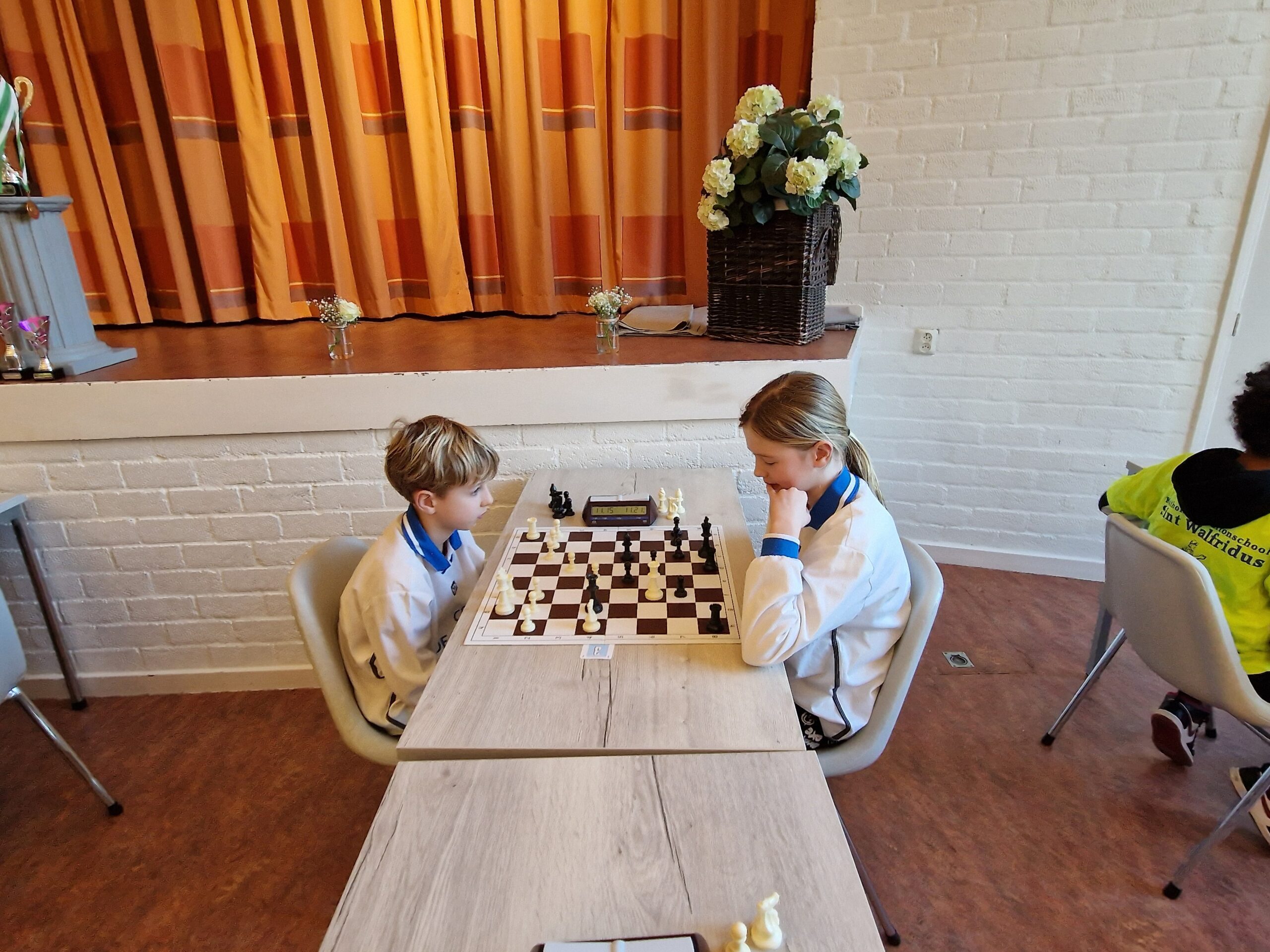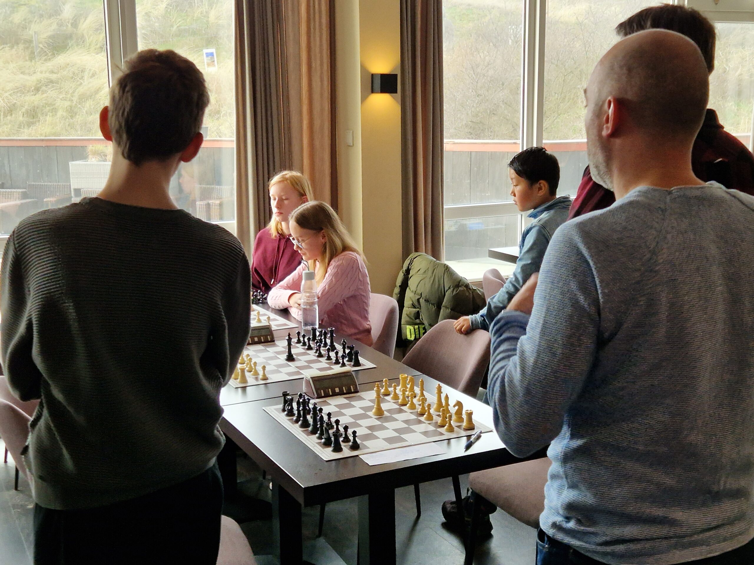 Hannah de Jong won van broer Gideon, onze Hannah gaf een paard weg tegen onze Thijmen. Thijmen speelde dit grootmeesterlijk uit. Wat is Thijmen toch sterk geworden in korte tijd. Elisa stond wel goed, maar wist haar partij in een paar zetten van een duidelijk voordeel om te buigen naar duidelijk nadeel. Wellicht had ze nog de remise kunnen houden maar nu ging ze door de vlag. Ondertussen versloeg Eli Alia Theo in een eindspel, waardoor de 2-2 eindstand op het scorebord stond. Bij gelijke stand valt het onderste bord weg waardoor team Dieverdoatsie kampioen werd en team Nait soezen moar broezen tweede. De wisselbeker gaat naar Groningen, volgend jaar dus weer meedoen!