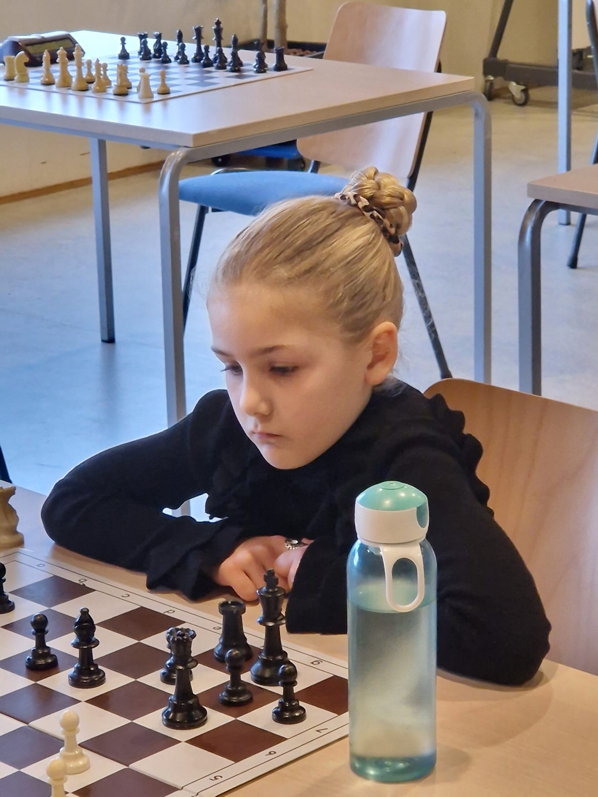 In de laatste ronde won Hannah van Fabian en wist hiermee de perfecte score voor deze middag neer te leggen. 7 uit 7 en ze werd daarmee voor de derde keer kampioen van het BSK Bedum Ten Boer. Een unieke prestatie bij mijn weten. Finn, Elisa en Lindert wisten in bet verleden twee keer te winnen. Van vóór 2006 weet ik het niet, dus helemaal zeker ben ik niet. De cijfers zeggen ook genoeg: in 2021-2022 6 uit 6, in 2022- 2023 5,5 uit 6 en vandaag 7 uit 7. Kortom: in drie jaar heeft ze slechts één remise afgestaan aan Bram ten Dam. Joris werd op gepaste afstand tweede met 6 uit 7. Op de derde plaats eindigden Bram Bosch, Thijs ten Dam en Ruben Bosch met 5,5 uit 7. Omdat er slechts één derde prijs is moesten hier de weerstandspunten beslissing brengen. Dat wil zeggen: wie heeft in de 7 ronden de sterkste tegen/weerstand gehad. Dat bleek Bram te zijn (een half punt meer dan Thijs).