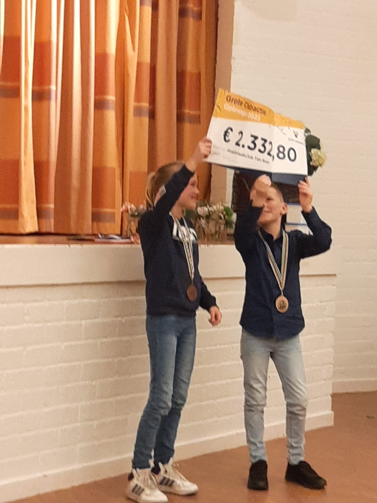 Jolie en Sven houden het bord met het totaalbedrag omhoog