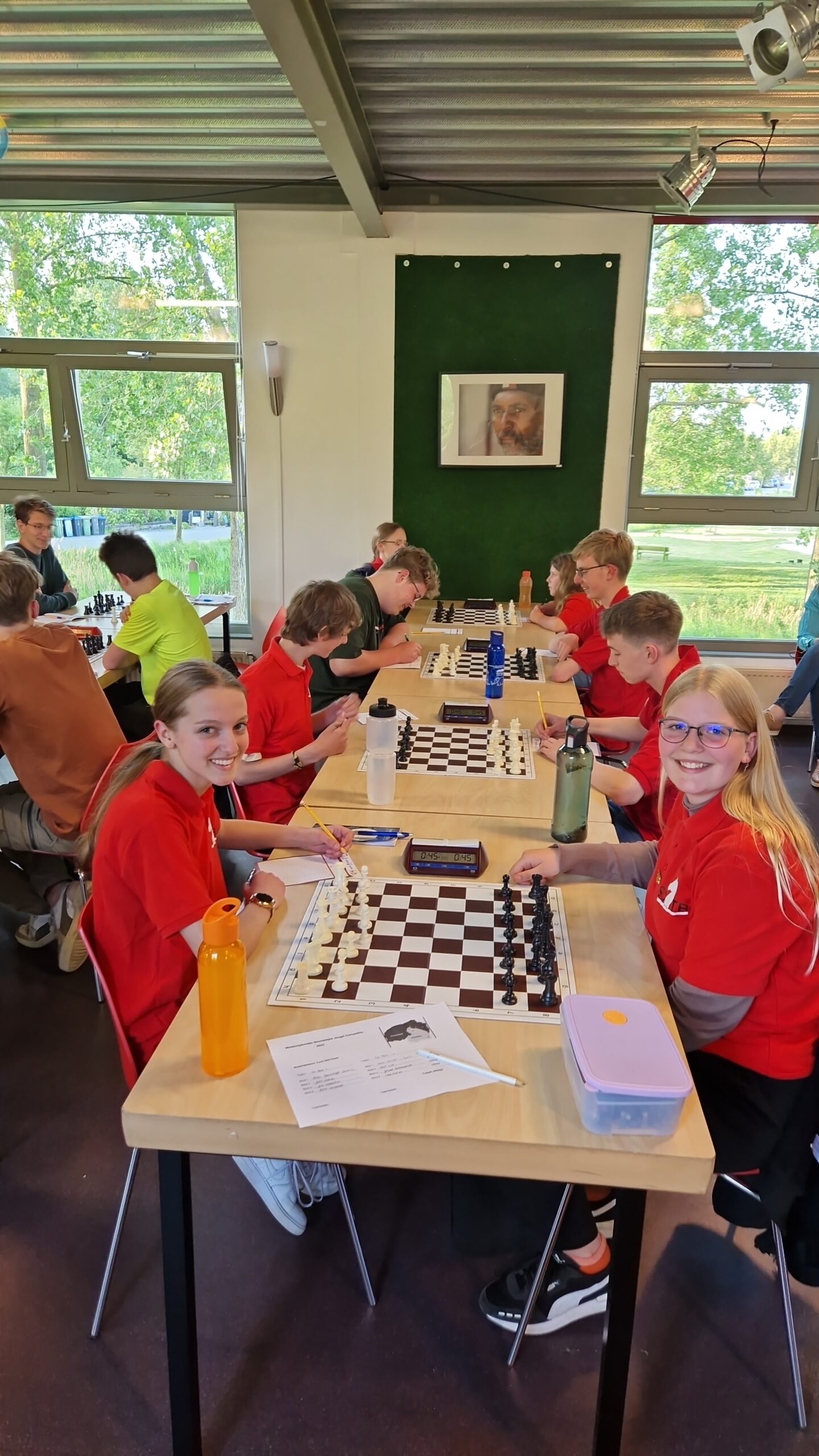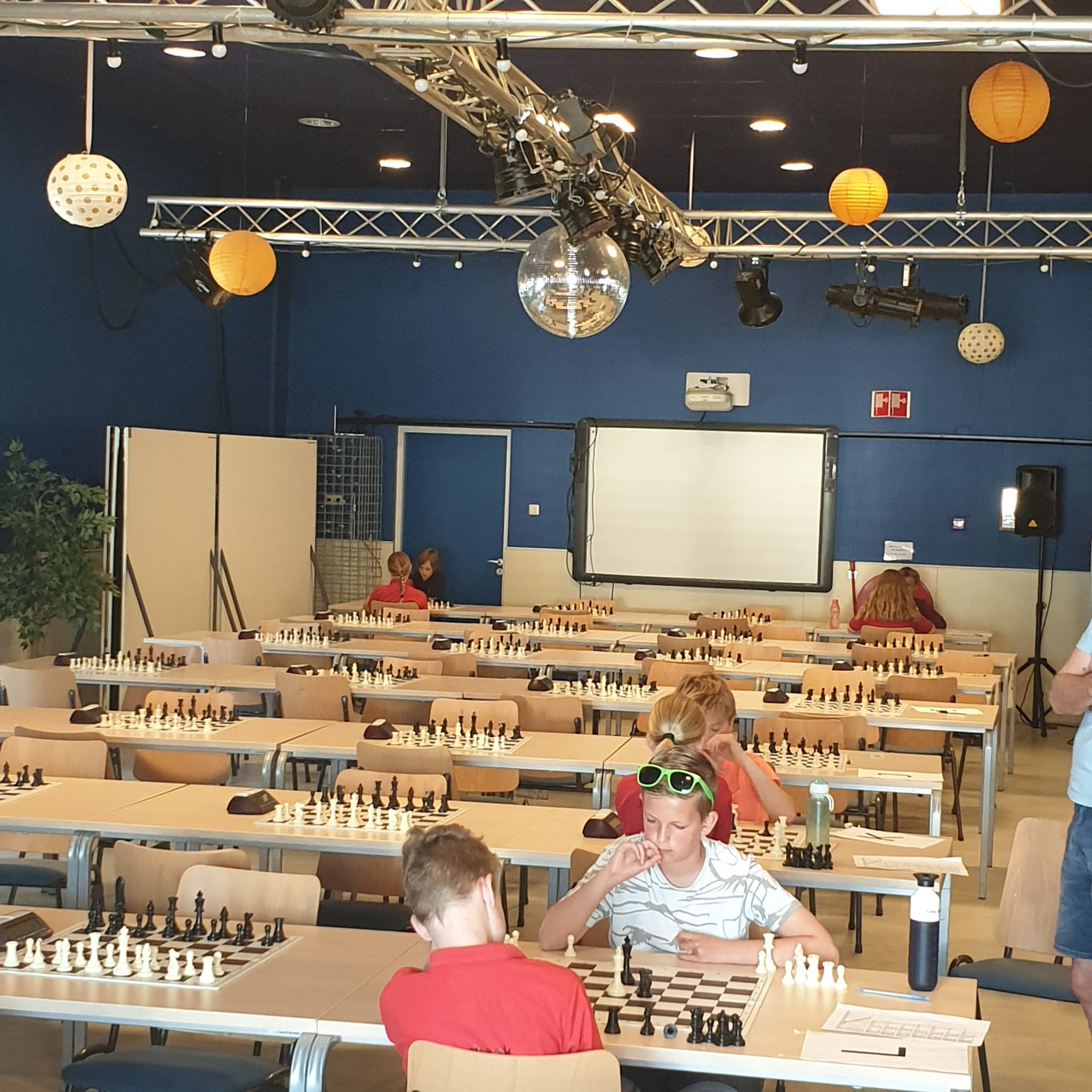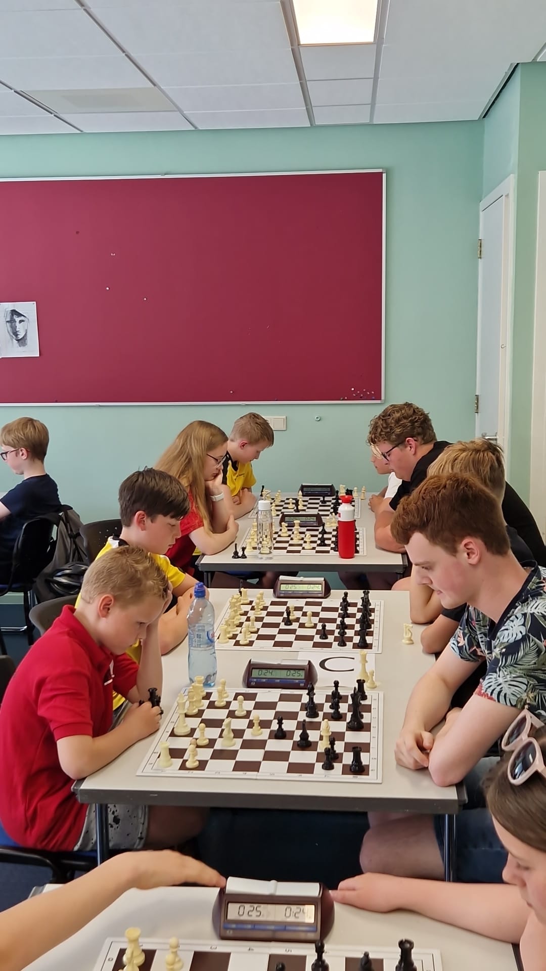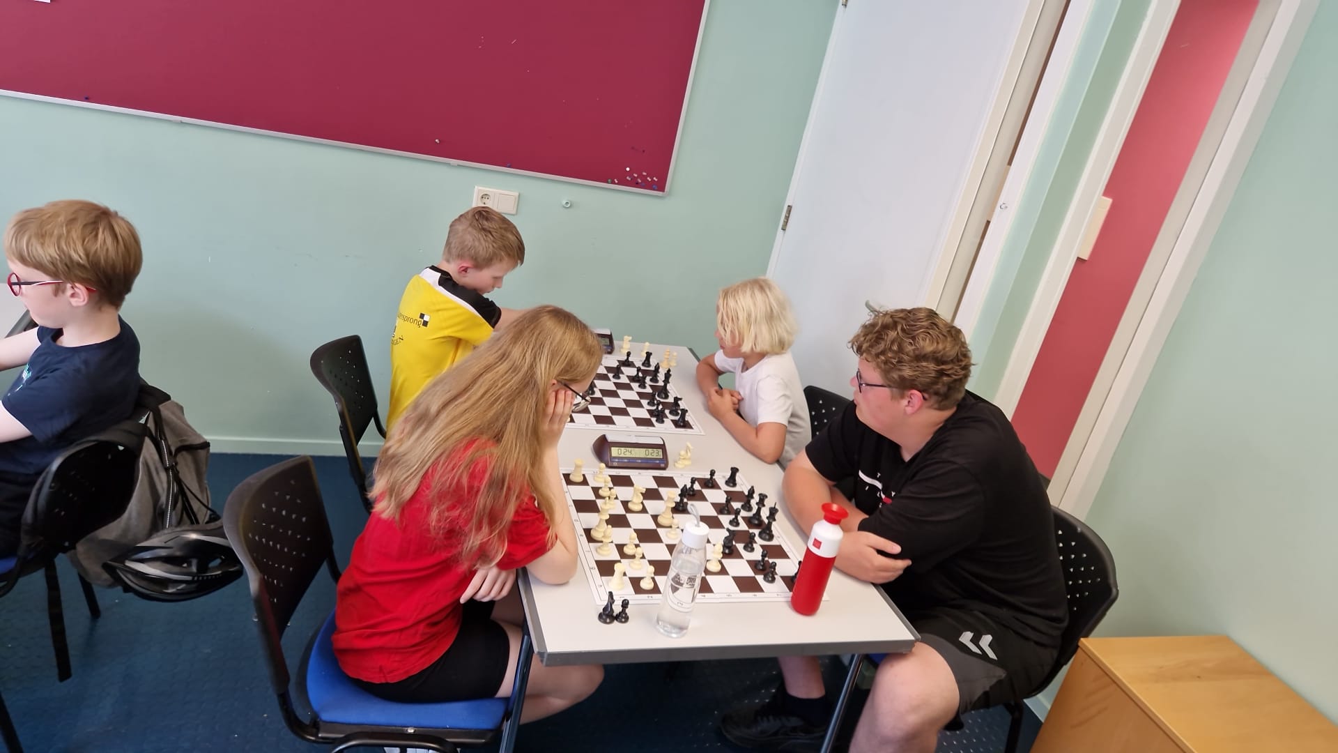 de laatste partijen in de speelzaal met Timo (!!), Lieke, Hannah en Sarah. En vermoedelijk zit Eline tegenover Sarah. Er werd dus goed gebruik gemaakt van de extra tijd op dit toernooi door onze spelers.