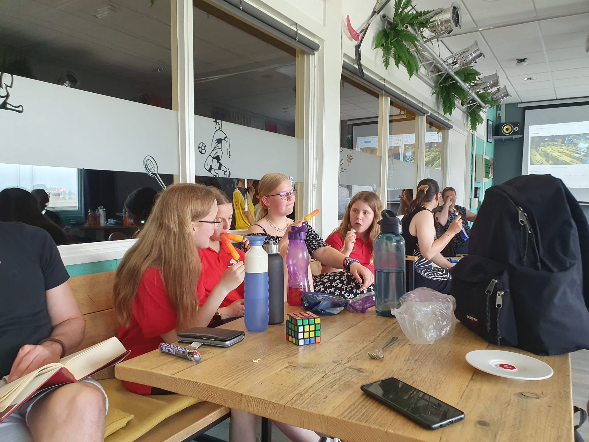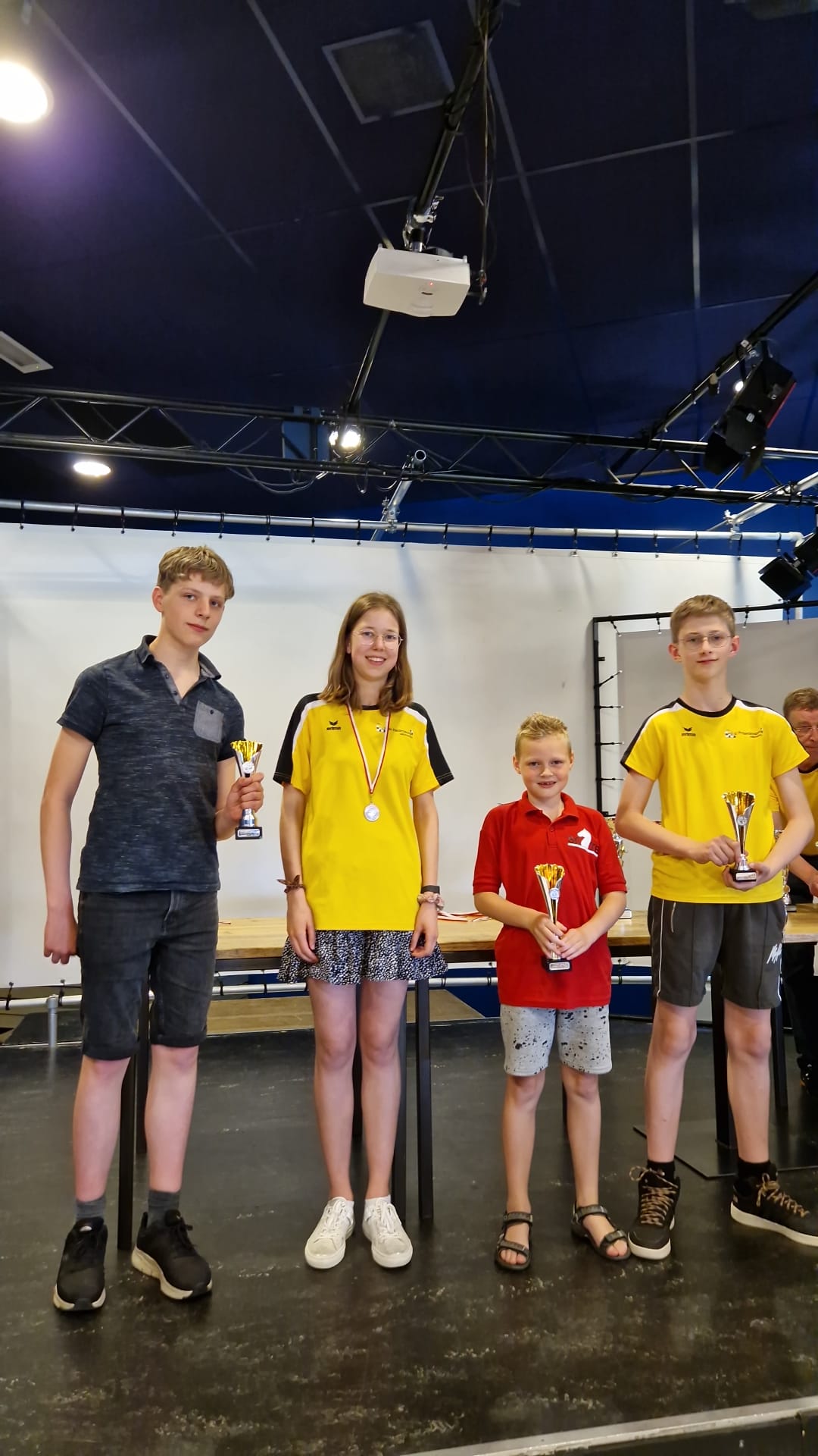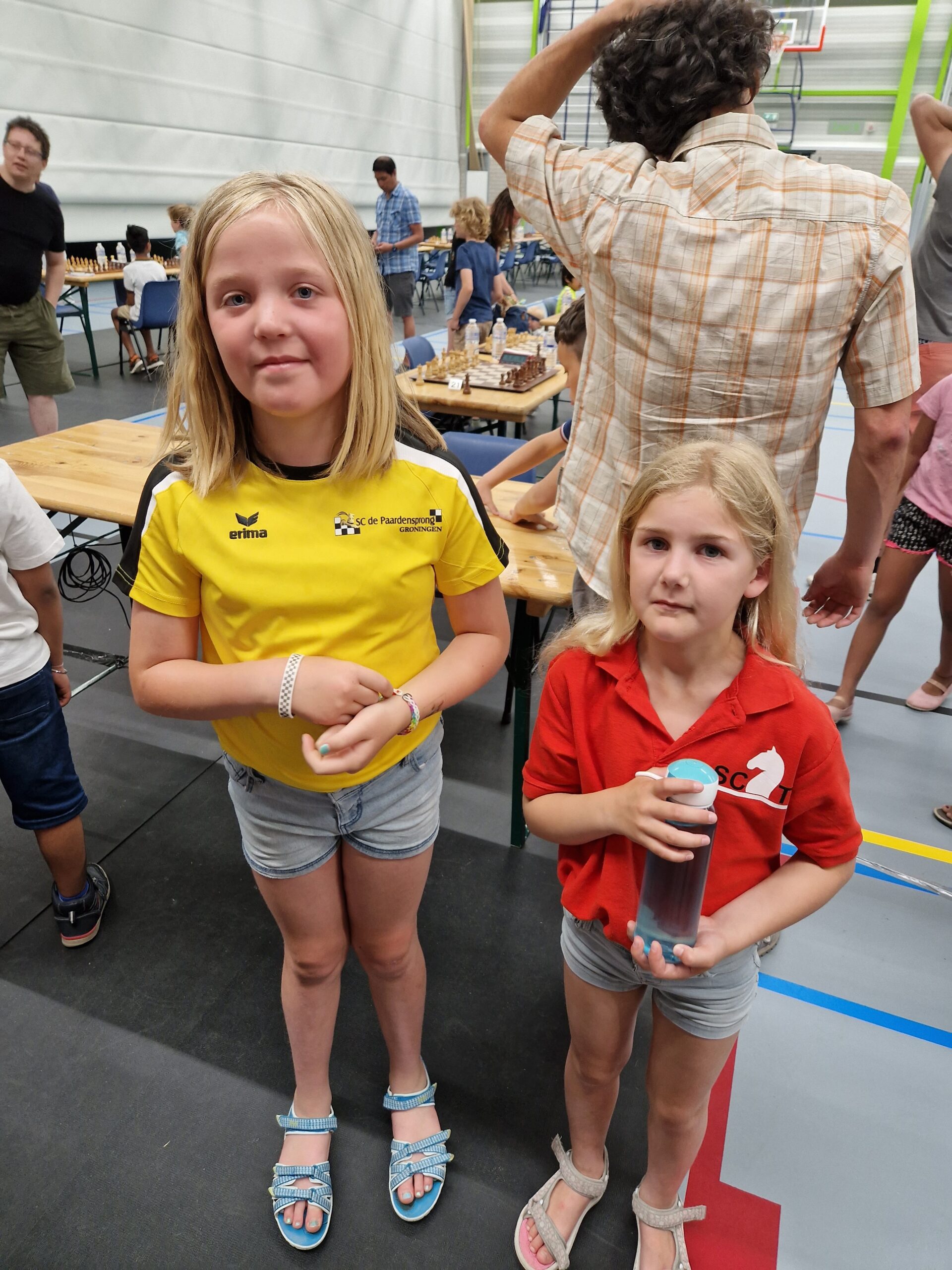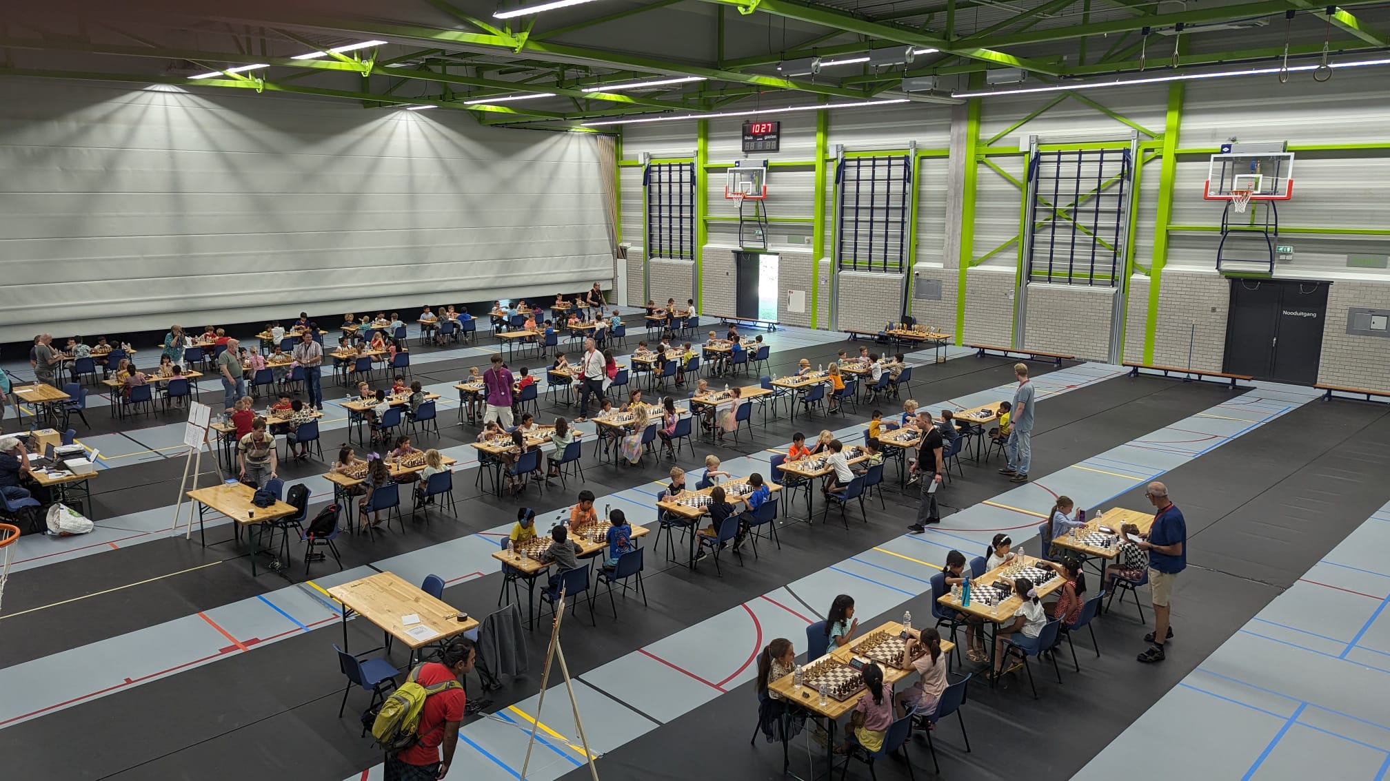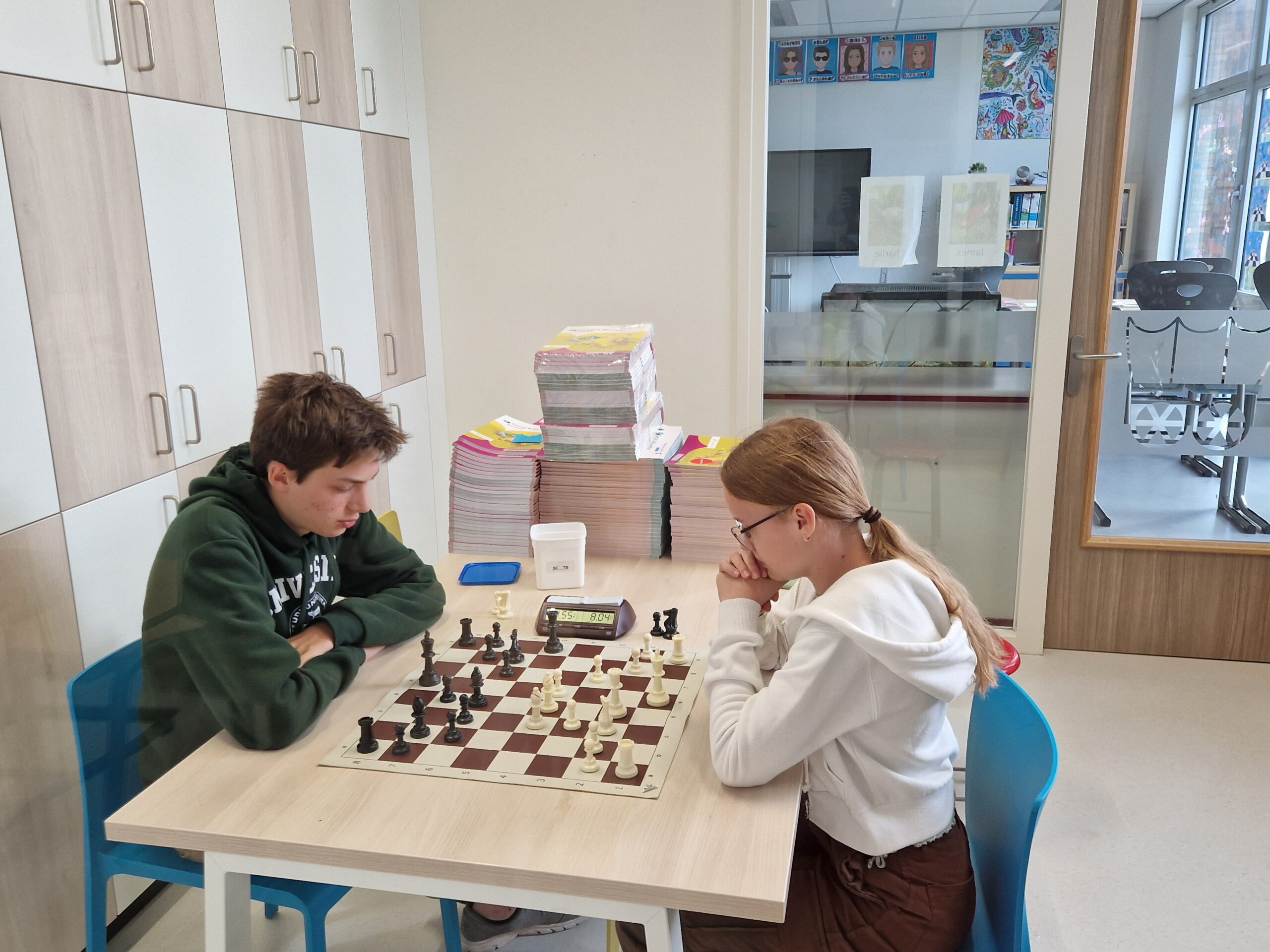 de laatste partijen in de speelzaal met Timo (!!), Lieke, Hannah en Sarah. En vermoedelijk zit Eline tegenover Sarah. Er werd dus goed gebruik gemaakt van de extra tijd op dit toernooi door onze spelers.