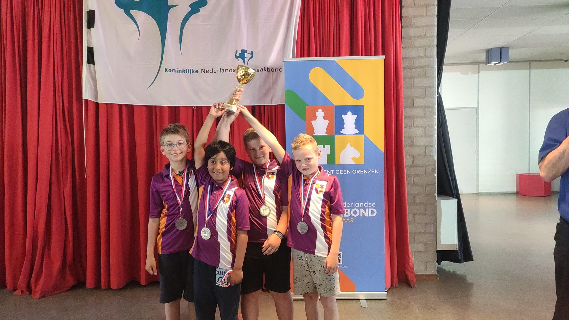 Bram was degene die team 1 op sleeptouw nam. Viaan moest op bord 1 de klappen opvangen, zodat Bram op bord 2 de punten kon binnenhalen en Theo en Deen het dan op bord 3 en 4 zouden kunnen afmaken. GSV stonden na dag 1 op de eerste plaats en na een gelijk spel tegen Den Bosch volgden twee overwinningen. Alleen ’t Karregat uit Eindhoven bleef op 1 matchpunt hangen. Het toernooi bleek helaas net twee ronden te lang. Eerst werd er verrassend van de Rembrandtschool uit Amstelveen verloren. Hierdoor kwam GSV precies gelijk te staan met ’t Karregat in match en bordpunten. De indeling in de laatste ronde was spannend. ’t Karregat mocht tegen de Michaëlschool uit Leeuwarden en GSV tegen de Scharn uit Maastricht. Helaas kwam GSV niet verder dan een gelijk spel en eindigde op de tweede plaats achter de school uit Eindhoven die nipt wist te winnen.