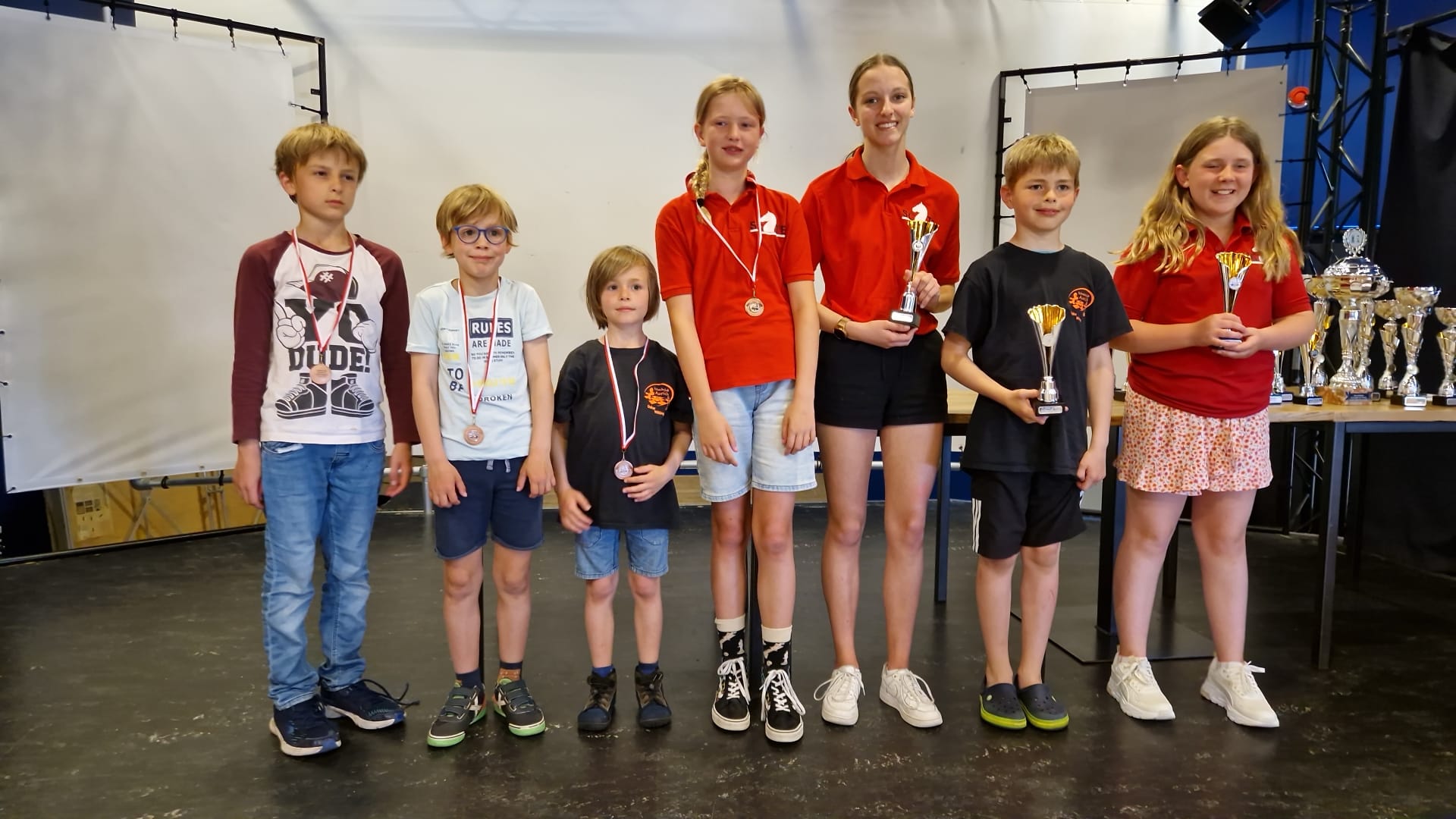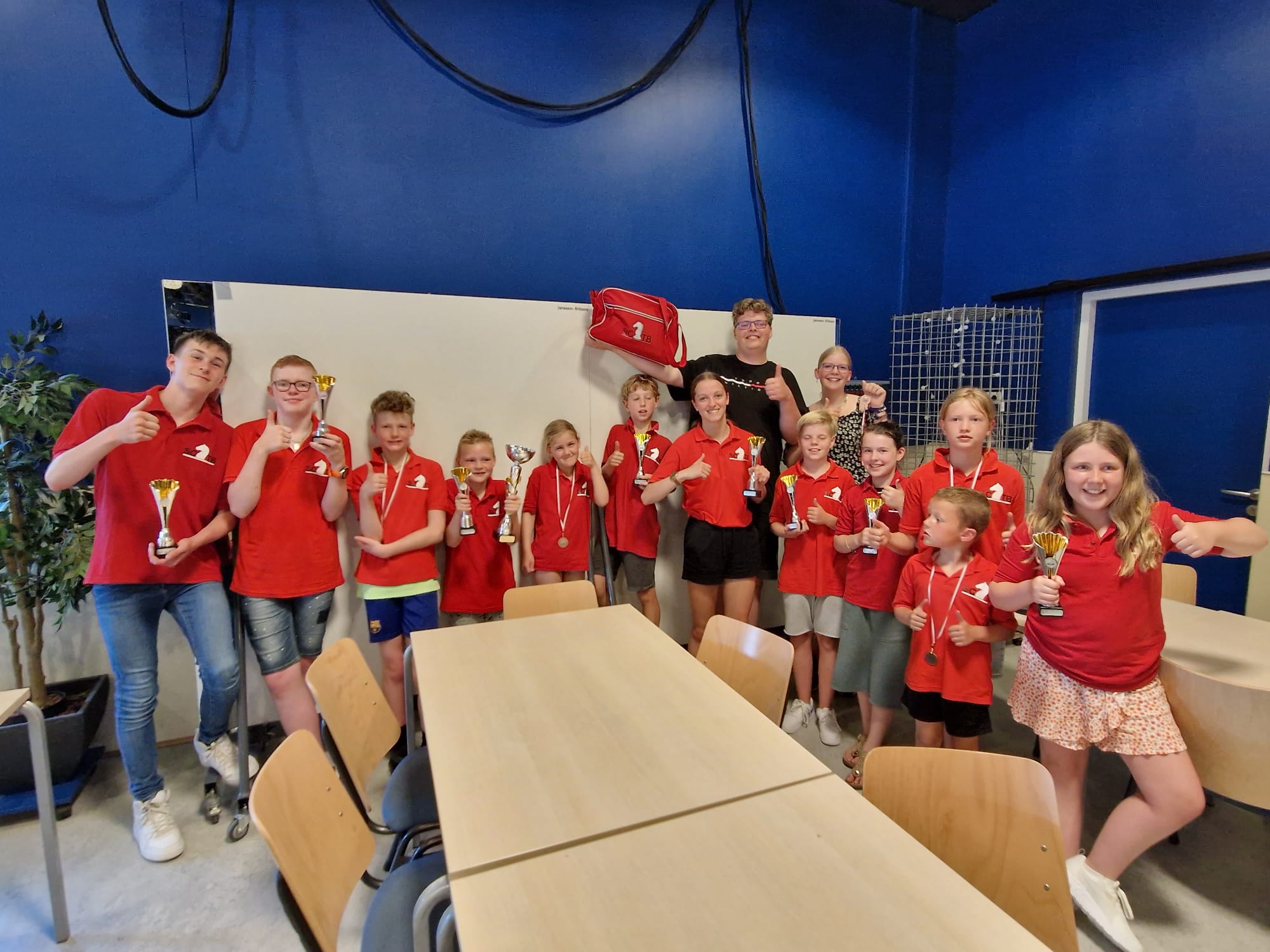 Er waren weer een vijftal diploma’s uit te delen. Op de foto staan 6 jeugdschakers, want Bram kon vorige week zijn diploma niet in ontvangst nemen. Ruben en Imre haalden hin stap 1 diploma met een 10! Paulien en Rafael haalden hun stap 1+ diploma. Altijd een moeilijke stap, de +-stappen. Dus extra knap dat het afgerond is.