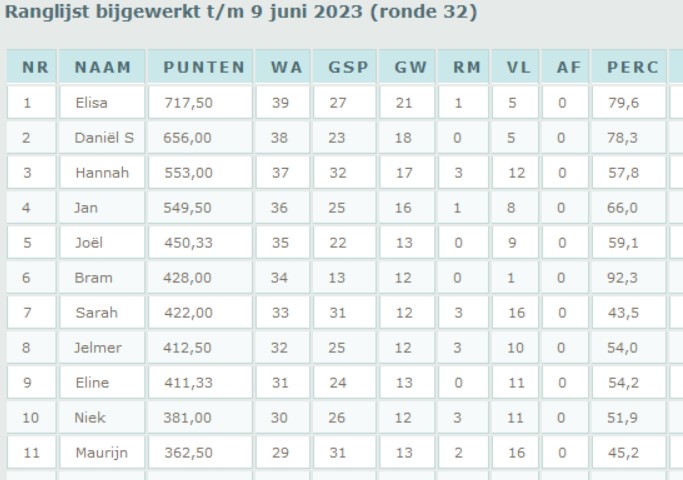De competitie in de VO-groep nadert de play offs. Gisteren was de op één na laatste middag waarin je je kan plaatsen voor de vierkamp om de titel. Elisa (periode 1) en Daniël S (periode 2) zijn hier al zeker van. De kampioen van periode 3 en de beste niet periodekampioen mogen ook deelnemen op 17 en 24 juni en 1 juli. De rest speelt dan de reguliere competitie verder om de plaatsen 5 t/m 25.