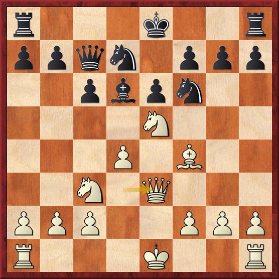 In deze stelling speelde Elisa 13… Pd5. Na afloop gaf ze aan dat ze 13… Pg4 14. Pxg4 Lxf4 15. Df3 overwoog. Dit is inderdaad beter dan het ruilen op d5, waarmee Sarah een gelijke stelling weet te krijgen. Ik gaf zelf 13… Ph5, maar de engine denkt dat wit na 14. g3 er beter aan toe is dan na de variant met 13… Pg4. De engine ziet echter ook een directe pionwinst met 13… Pxe5 (13… Lxe5 is niet goed vanwege 14. dxe5 Pg4?! 15. Dg3) 14. Lxe5 (14. dxe4 Pg4) 14… Lxe5 15. Dxe5 Dxe5+ 16. dxe5 Pg4 17. f4 Pe3. Wit mag niet rokeren vanwege het paard op e3 dus of c2 of g1 gaan verloren.