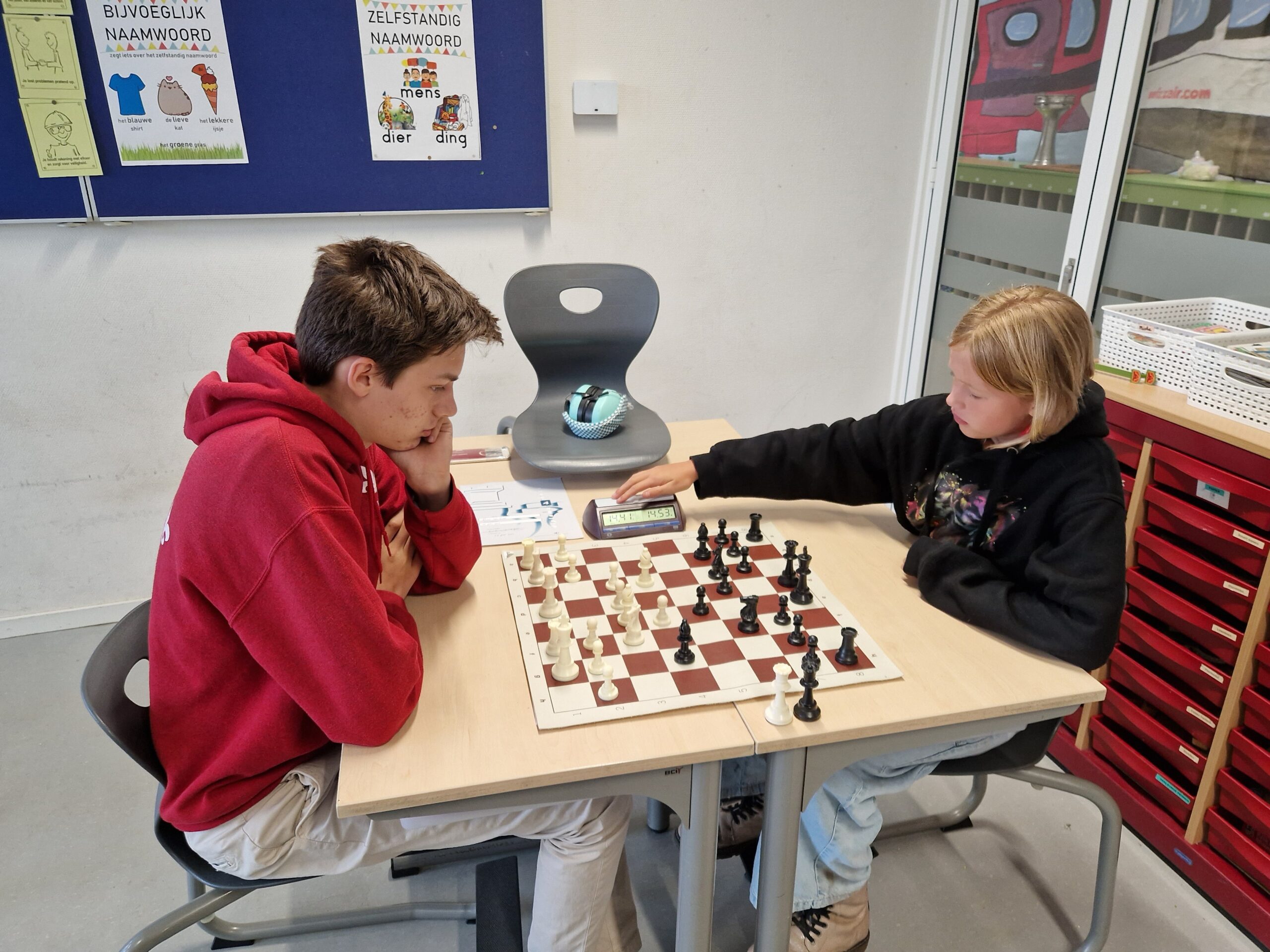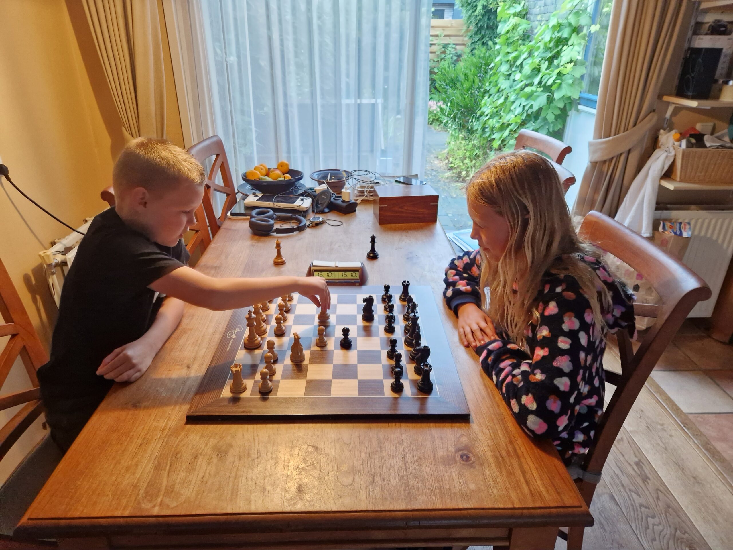 Ondertussen had Joël wel een paard gewonnen van Olaf. Helaas heb ik deze partij niet, maar Joël speelde het bekwaam en rustig uit 1-1.