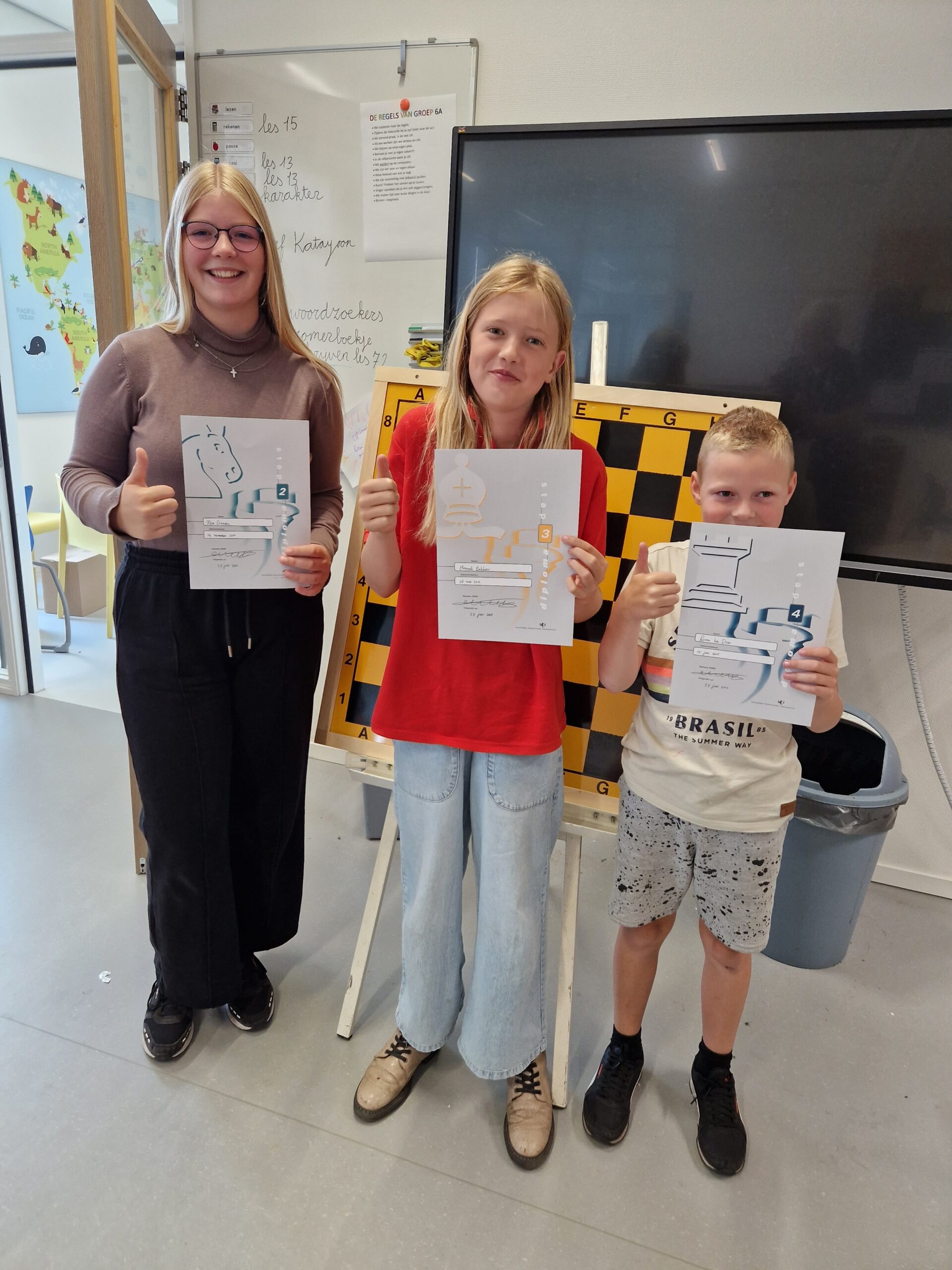 Op vrijdag zijn er altijd veel schaakactiviteiten in Ten Boer. Het begint op de Fontein met schaakles aan de pluskinderen. Daarna volgt de clubmiddag en soms, zoals volgende week vrijdag, volgt dan nog de Noordelijke Jeugd Competitie. Afgelopen vrijdag werden de nodige diploma’s uitgereikt. Zo haalden Sven, Noud en Daan op de Fontein hun stap 1 diploma.