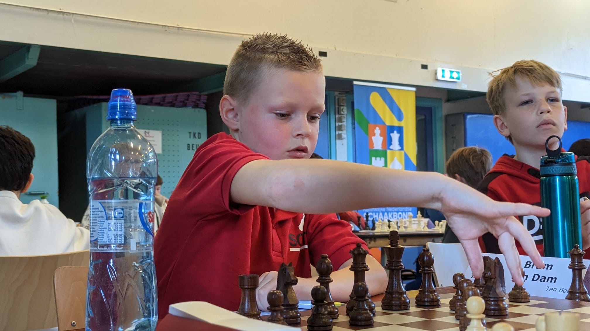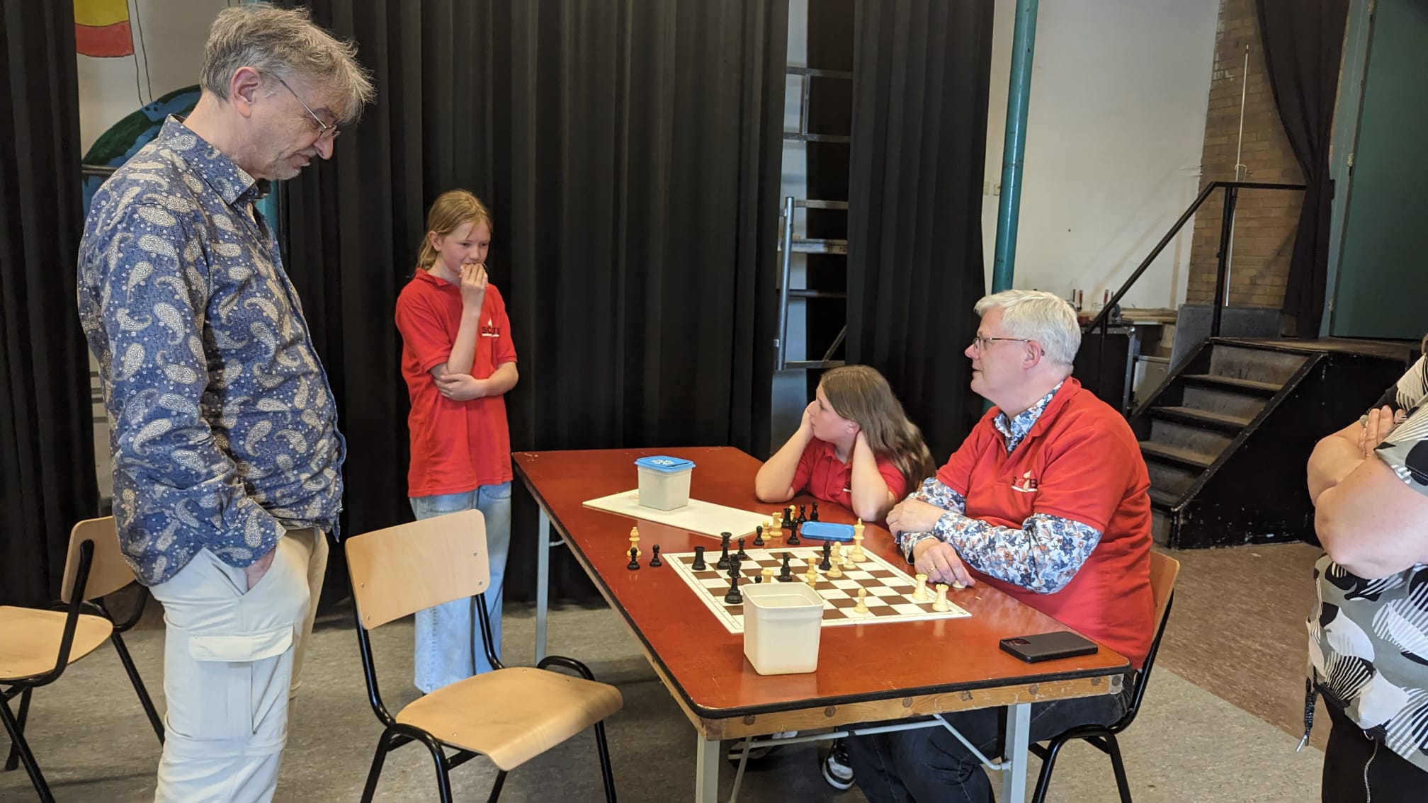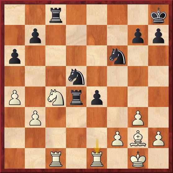 Hier is 32. Pf7+ Kg8 33. Pg5 interessant. Het paard en de loper dreigen op e6 binnen te komen. Er werd echter 32. Le6 gespeeld en Bram speelde 32… Pd3 Hier had hij zich verzekerd van het feit dat wit geen aftrekaanval zou hebben na 33. Pf7+ Kg8 (33… Txf7 34. Tc8+ met mat), maar na 34. Tc7 is de zwarte stelling hopeloos… Er gebeurde echter 33. Pxd3 exd3 en opeens is de stelling erg gevaarlijk voor wit. Wit bood remise aan en het werd aangenomen. Maar wit moet uiterst voorzichtig zijn. Alleen 33. Te3 d2 34. Td1 houdt de balans.