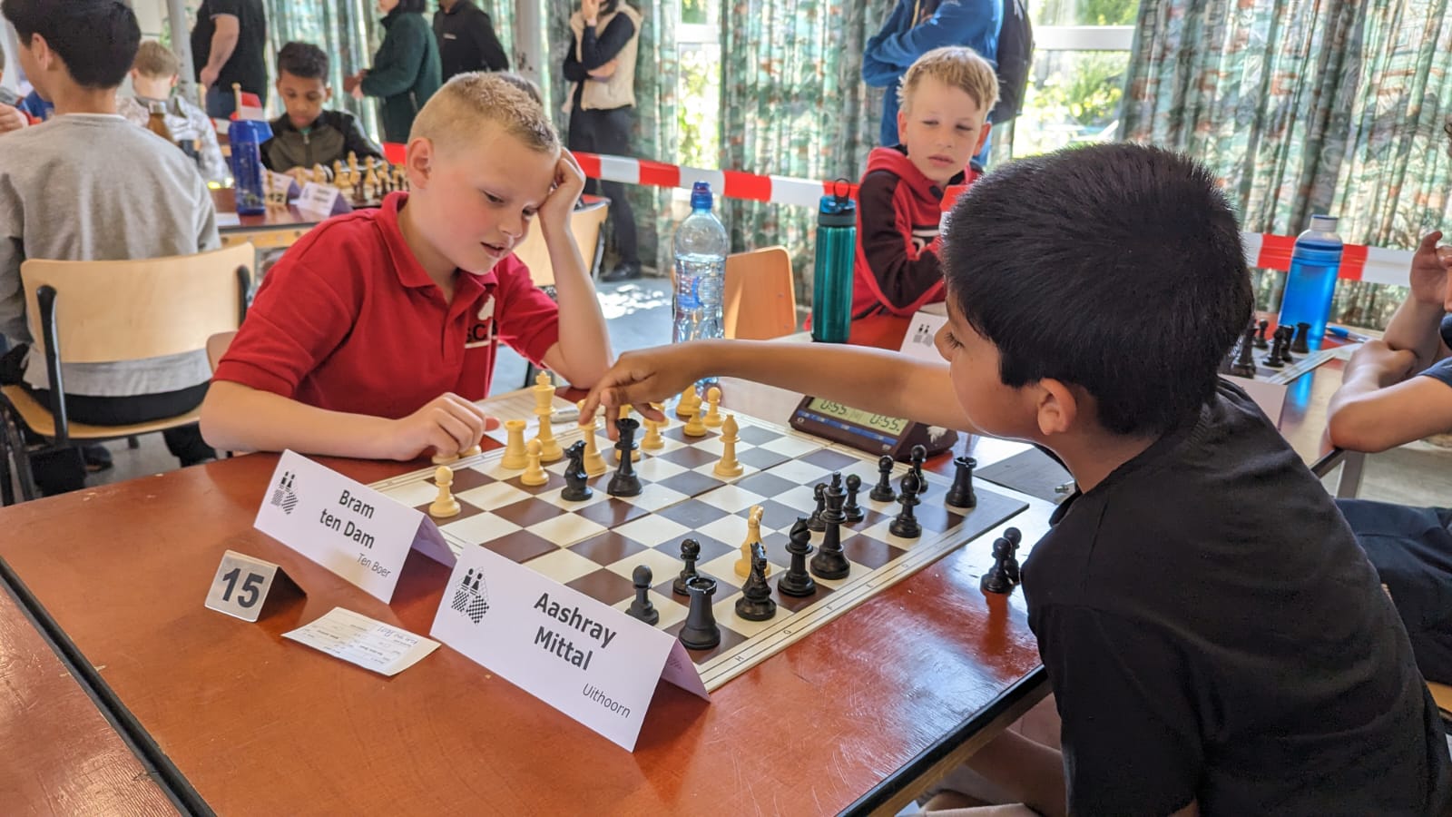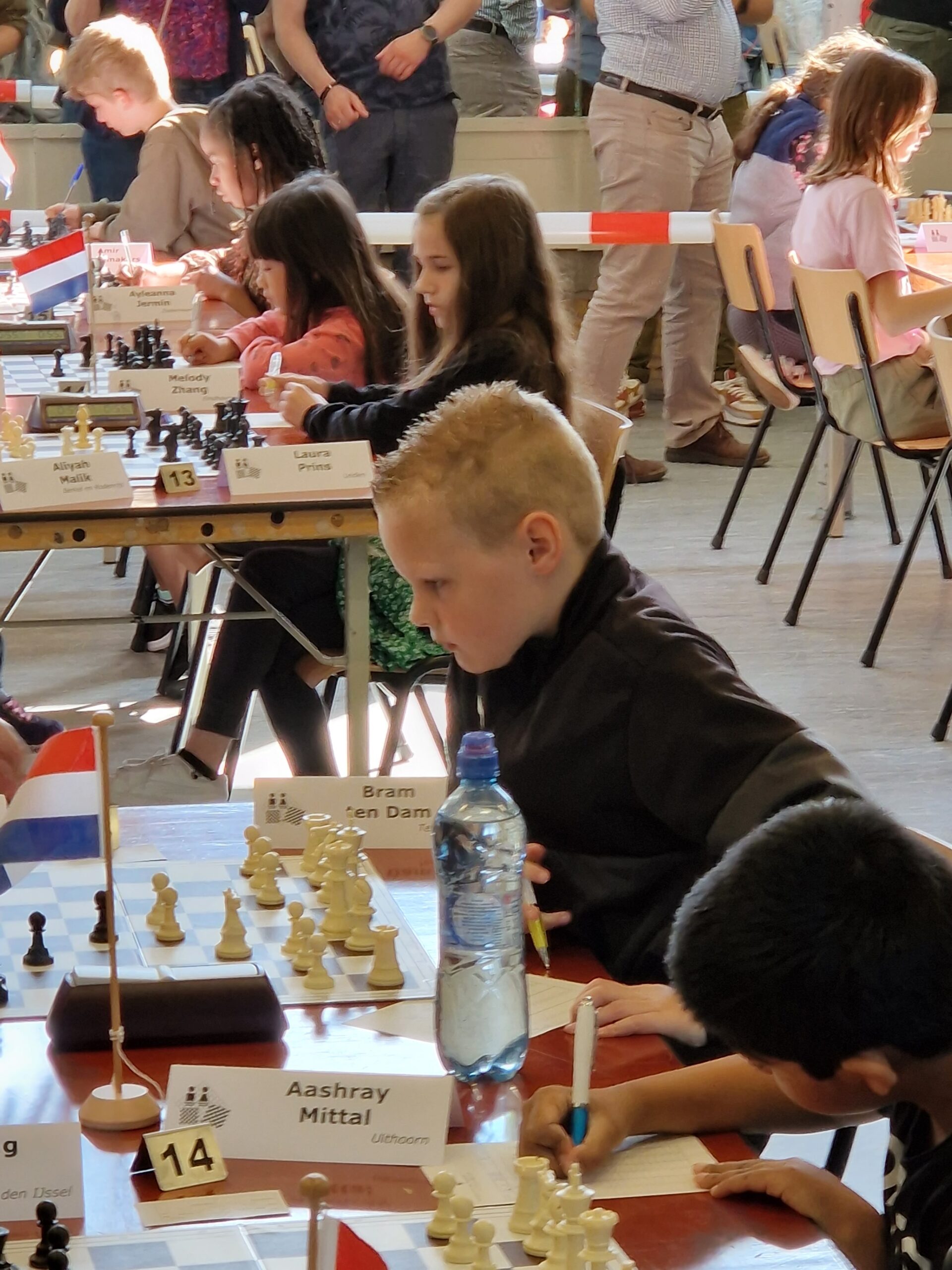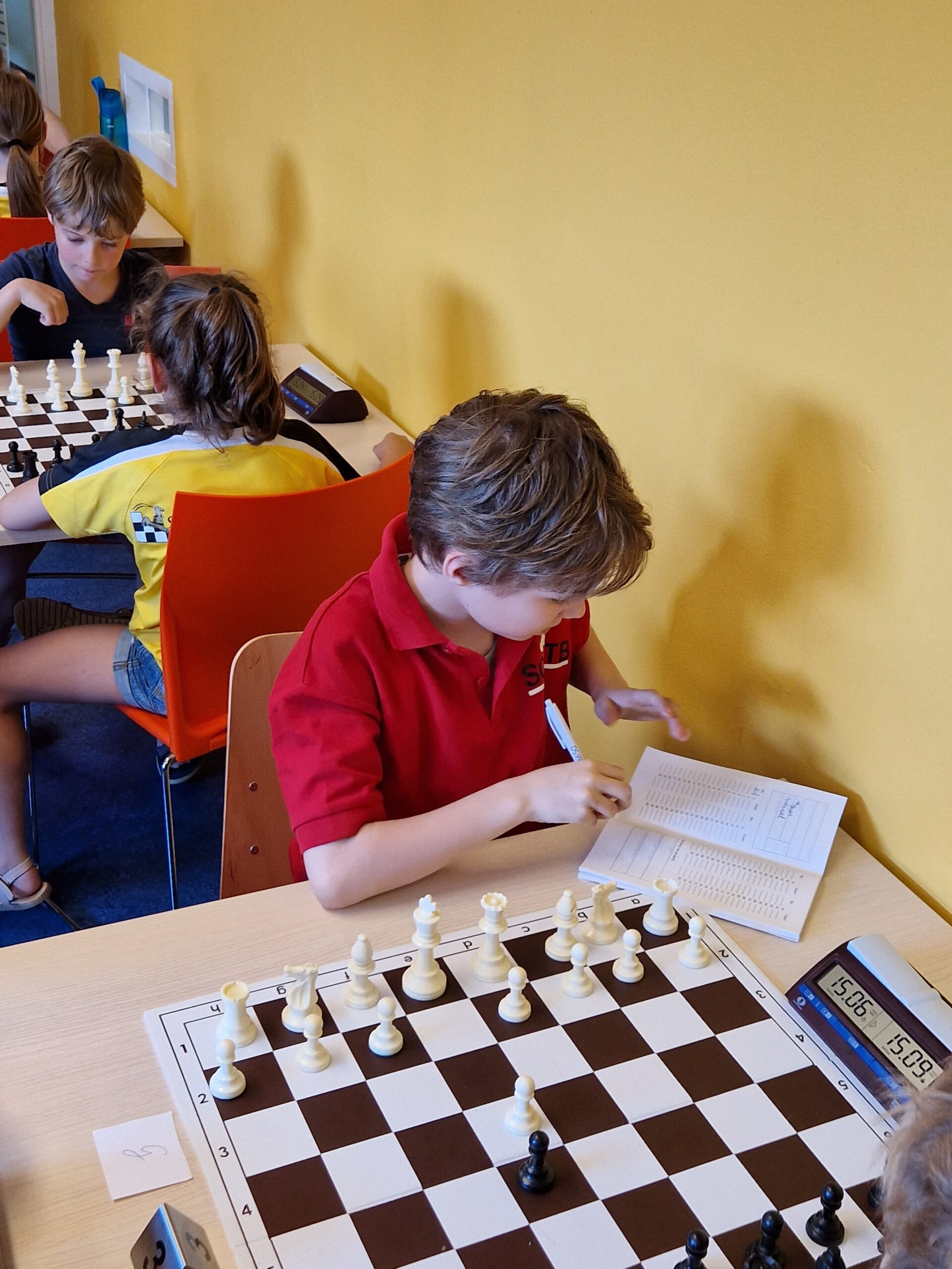 Hier is 32. Pf7+ Kg8 33. Pg5 interessant. Het paard en de loper dreigen op e6 binnen te komen. Er werd echter 32. Le6 gespeeld en Bram speelde 32… Pd3 Hier had hij zich verzekerd van het feit dat wit geen aftrekaanval zou hebben na 33. Pf7+ Kg8 (33… Txf7 34. Tc8+ met mat), maar na 34. Tc7 is de zwarte stelling hopeloos… Er gebeurde echter 33. Pxd3 exd3 en opeens is de stelling erg gevaarlijk voor wit. Wit bood remise aan en het werd aangenomen. Maar wit moet uiterst voorzichtig zijn. Alleen 33. Te3 d2 34. Td1 houdt de balans.