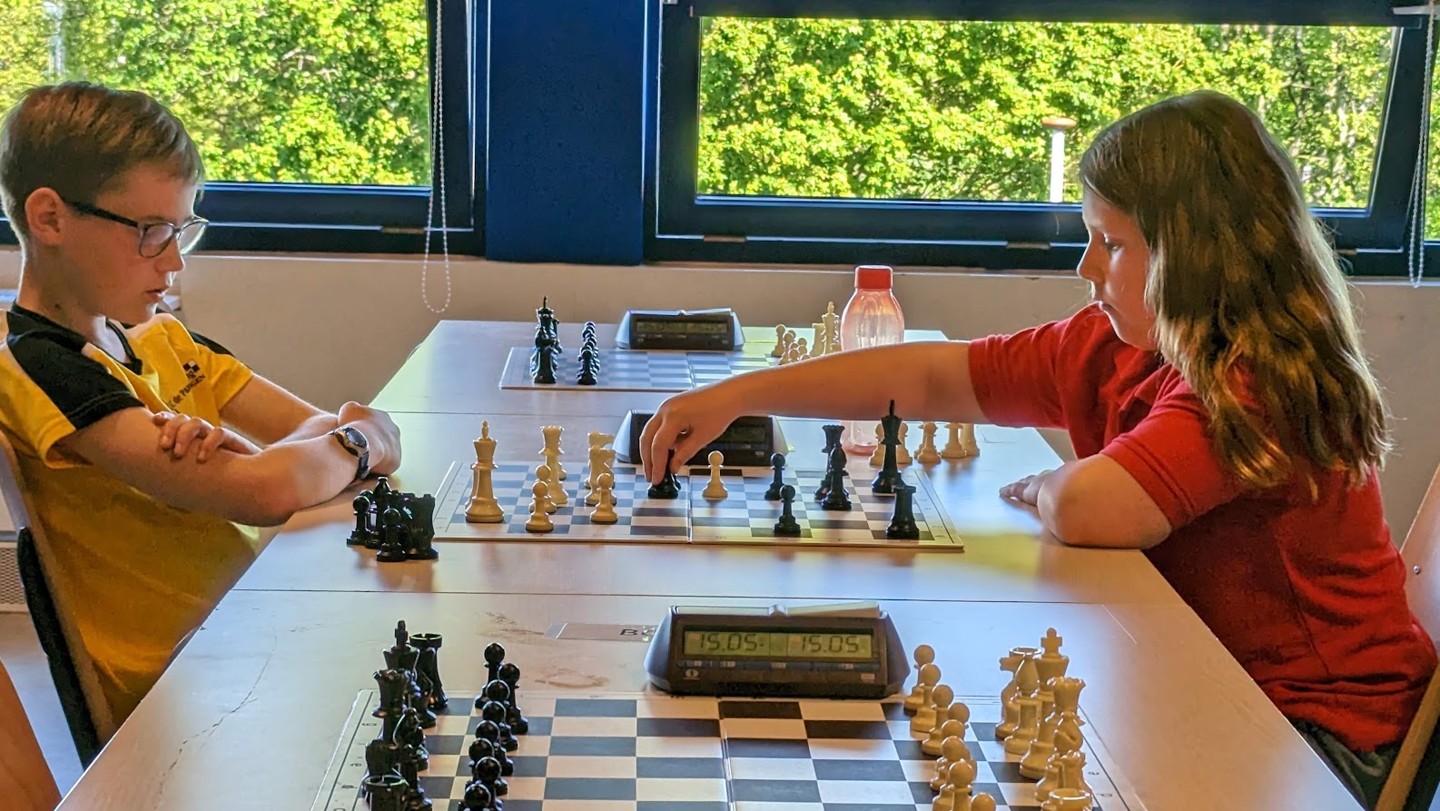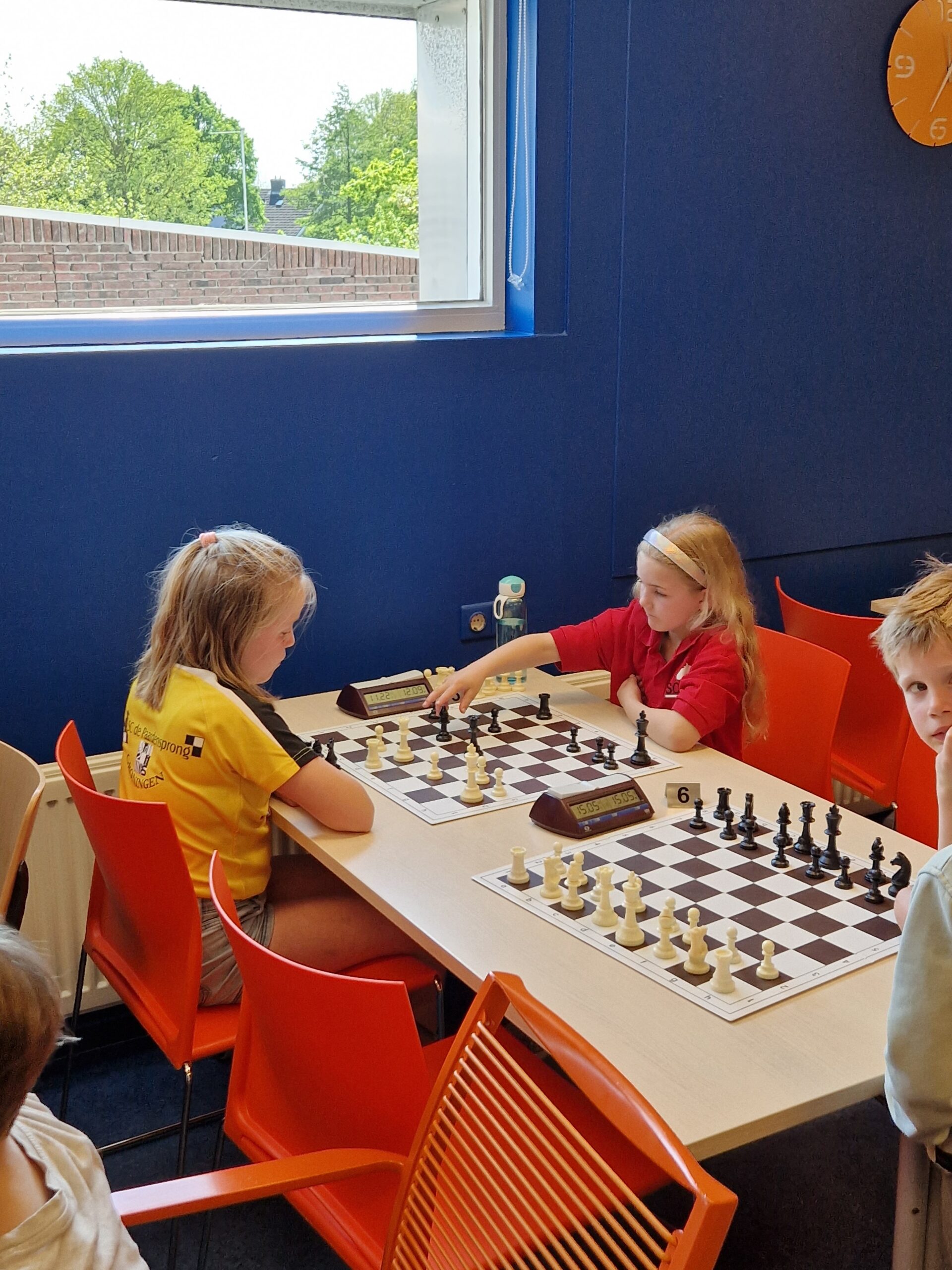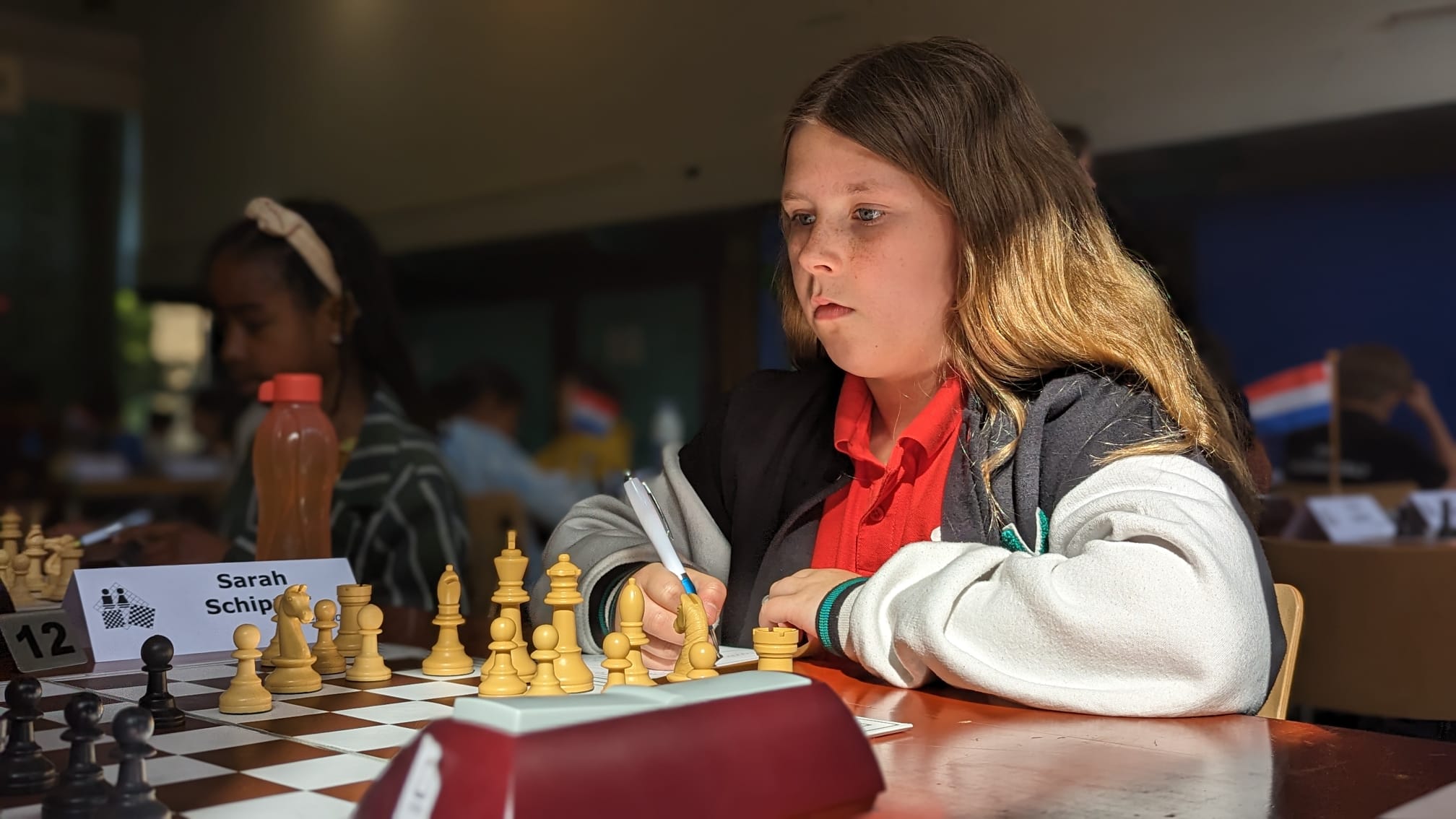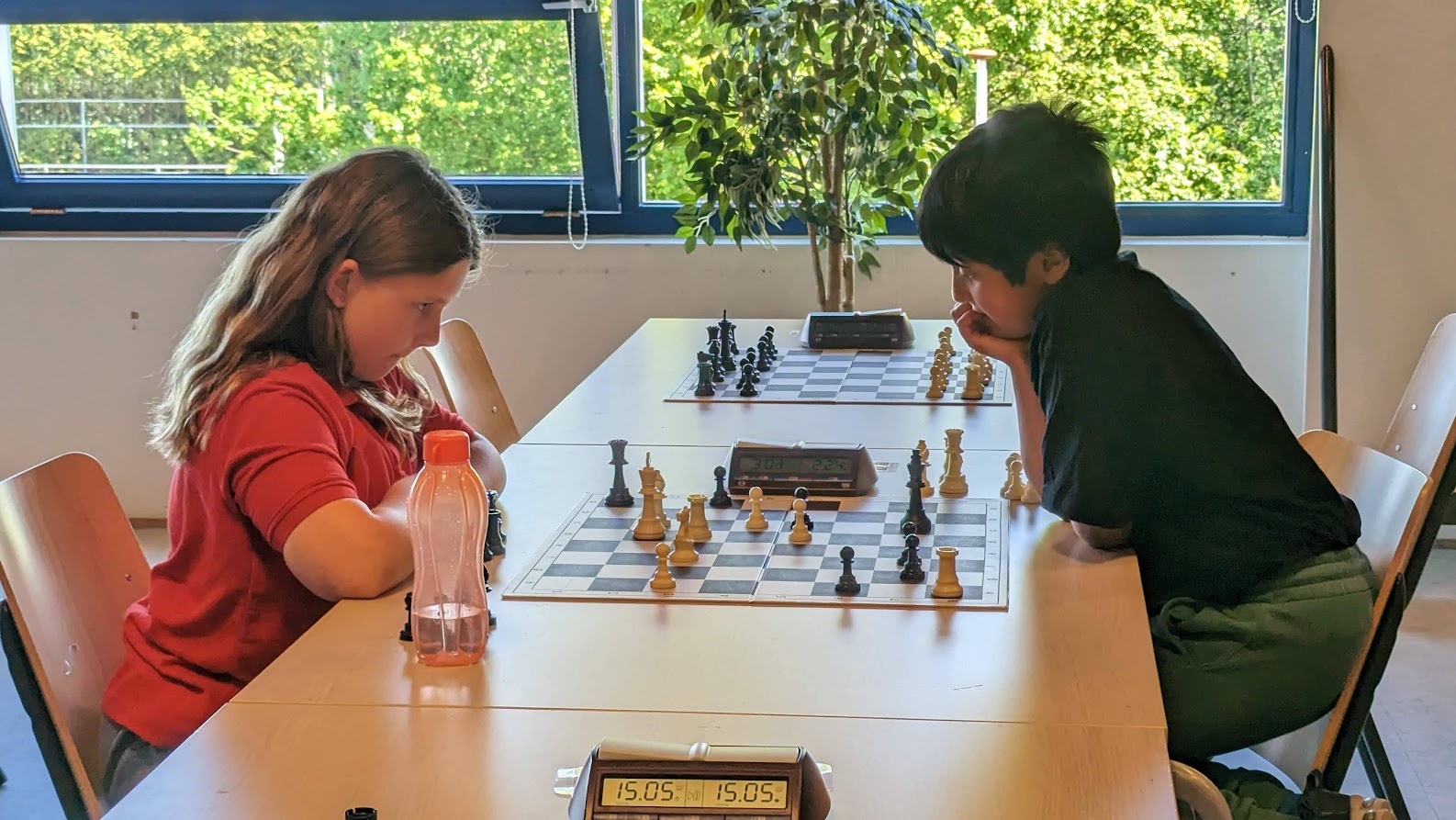Het is een plaatje: alle stukken van zwart werken mee met de aanval en er dreigt naast Lxf3 ook e4 en Pe5, bijvoorbeeld 23. Kh1 (om uit de penning te gaan) 23… Dg6 (dreigt de koning met Dh5+ weer terug te jagen naar de penning over de g-lijn) 24. g3 (om met de koning het paard op f3 te dekken) 24… Dh5+ 25. Kg2 e4 (daar komt hij!) 26. dxe4 Pe5 en de witte stelling stort in. Een prachtig voorbeeld van penningen die er voor zorgen dat de witte stukken de koning niet meer kunnen helpen. In plaats daarvan speelde Hannah 22… Dg7 23. Thd1 Lh3? en nu kreeg wit net de tijd om de verdediging op orde te brengen met 24. Pe1