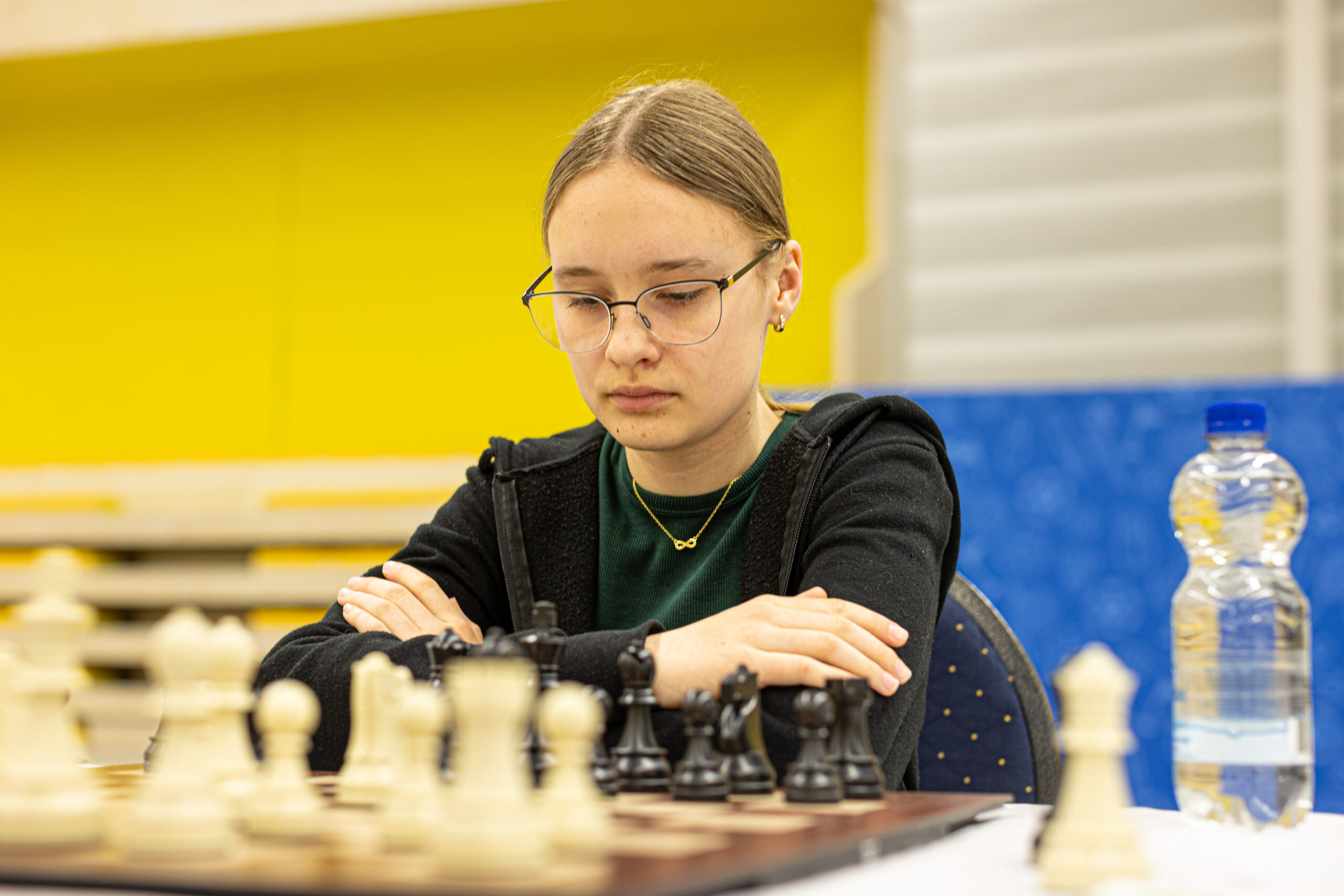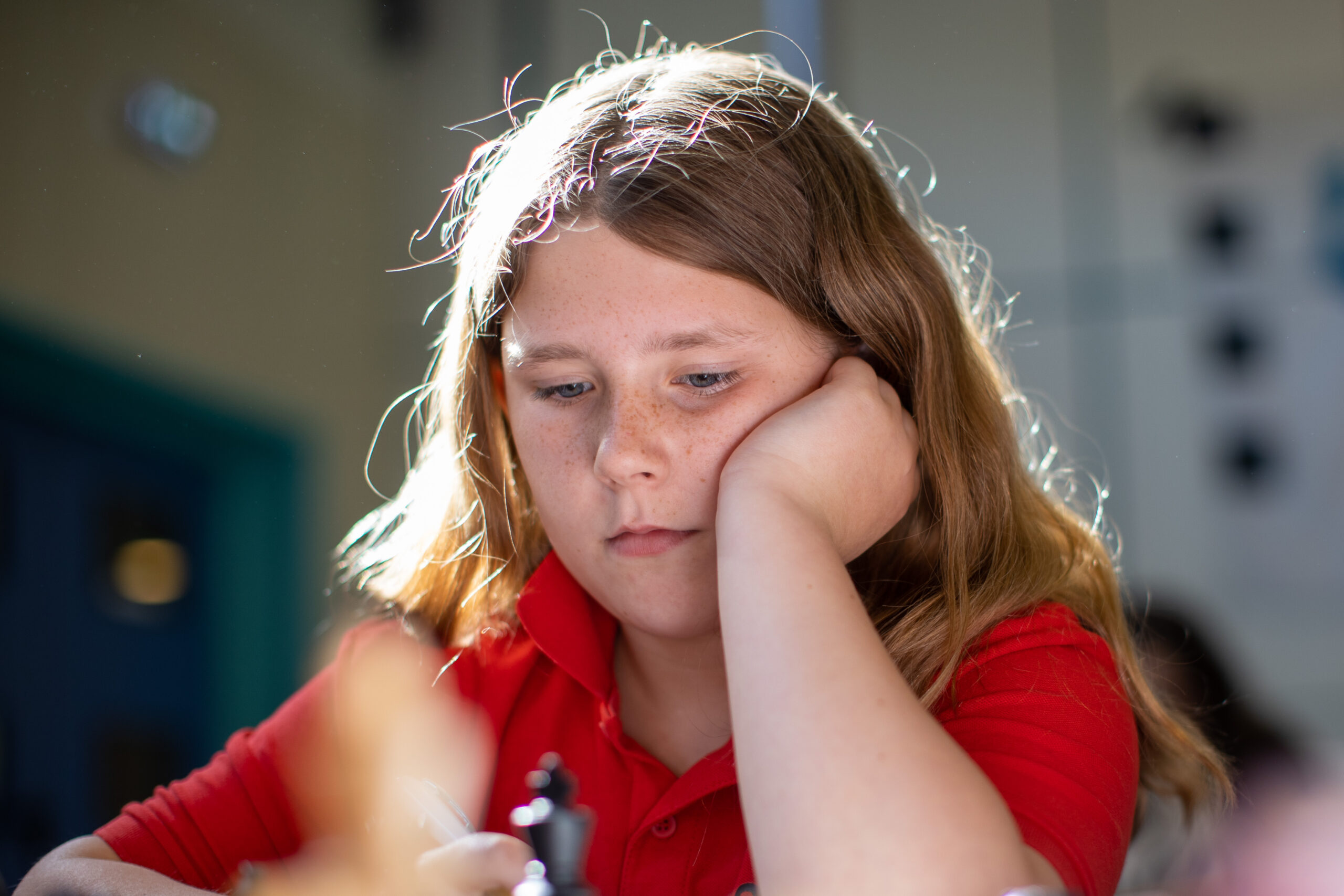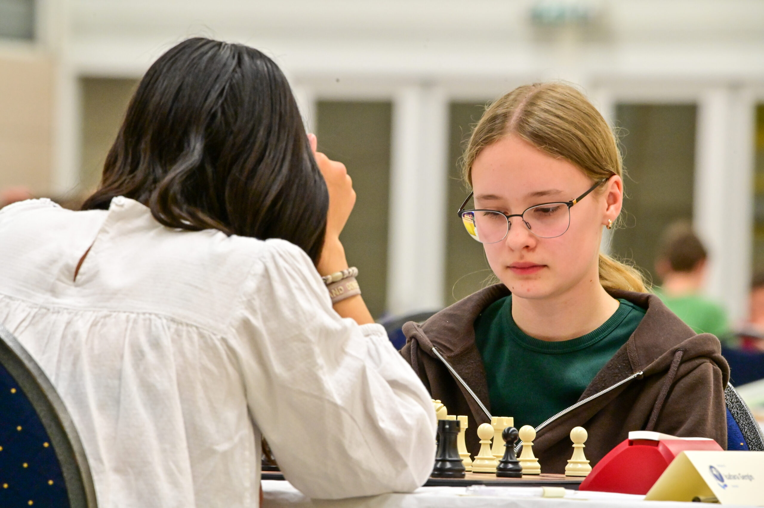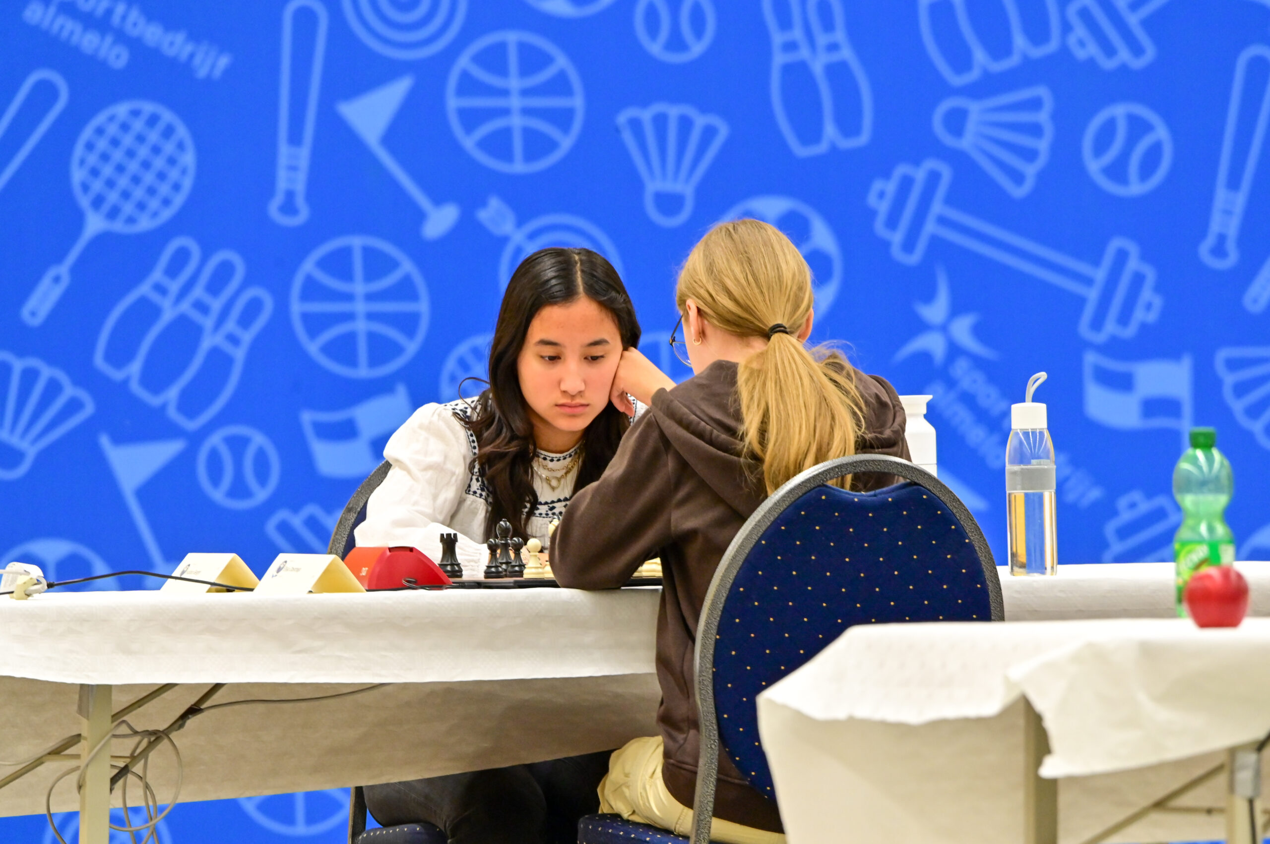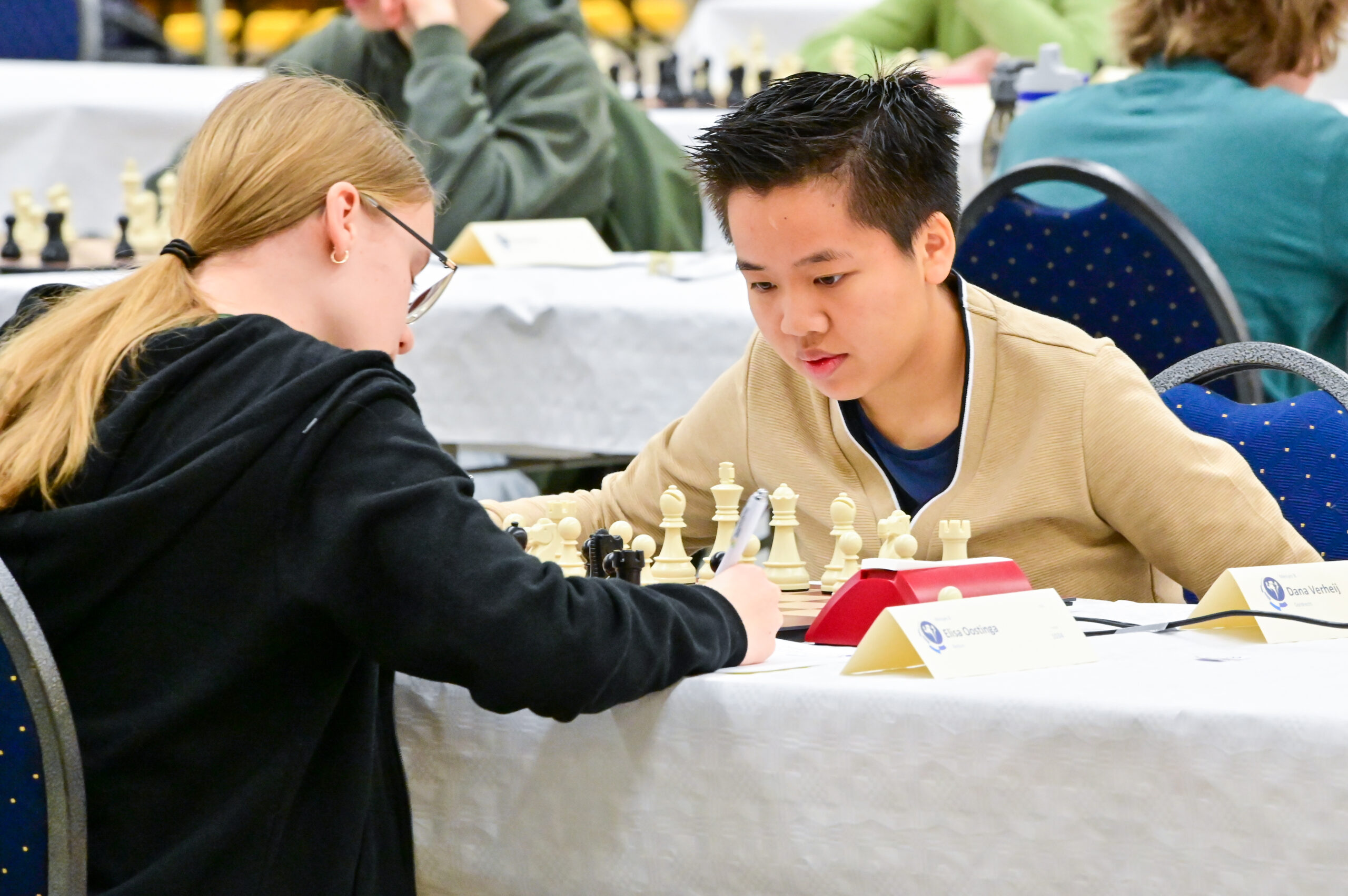 Het is een plaatje: alle stukken van zwart werken mee met de aanval en er dreigt naast Lxf3 ook e4 en Pe5, bijvoorbeeld 23. Kh1 (om uit de penning te gaan) 23… Dg6 (dreigt de koning met Dh5+ weer terug te jagen naar de penning over de g-lijn) 24. g3 (om met de koning het paard op f3 te dekken) 24… Dh5+ 25. Kg2 e4 (daar komt hij!) 26. dxe4 Pe5 en de witte stelling stort in. Een prachtig voorbeeld van penningen die er voor zorgen dat de witte stukken de koning niet meer kunnen helpen. In plaats daarvan speelde Hannah 22… Dg7 23. Thd1 Lh3? en nu kreeg wit net de tijd om de verdediging op orde te brengen met 24. Pe1