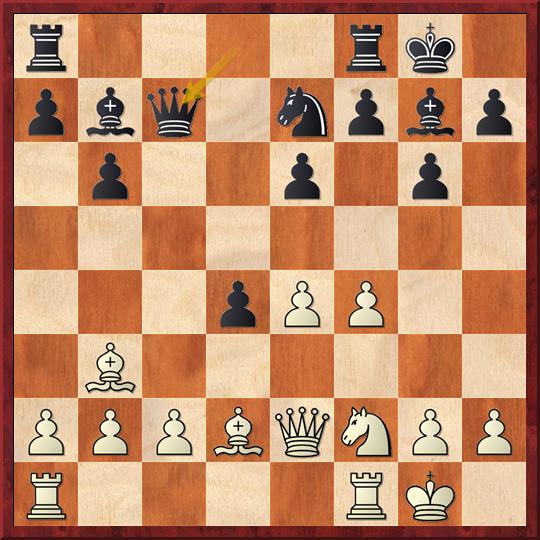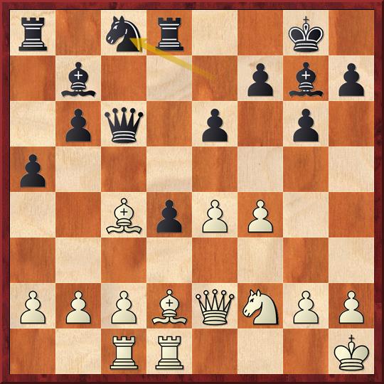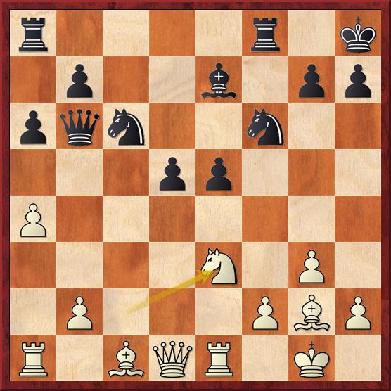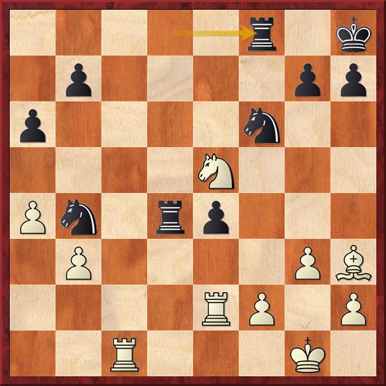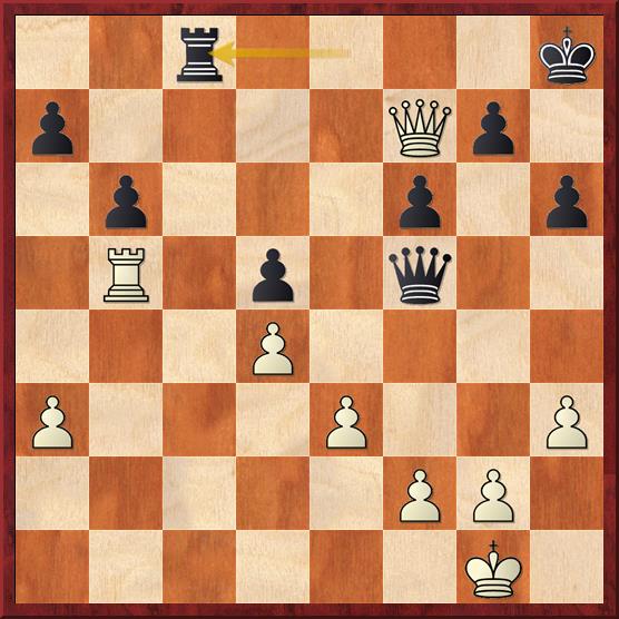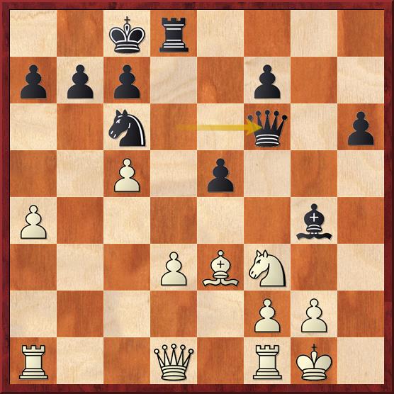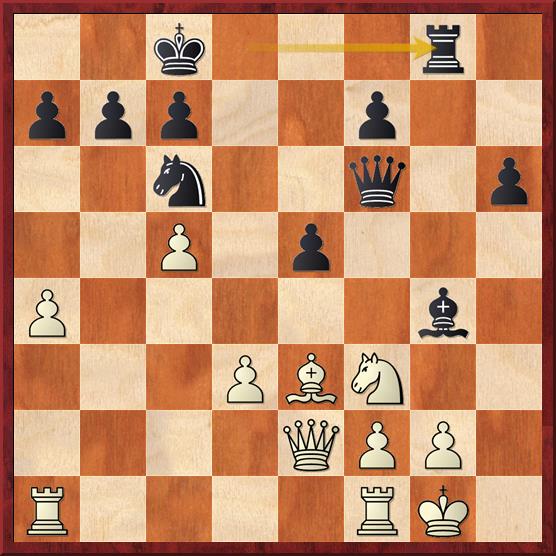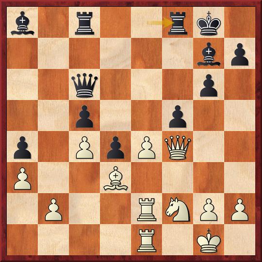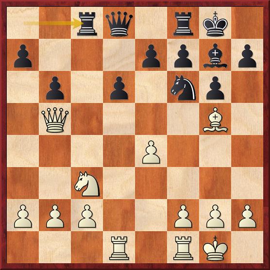 In deze stelling speelde Hannah 20… Td8 met het idee om gebruik te maken van de dame op d1 om e5-e4 te spelen. Ten eerste heb je dan de penning op het paard op f3, maar e4 ruimt ook veld e5 voor het paard op c6. Daarentegen kan wit tegenkansen langs de b-lijn ontwikkelen. In deze stelling zou 20… Tg8 trouwens hetzelfde idee in de stelling brengen. Er dreigt dan direct 21… e4 22. dxe4 Dxd1 23. Tfxd1 Lxf3, want nu heb je niet alleen met de penning op het paard te maken maar ook met de penning over de g-lijn. Wit speelde 21. c5?! Beter is proberen het paard te ontpennen met 21. Tb1 en Db3 (tegenaanval op b7). De engine geeft overigens 21. Te1 met betere stelling voor wit. Na 21… Df6! wordt de stelling van wit echt precair. Wit reageerde verkeerd met 22. De2 en nu had Hannah met met 22… Tg8 een winnende stelling kunnen bereiken.
