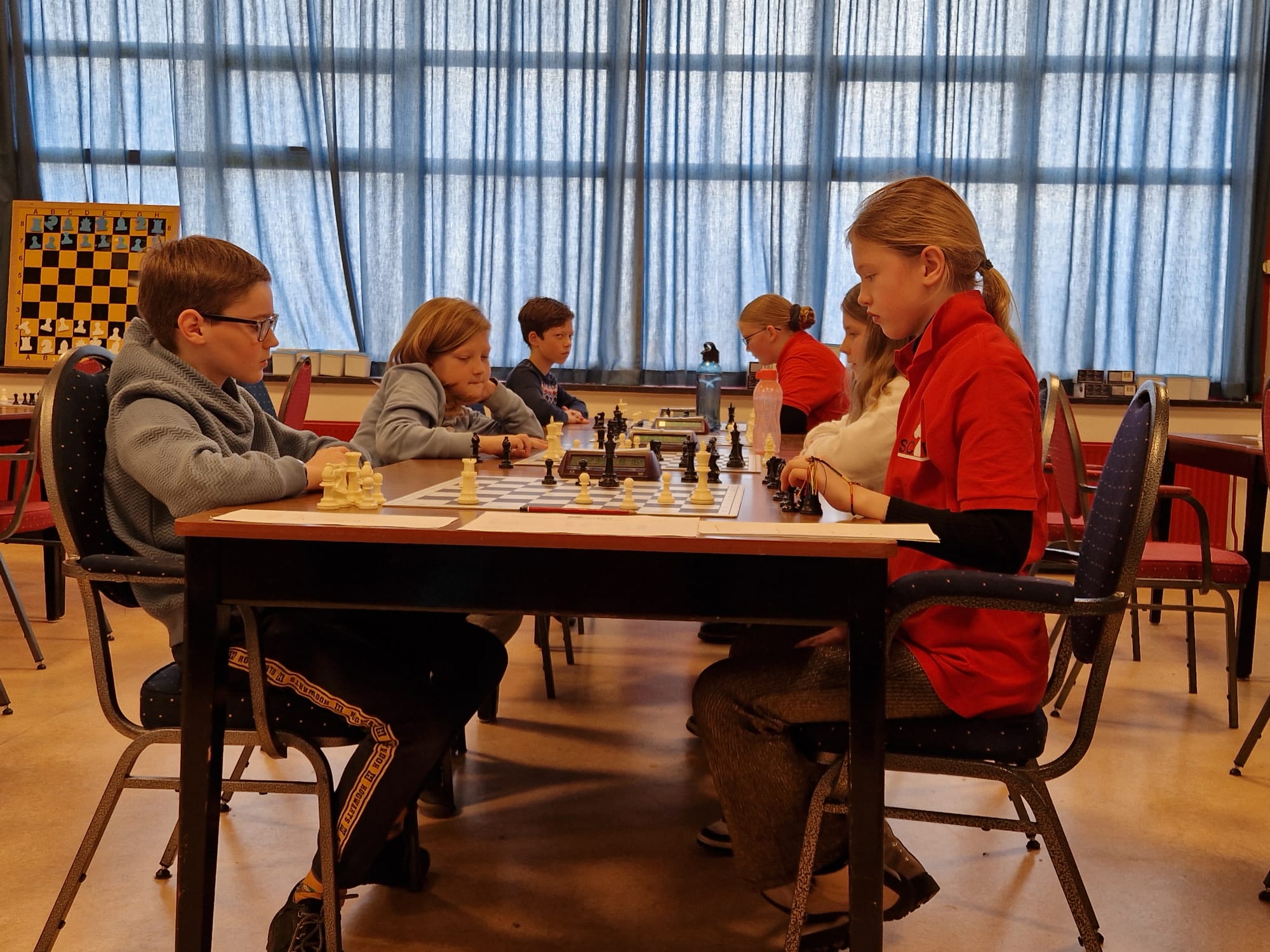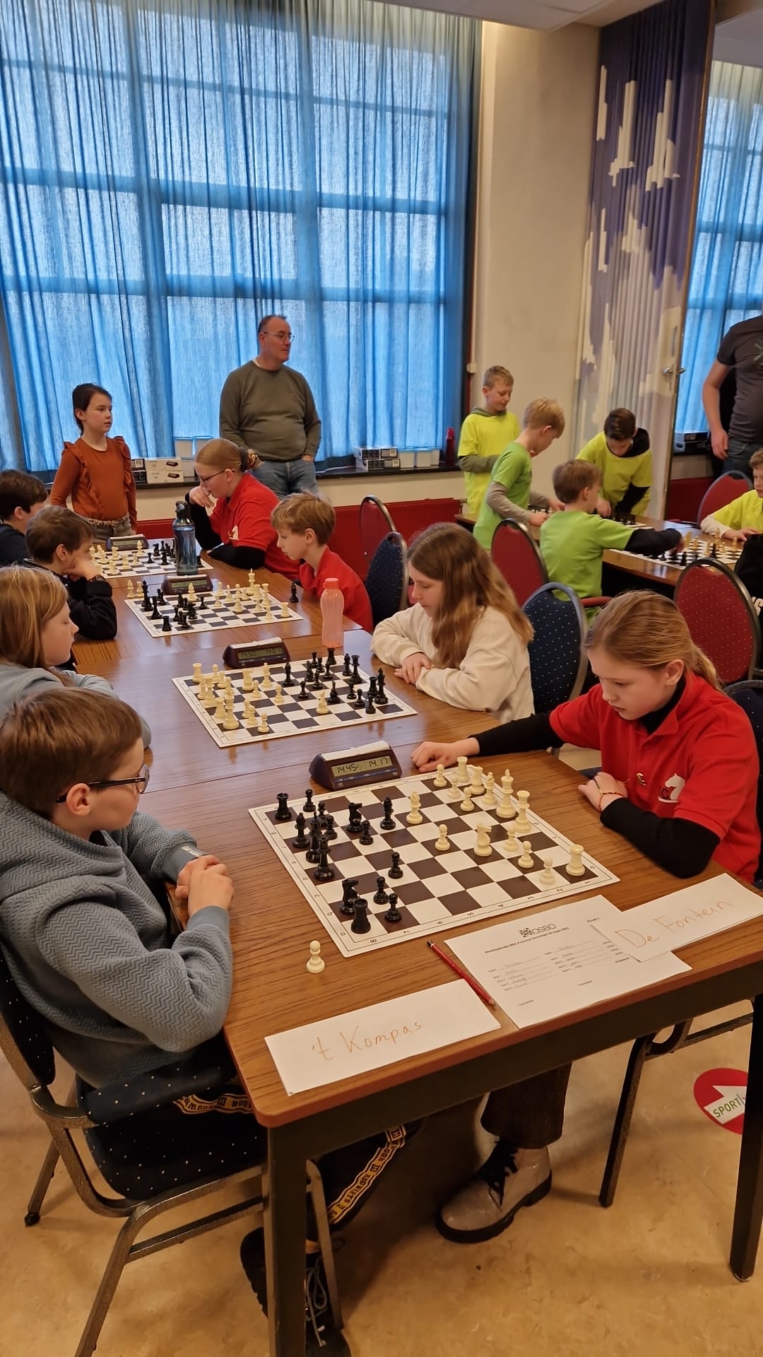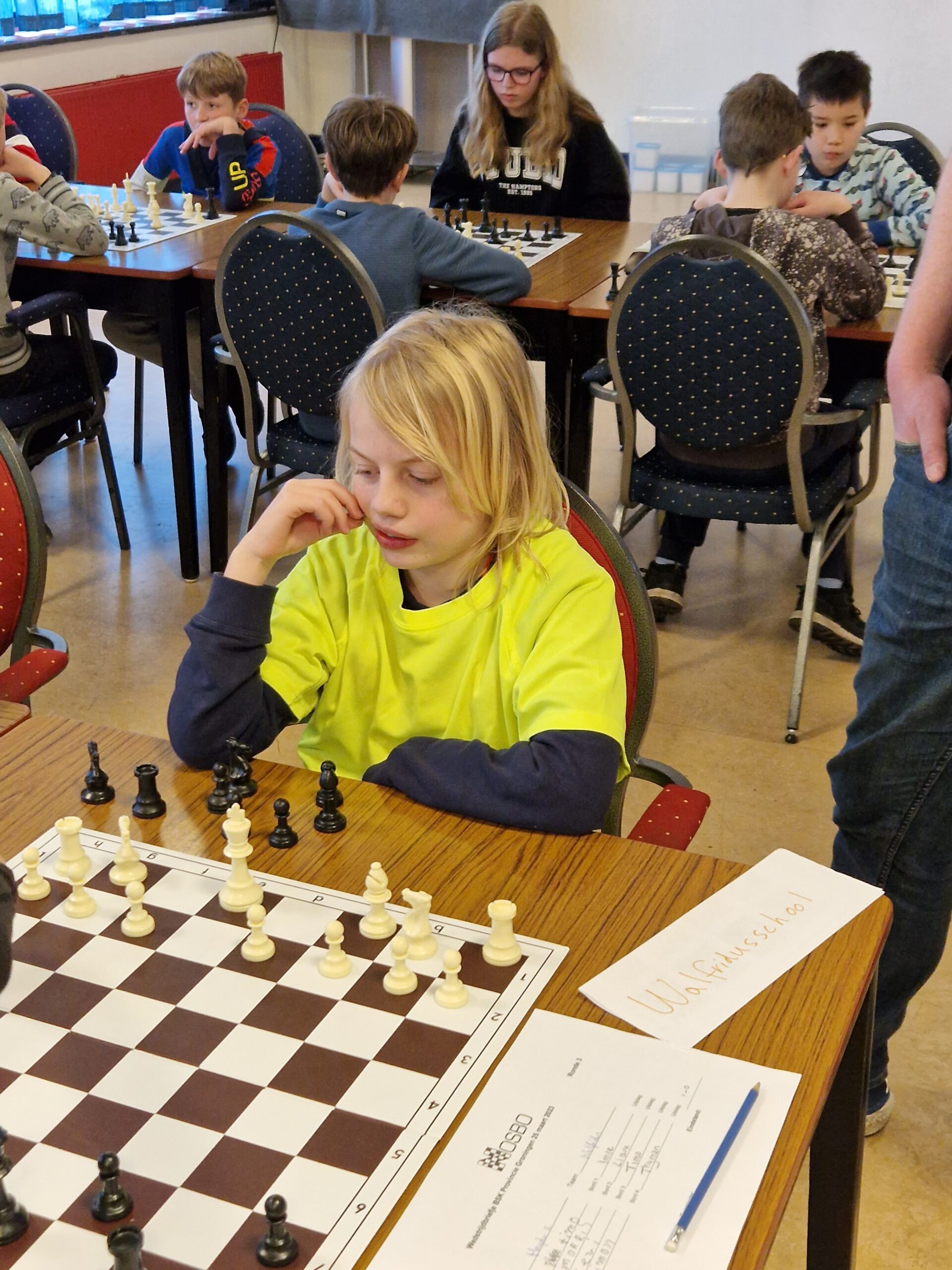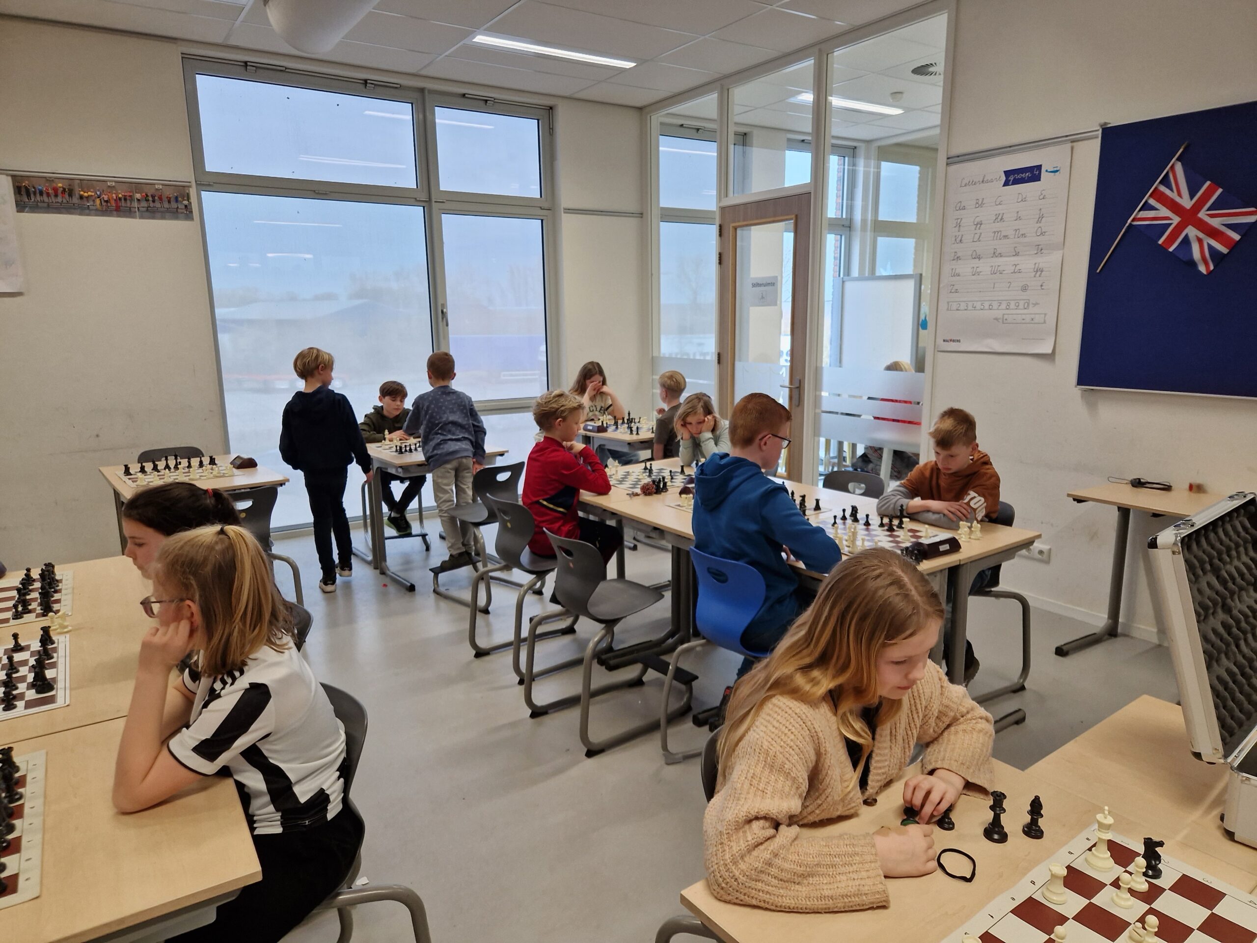 Vanmiddag was het BSK van de stad en de provincie Groningen in het Denksport Centrum. Er deden 15 teams van 12 scholen mee, dus zeg maar iets meer dan 60 jeugdschakers. Bijzonder voor onze club is dat er maar liefst tien clubleden bij vier scholen meededen en dat daarnaast Liva en Evie ook de hele middag aanwezig waren. Liva had gisteravond alle stukken opgesteld. Verder speelden Bram en Thijmen bij GSV1 resp. GSV2. Timo en Imre deden het geweldig bij de Walfridusschool uit Bedumen Isa speelde mee bij ’t Kompas uit Lewenborg. De meeste clubleden speelden mee bij de Fontein uit Ten Boer: Paulien, Noa, Joris, Sarah en Hannah.