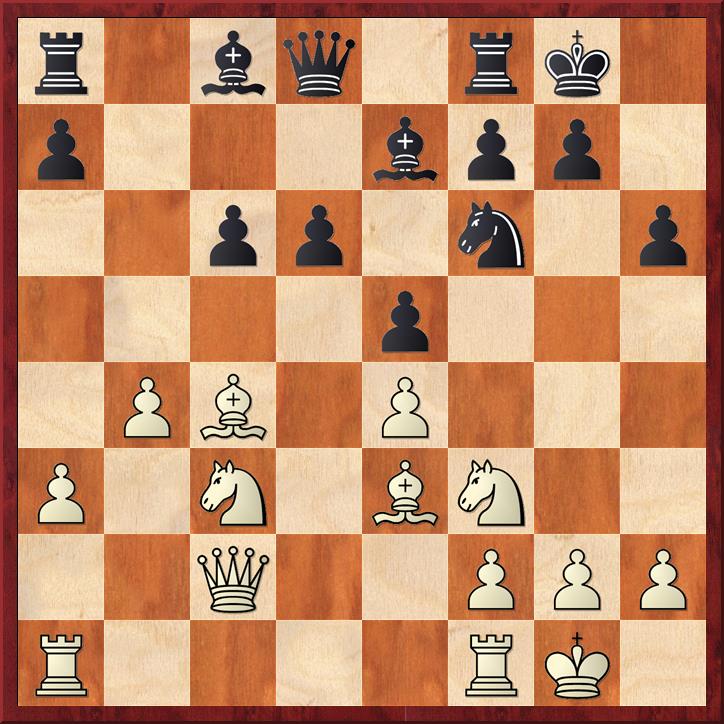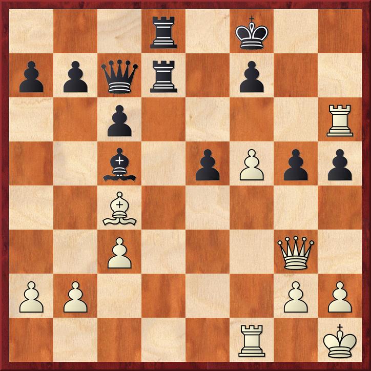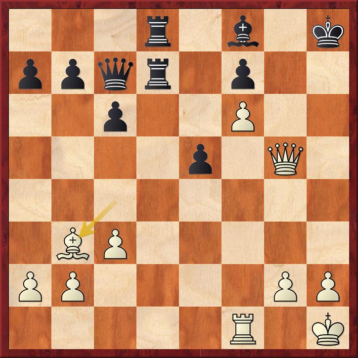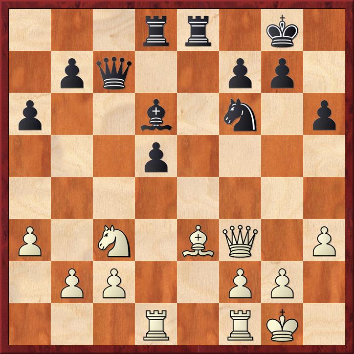 In deze stelling is zwart aan zet en zijn stelling is ongemakkelijk. Er dreigt slaan op d5, Lxh6 is mogelijk. De druk op de zwarte koning is aanwezig. Zwart speelde hier 1… Pe4 en in plaats van het gespeelde 2. Txd5 Pxc3 3. bxc3 wat de damevleugel kwetsbaar maakt, is de stelling van wit beter na 2. Pxd5 Dxc2 3. b4, omdat zwart te weinig hulptroepen bij de koning heeft. Het paard op d5 kijkt gevaarlijk naar veld f6.