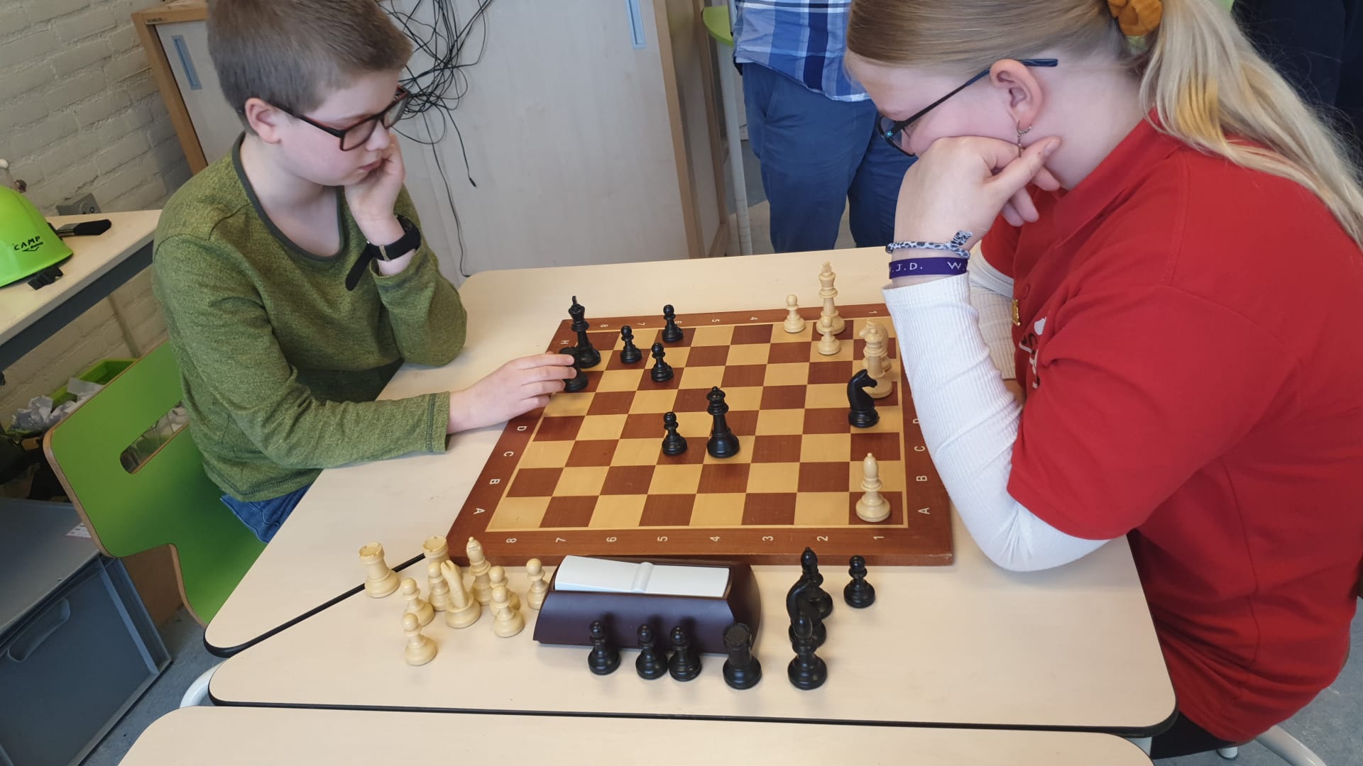 Helaas wist ze de winnende voortzetting niet te vinden. En Joris had vlak daarvoor in gewonnen stelling zijn toren weggegeven. Hierdoor werd het 2-2.