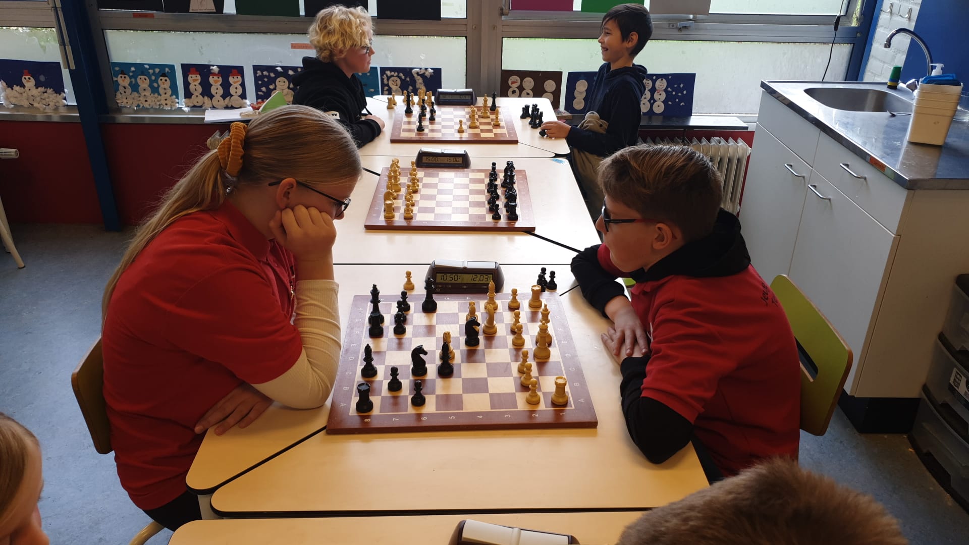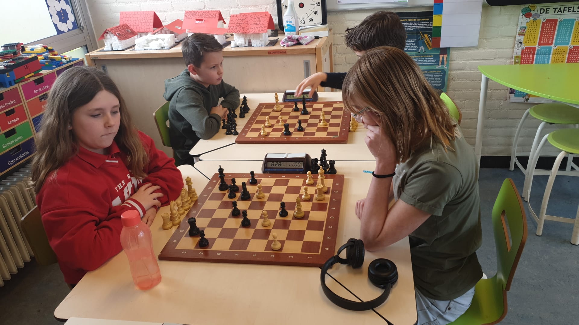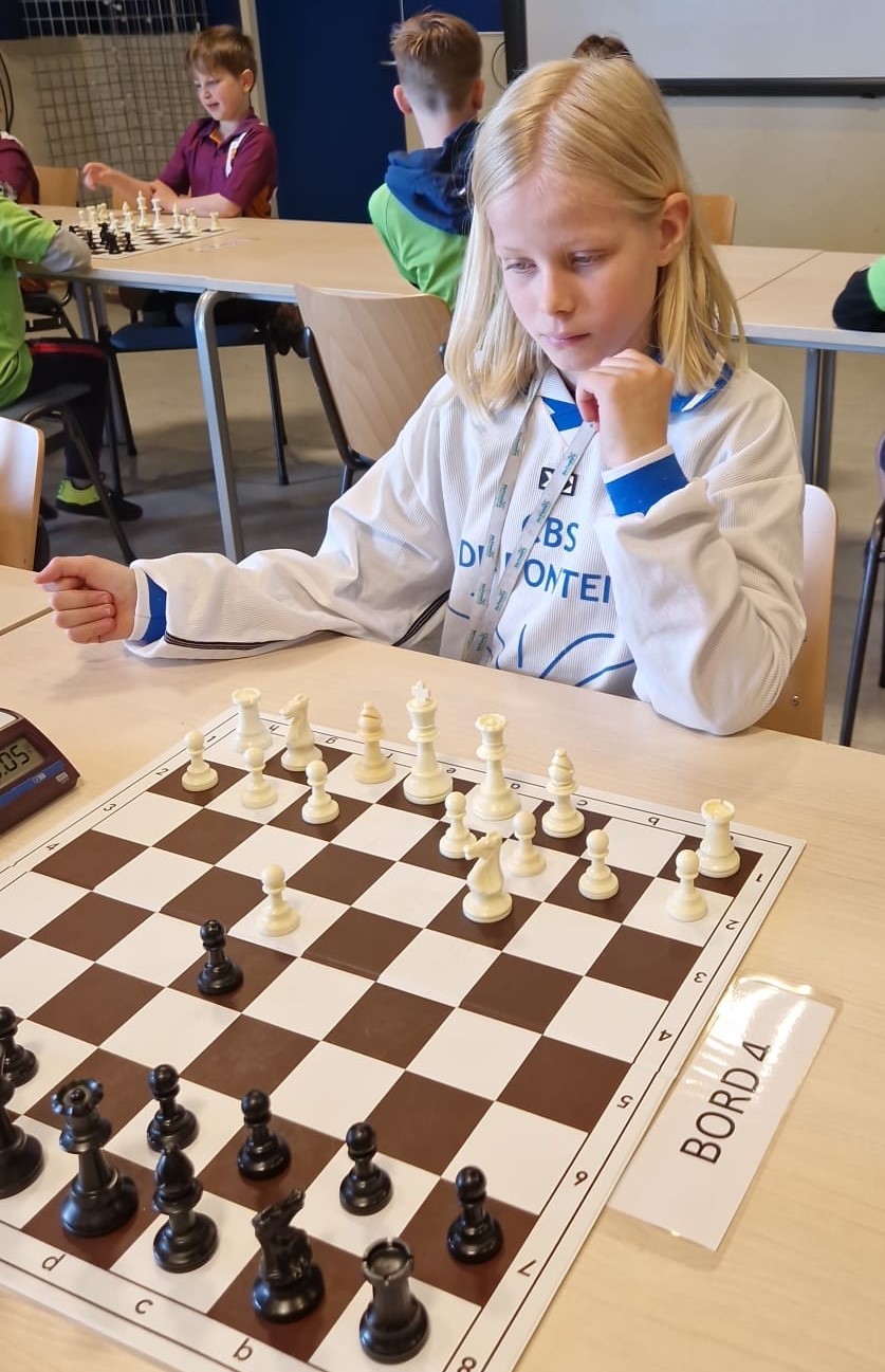 In groep H tenslotte Isa en Lucas. Isa heeft het schaken helemaal ontdekt en begint meteen met een mooie overwinning. Ook Lucas wint.