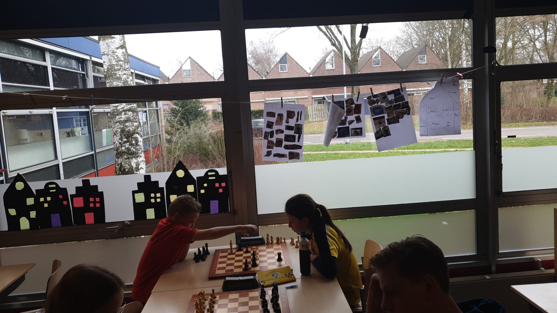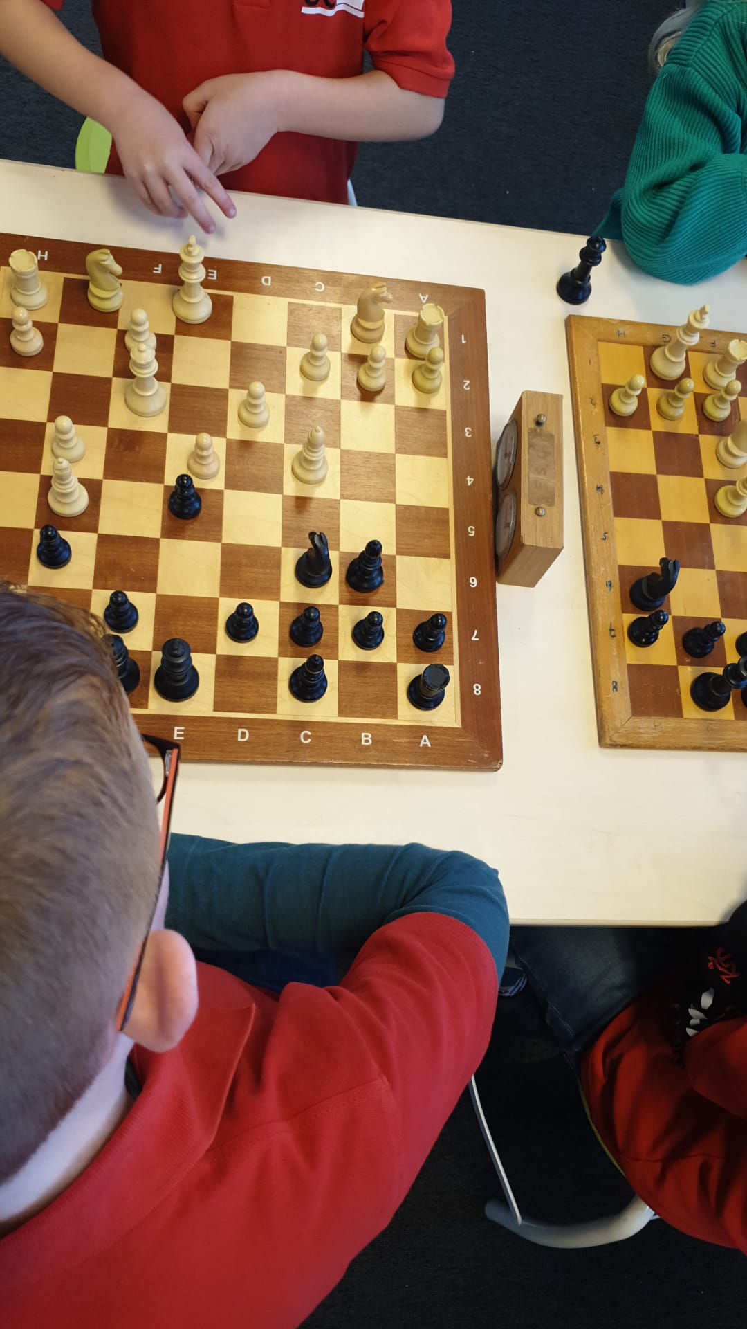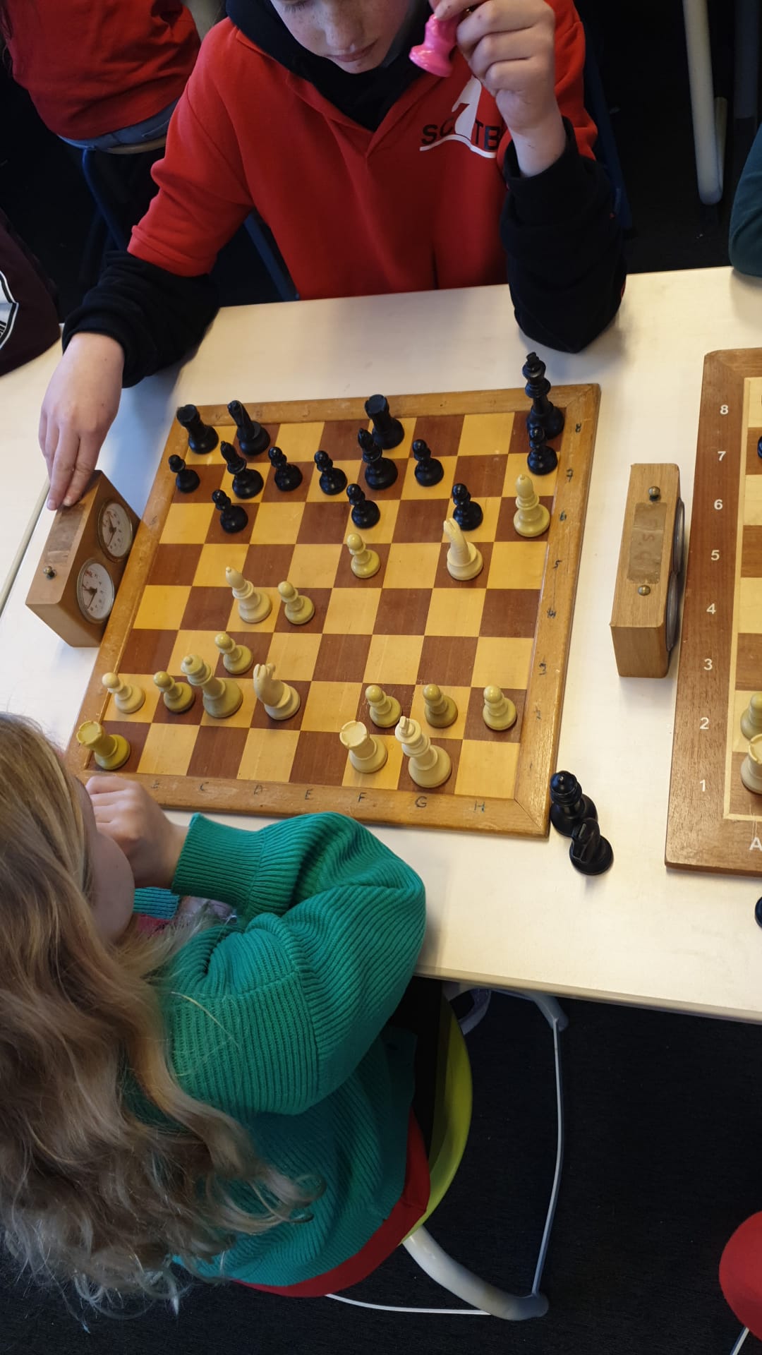In groep H tenslotte Isa en Lucas. Isa heeft het schaken helemaal ontdekt en begint meteen met een mooie overwinning. Ook Lucas wint.