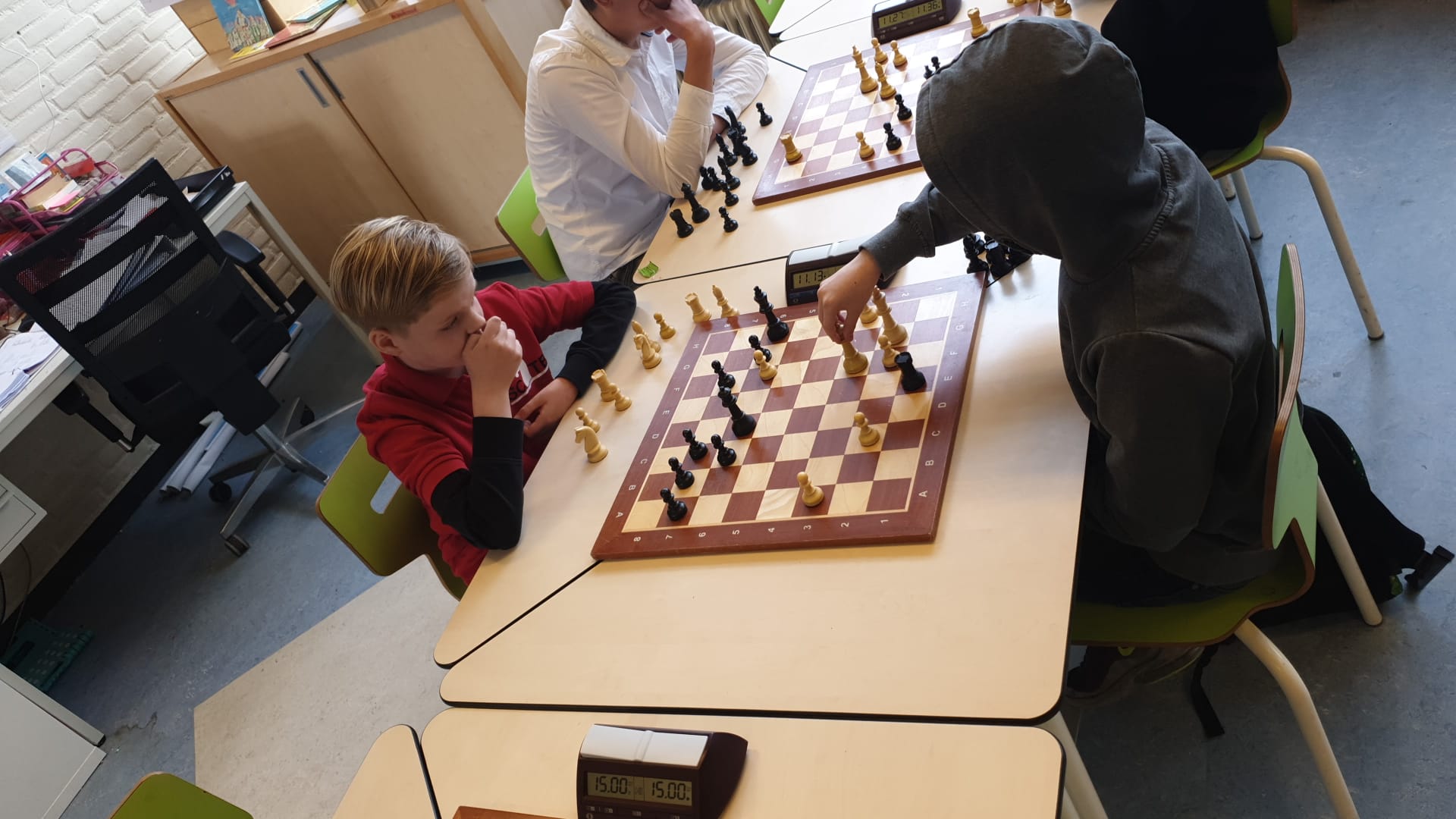 Groep E is het terrein voor Daniël, Mikka en Merijn. Het is geweldig dat Mikka er vandaag bij is. Merijn wint wel van hem maar de punten blijven binnen de club, zullen we maar zeggen. Daniël wint ook.