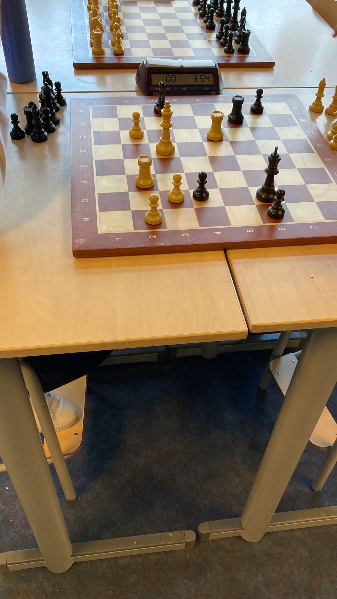 Sarah heeft meteen al een open koningsstelling, maar heeft nog kansen. Ook de eerste foto van een stelling van Jelmer. Meteen een erg boeiend eindspel: