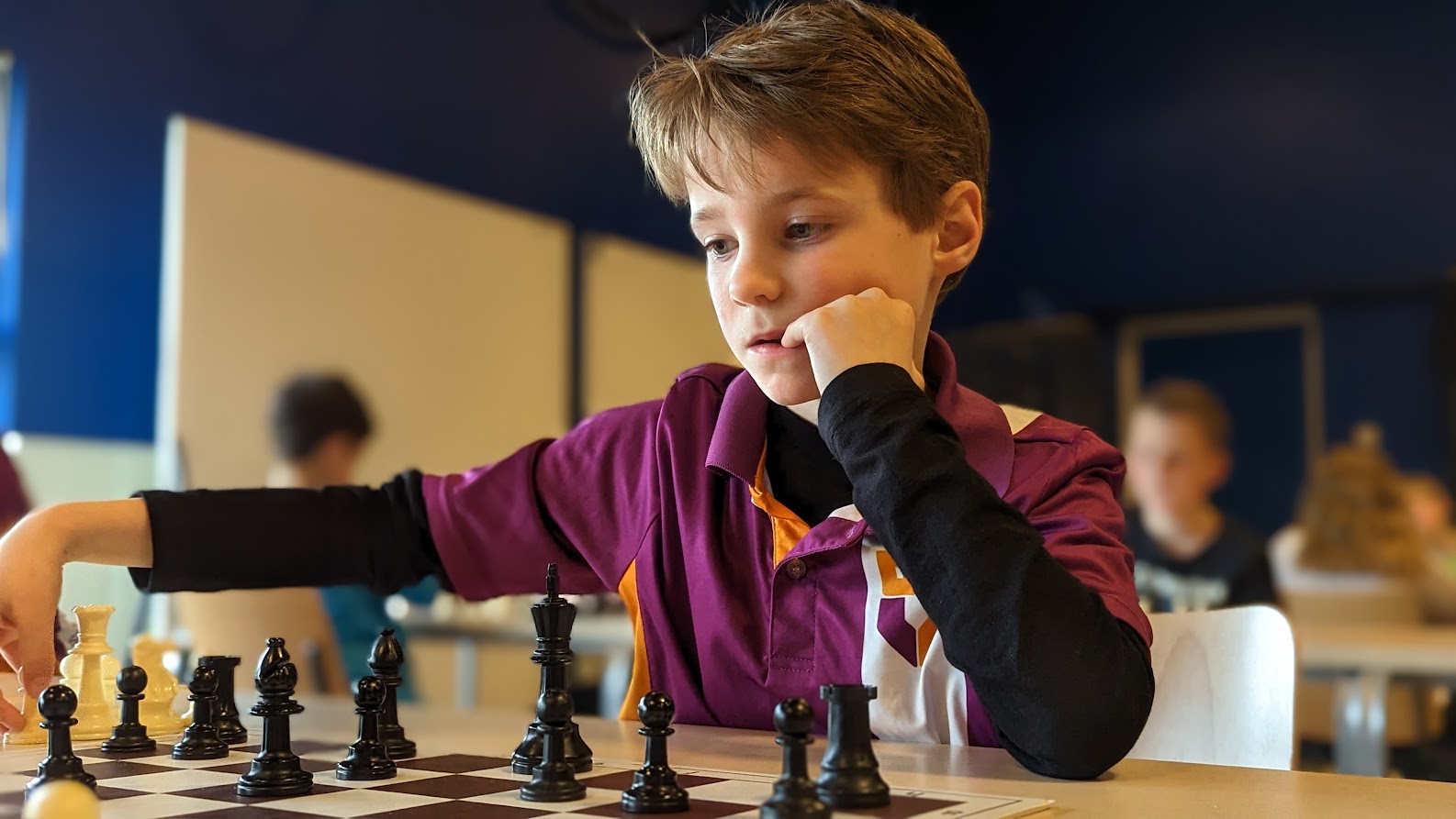 Timo deed het ook erg goed met 3 uit 7. Timo gaat van eigen kracht uit en probeert altijd zo snel mogelijk mat te zetten. Daar wordt hij ook steeds beter in. Verdedigen komt daarna.