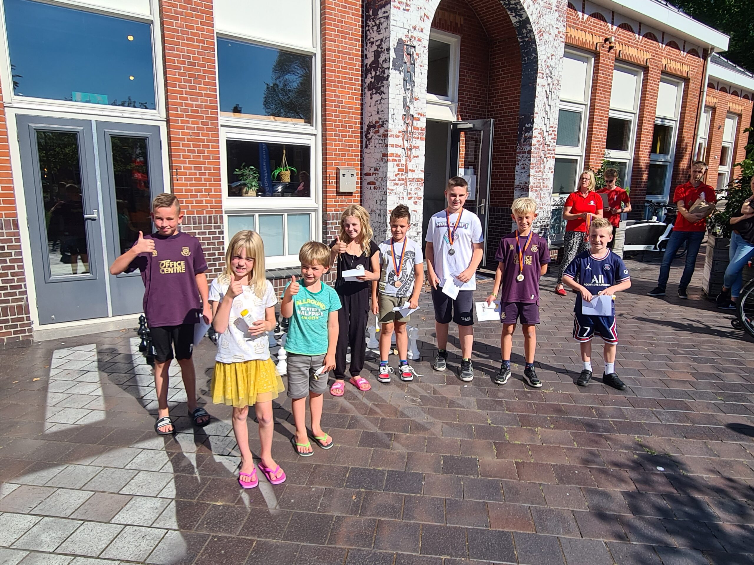 | het podium van het individuele klassement met Thijmen, Hannah, Bram en Noa |