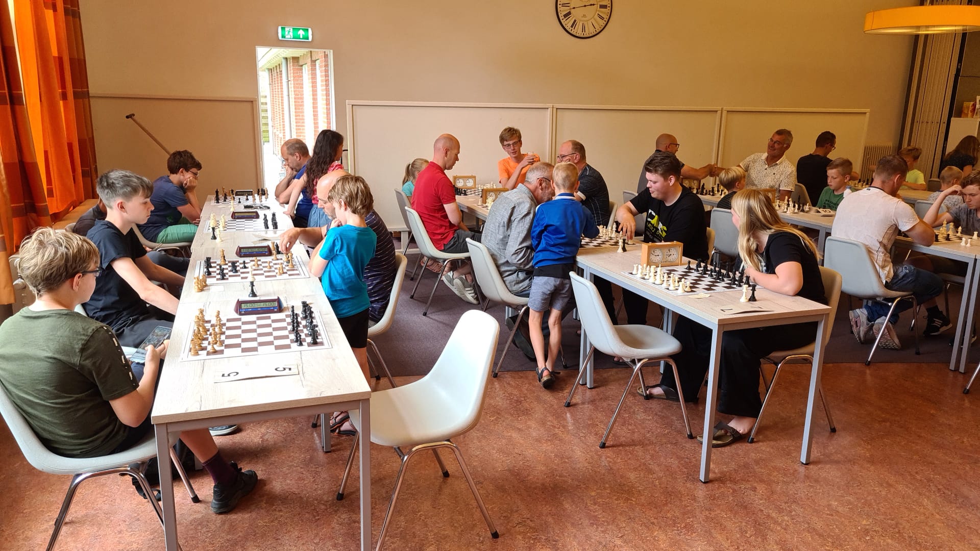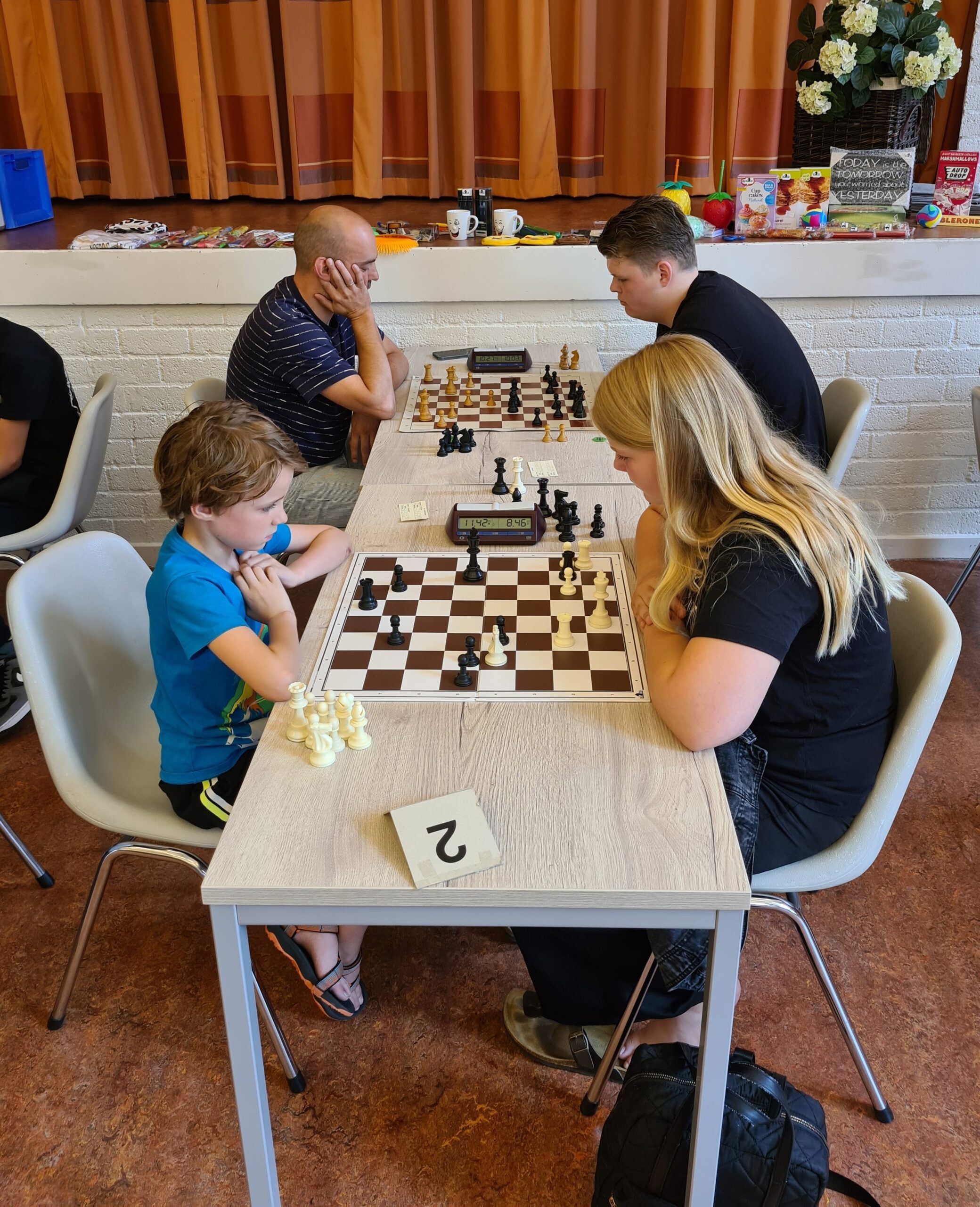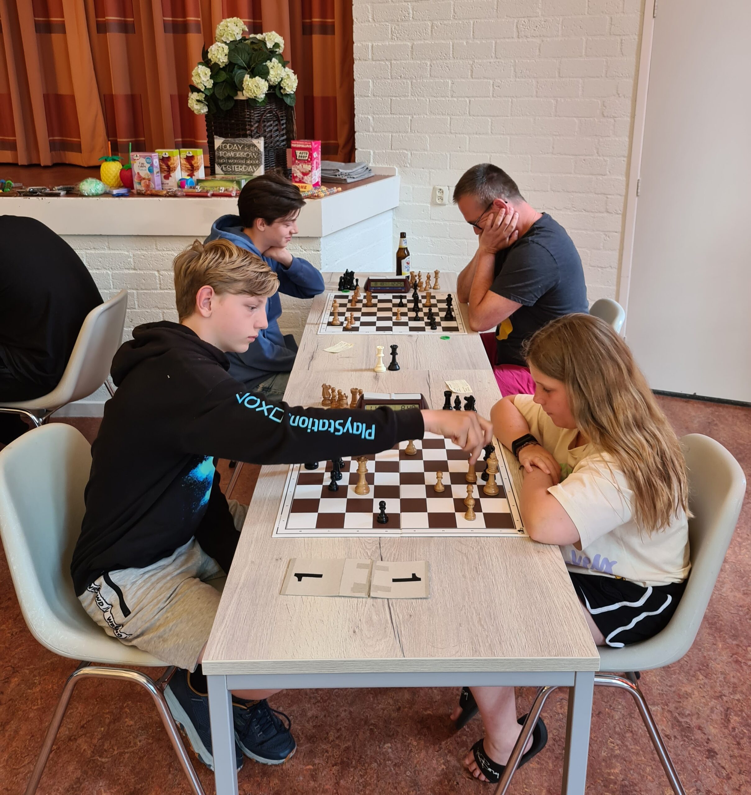 Doel van het toernooi is een leuke middag waarbij we als jeugdclub ook de volwassenen laten zien wat het betekent om te schaken. Dus het gaat niet om het winnen maar om het samenzijn met na afloop samen eten en de prijsuitreiking van het seizoen. We hadden dit op 18 juni gepland maar door het onverwachte succes van de Fontein met een NK-plek op deze zaterdag hebben we het naar 2 juli verplaatst. Met hulp van Femke (deed haar maatschappelijke stage ook meteen), Richard, Dirkjan, Helma, Freddie, Paula, Gerbrich, Roelof en het afgestofte draaiboek uit 2018 was het snel georganiseerd. Heel veel dank voor de organisatie!
