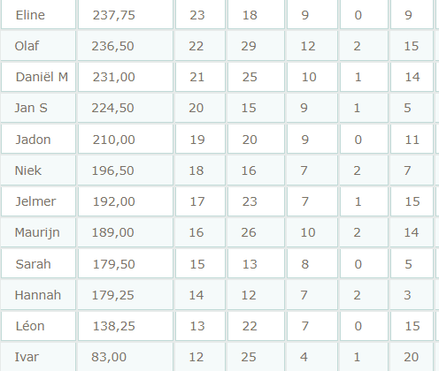 Eline heeft Olaf nipt ingehaald. In de tweede kolom staat het aantal punten volgens het Keizersysteem. Daarna volgt achtereenvolgens: de rangwaarde, het aantal partijen, het aantal keer dat iemand heeft gewonnen, remise gespeeld dan wel verloren. Met deze stand zijn in elk geval Eline, Olaf, Daniël Medendorp, Jan en Jadon in staat elkaar de volgende ronde in te halen.